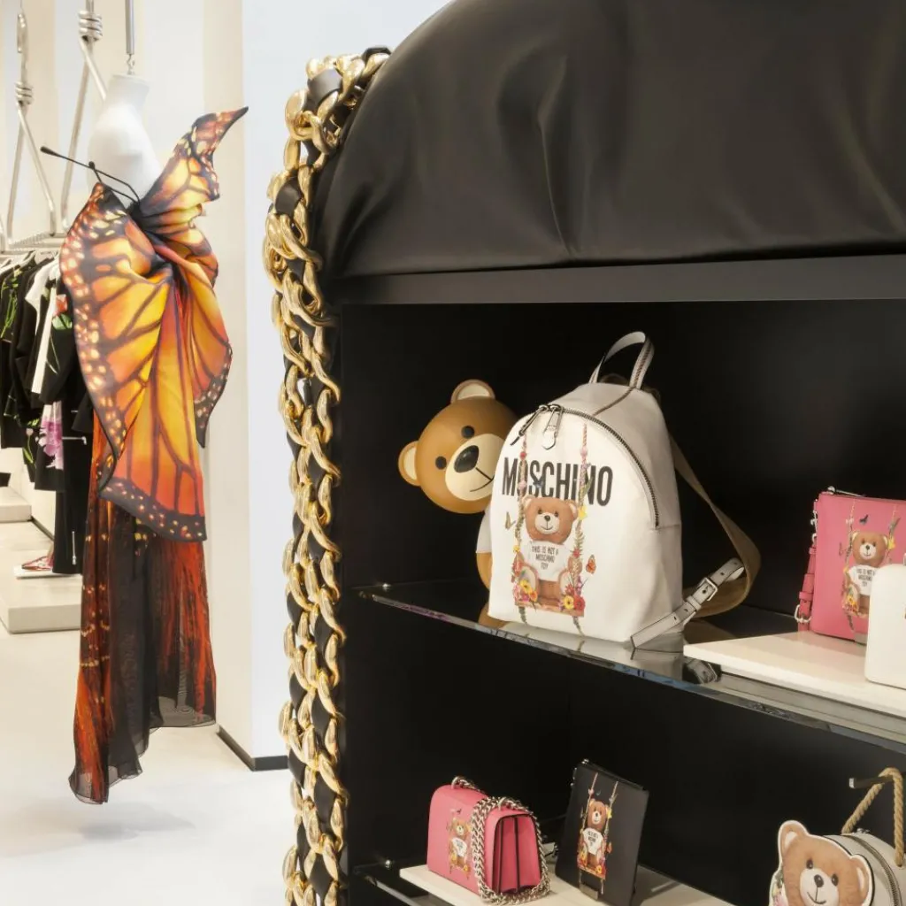 Der Bär besteht aus lackiertem Polyethylen und trägt auf der Vorderseite die Aufschrift: „This is not a moschino toy“..