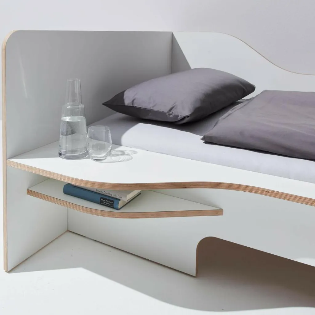 Das einmalige Plane Bett mit Bettkasten ist von dem deutschen Designer Felix Stark für den Hersteller Müller Small Living entworfen worden. Mit dem Plane-Projekt verwirklichte der Nachwuchsdesigner seine Vorstellung von modernen, umweltfreundlichen Möbeln. Die eleganten, weißen Beschichtungen bilden mit den naturbelassenen Kanten des Bettes einen spannenden Kontrast. Mit Ablagen, die in das Bett integriert sind, stellt der Designer die praktische Handhabung und die modernen Anforderungen an ein Bett in den Vordergrund.