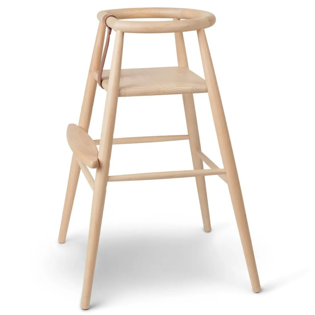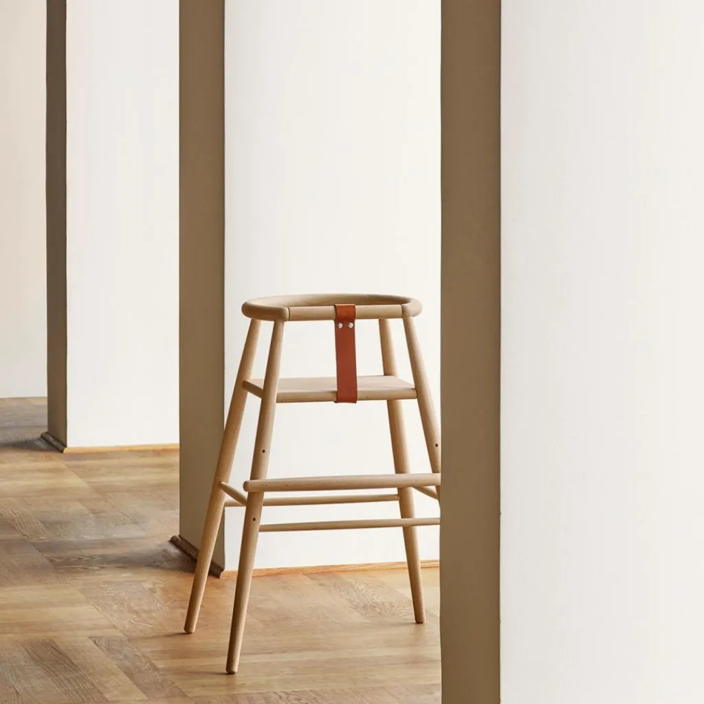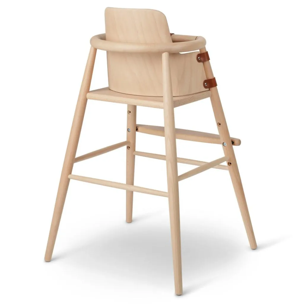 Der ND54 Kinderhochstuhl mit Baby-Einsatz, der 1954 präsentiert wurde, gilt nicht umsonst als ein echter Klassiker: Funktionell und ästhetisch zugleich entspricht er genau den Bedürfnissen von Eltern und Kindern. Das Möbelstück wurde gekonnt auf seine Grundlagen reduziert und gleichzeitig den optischen Ansprüchen eines modernen Interieurs angepasst. Der Hochstuhl mit herausnehmbarer Lehne fügt sich damit optimal in Ihr Esszimmer ein und harmoniert perfekt mit dem Interieur Ihres Zuhauses. Der puristisch gestaltete ND54 Kinderhochstuhl mit Baby-Einsatz ist aus transparent lackierter Buche gefertigt und besitzt praktische Riemen aus braunem Kernleder. Er ist 70,5 cm hoch und hat eine Sitzfläche von 51 cm in der Breite und 52 cm in der Tiefe. Die vier Beine sind auseinandergespreizt, sodass eine erhöhte Standfestigkeit des Hochstuhles gewährleistet wird. Sämtliche Elemente des Möbelstücks wie etwa die Fußstütze oder die Armlehnen sind abgerundet und damit perfekt an die Sicherheitsanforderungen für Kinder bis 3 Jahre oder bis zu einem Gewicht von 15 kg angepasst. Im Lieferumfang finden Sie zudem drei Schilder aus Edelstahl, in die Sie den Namen der Kinder gravieren können, die den Stuhl benutzt haben. Denn der Hochstuhl kann über Generationen weitergegeben werden.