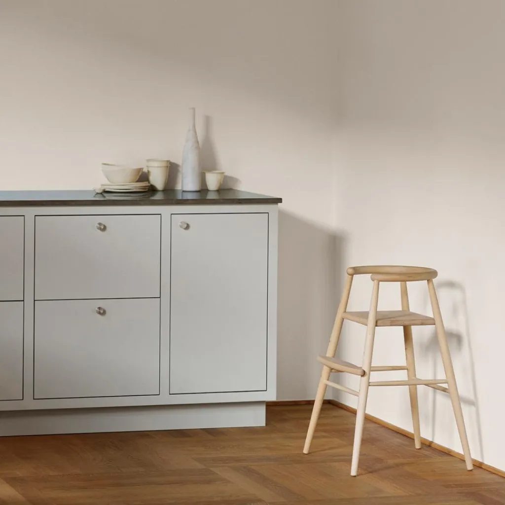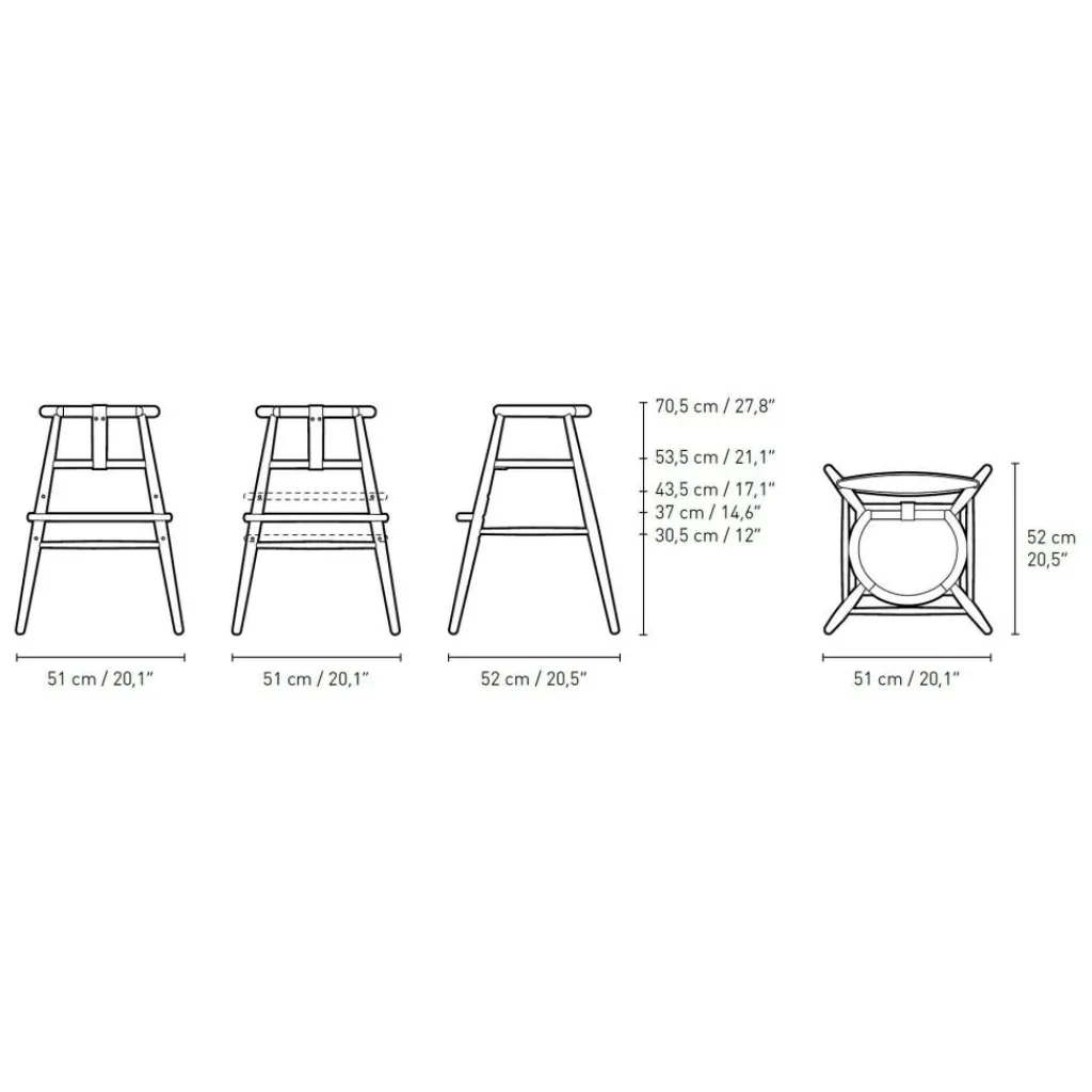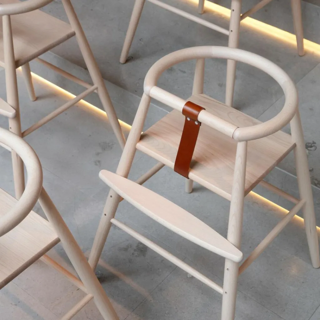 Der ND54 Kinderhochstuhl mit Baby-Einsatz, der 1954 präsentiert wurde, gilt nicht umsonst als ein echter Klassiker: Funktionell und ästhetisch zugleich entspricht er genau den Bedürfnissen von Eltern und Kindern. Das Möbelstück wurde gekonnt auf seine Grundlagen reduziert und gleichzeitig den optischen Ansprüchen eines modernen Interieurs angepasst. Der Hochstuhl mit herausnehmbarer Lehne fügt sich damit optimal in Ihr Esszimmer ein und harmoniert perfekt mit dem Interieur Ihres Zuhauses. Der puristisch gestaltete ND54 Kinderhochstuhl mit Baby-Einsatz ist aus transparent lackierter Buche gefertigt und besitzt praktische Riemen aus braunem Kernleder. Er ist 70,5 cm hoch und hat eine Sitzfläche von 51 cm in der Breite und 52 cm in der Tiefe. Die vier Beine sind auseinandergespreizt, sodass eine erhöhte Standfestigkeit des Hochstuhles gewährleistet wird. Sämtliche Elemente des Möbelstücks wie etwa die Fußstütze oder die Armlehnen sind abgerundet und damit perfekt an die Sicherheitsanforderungen für Kinder bis 3 Jahre oder bis zu einem Gewicht von 15 kg angepasst. Im Lieferumfang finden Sie zudem drei Schilder aus Edelstahl, in die Sie den Namen der Kinder gravieren können, die den Stuhl benutzt haben. Denn der Hochstuhl kann über Generationen weitergegeben werden.
