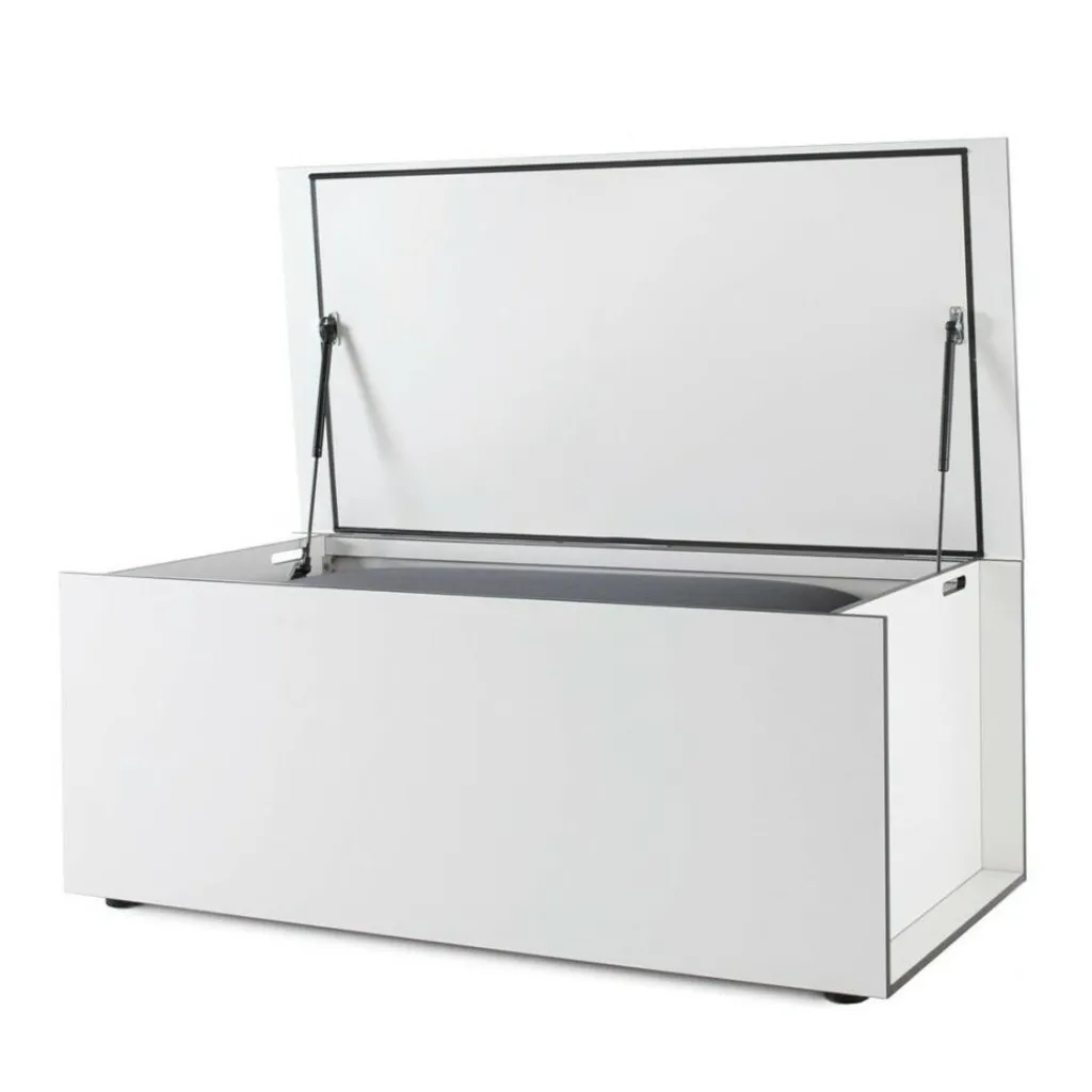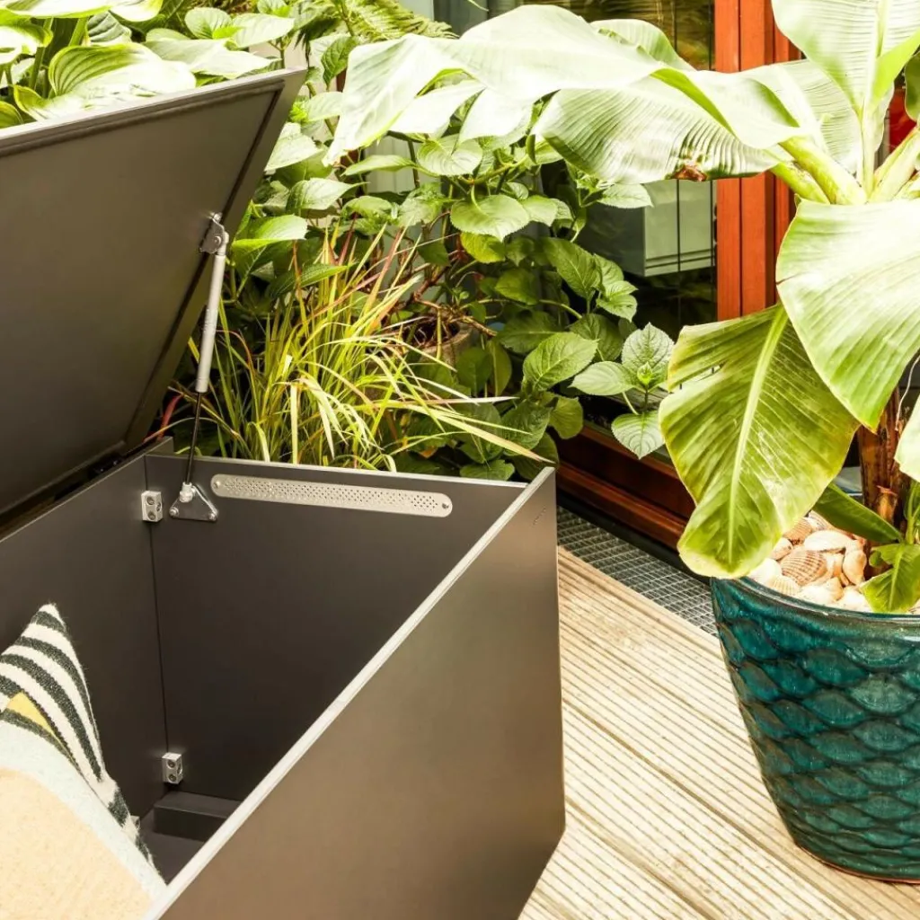 Die El Pecho Kissentruhe L ist ein Paradebeispiel für schlichte Eleganz in gut ausgedachtem Format. Die geradlinige, rechteckige Form in den Maßen Länge: 180 cm, Breite: 90 cm, Höhe: 75 cm wird durch abgerundete Ecken und schräge Verläufe der Kanten aufgewertet. Eine ausgeklügelte Konstruktion mit Gasdruckfedern sorgt für komfortables Öffnen und Schließen und verhindert, dass der Deckel überschlägt. Die Machart aus stabilem HPL-Kunststoff macht die Truhe zu einem Blickfang sowohl im Innen- als auch im Außenbereich. Durch ein gut funktionierendes Belüftungssystem können zu allen Jahreszeiten bedenkenlos Kissen, Decken und Auflagen verstaut werden, ohne unangenehme Gerüche anzunehmen.