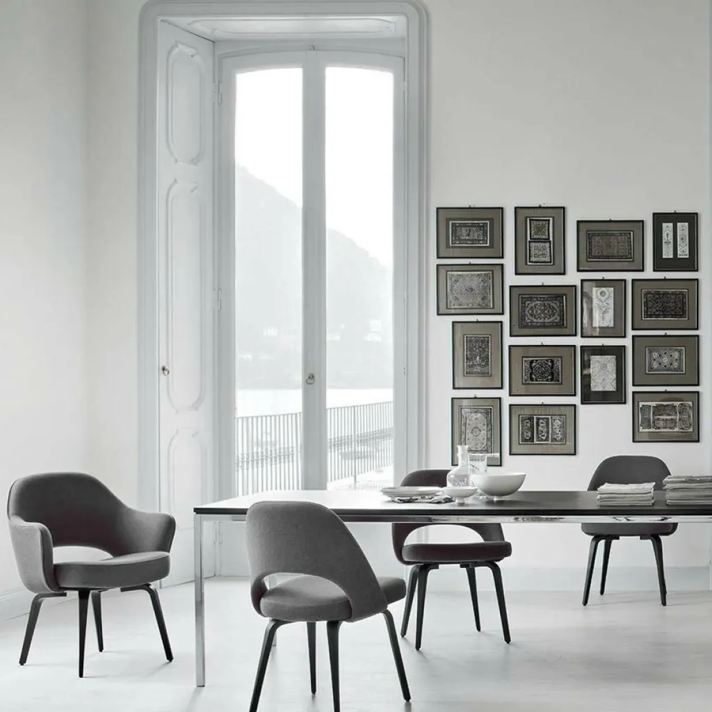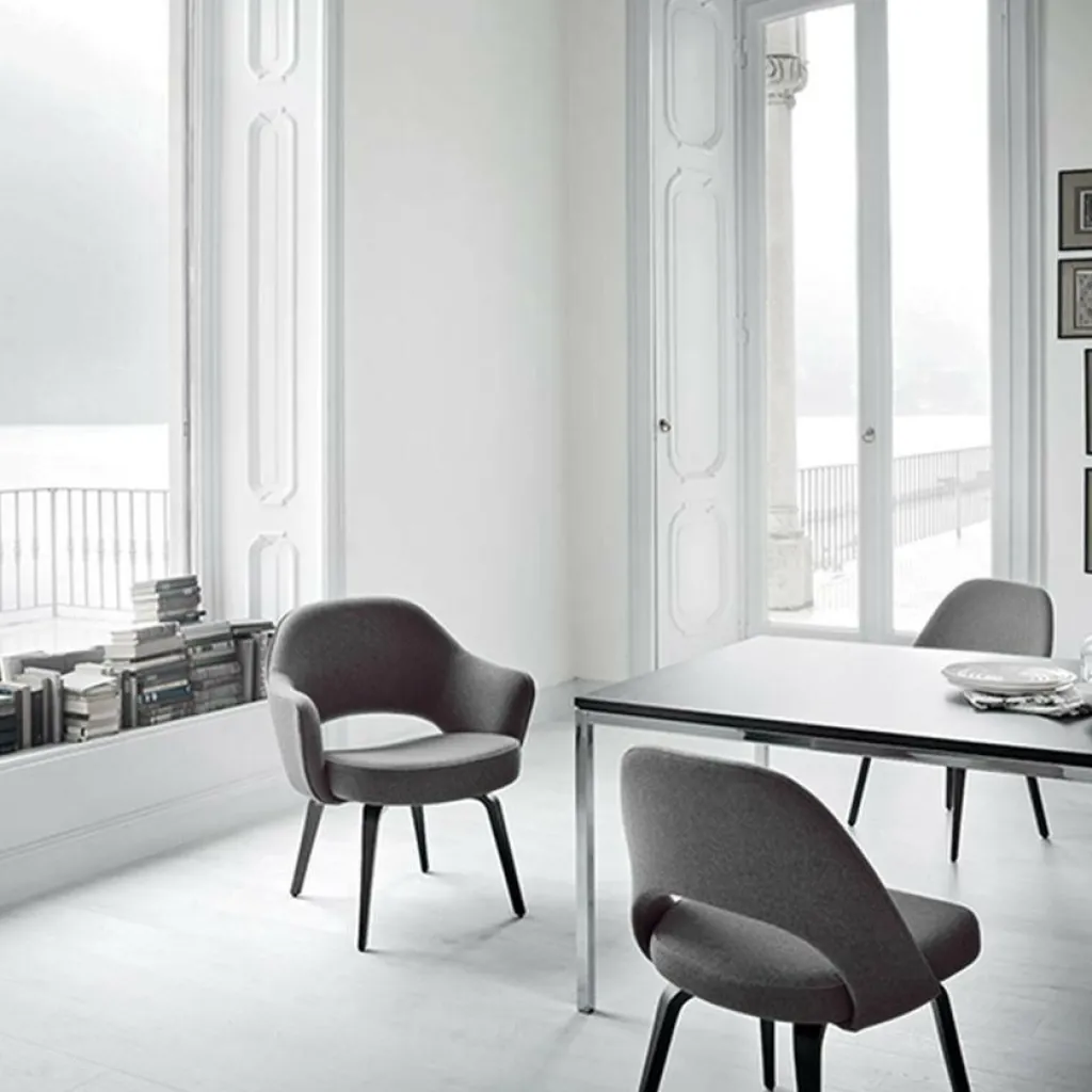 Der Saarinen Conference Armlehnstuhl Gestell Eiche wurde von Eero Saarinen für den Hersteller Knoll International entworfen. Der Designer, der auch gleichzeitig als Architekt arbeitete, entwarf diesen Armlehnstuhl im Jahr 1951. Die Designgestaltung basiert auf dem Organic Chair, der bereits 1940 entwickelt wurde. Heutzutage ist der Conference Armlehnstuhl von Saarinen ein Designklassiker für den privaten und geschäftlichen Bereich.