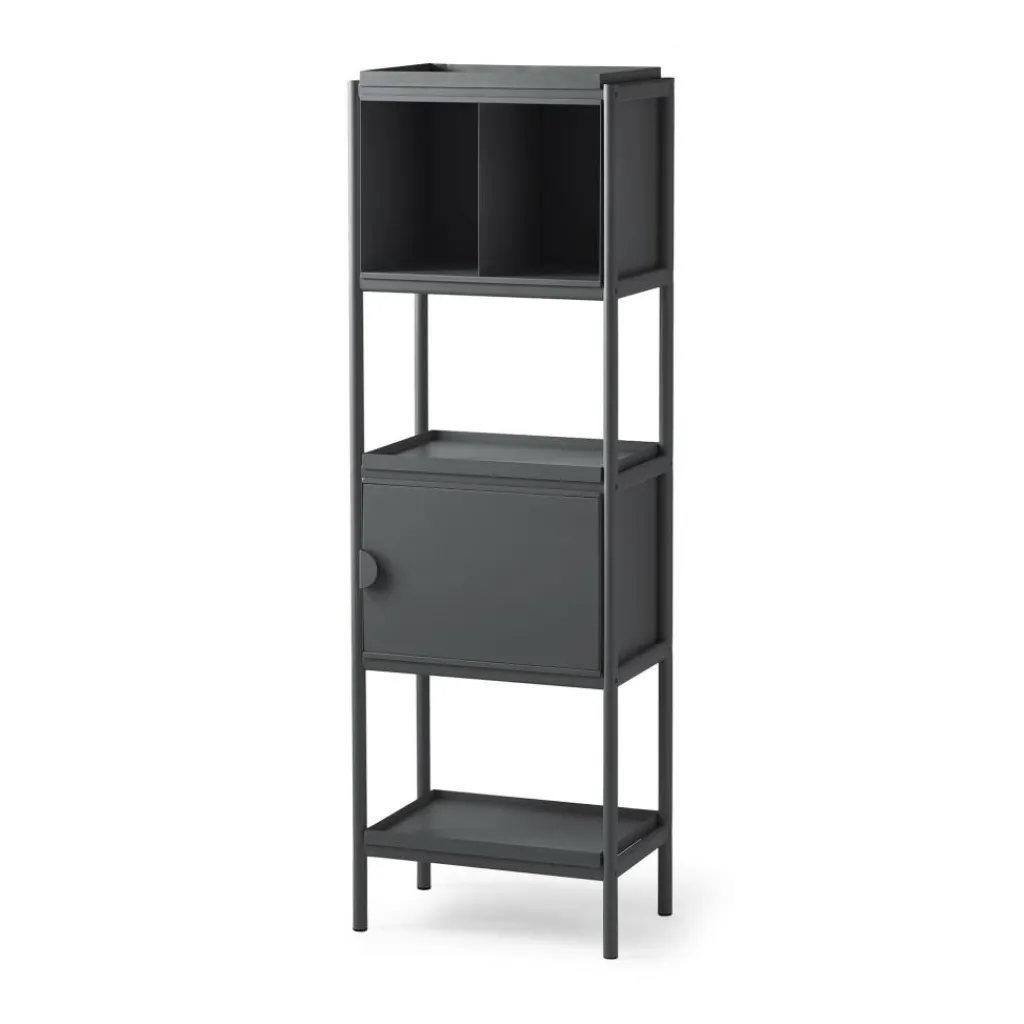 Der Toss Schrank LxBxH 58,9x38x182 cm ist klug konzipiert. Ein Rahmen aus Metallrohr sorgt für sicheren Stand. Unten gibt es ein Einlagebrett. Das Element darüber ist als Schrank mit einer Tür gestaltet. Der Griff ist halbrund. Auf dem Schrank ist Platz, um weitere Utensilien abzustellen. Der oberste Teil des Toss Schranks LxBxH 58,9x38x182 cm ist eine Box mit einer vertikalen Unterteilung. In diesem Element stehen Bücher sicher. Der Toss Schrank LxBxH 58,9x38x182 cm wird aus pulverbeschichtetem Metall gemacht, und die Elemente lassen sich individuell anordnen. Das praktische Möbelstück ist für eine lange Lebensdauer konzipiert. Sollten Einzelteile kaputt gehen, kann man sie austauschen.
