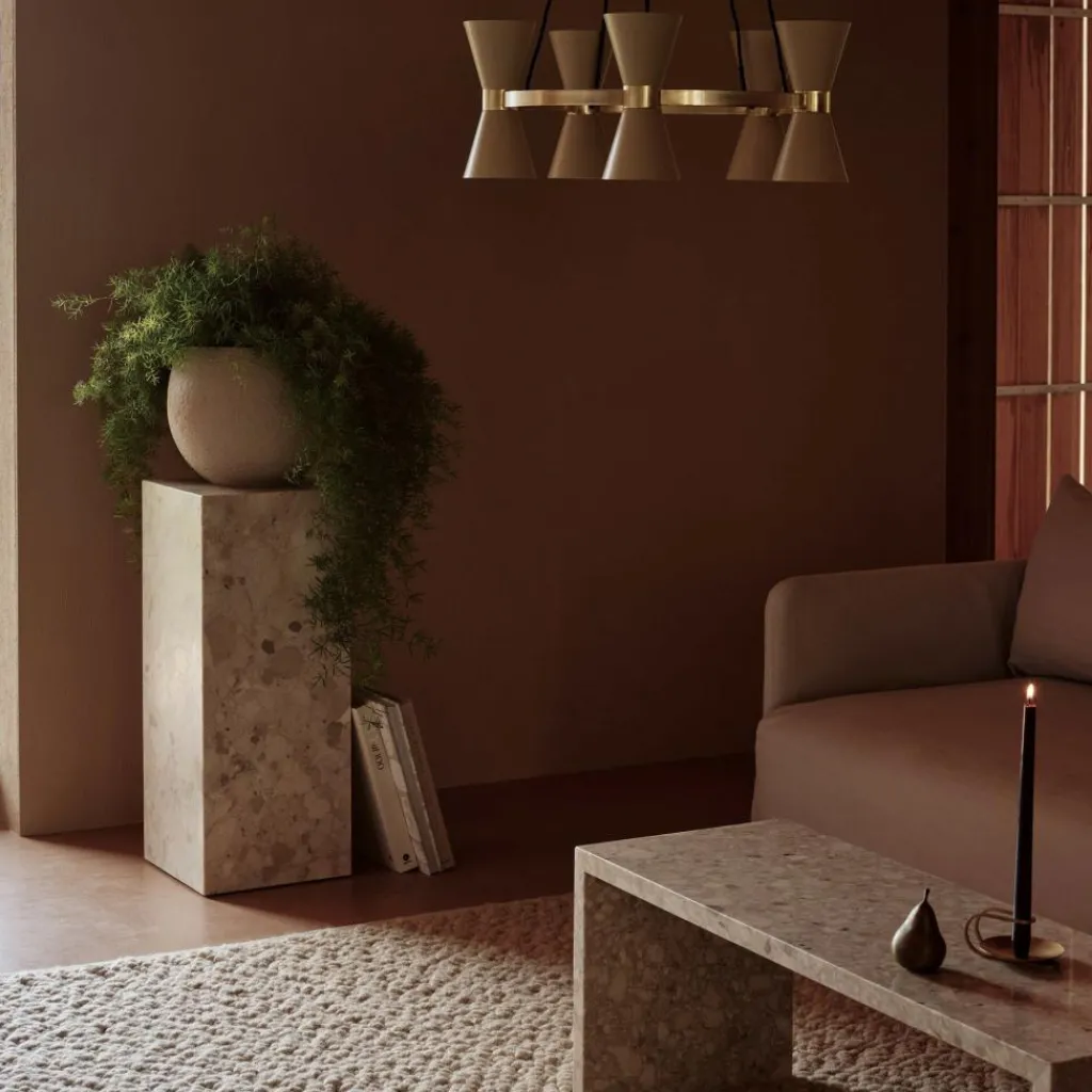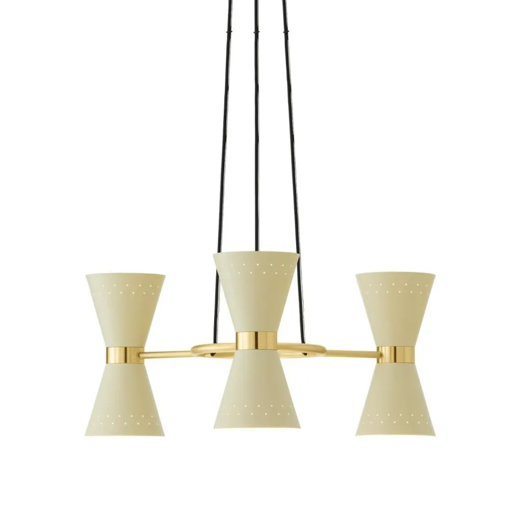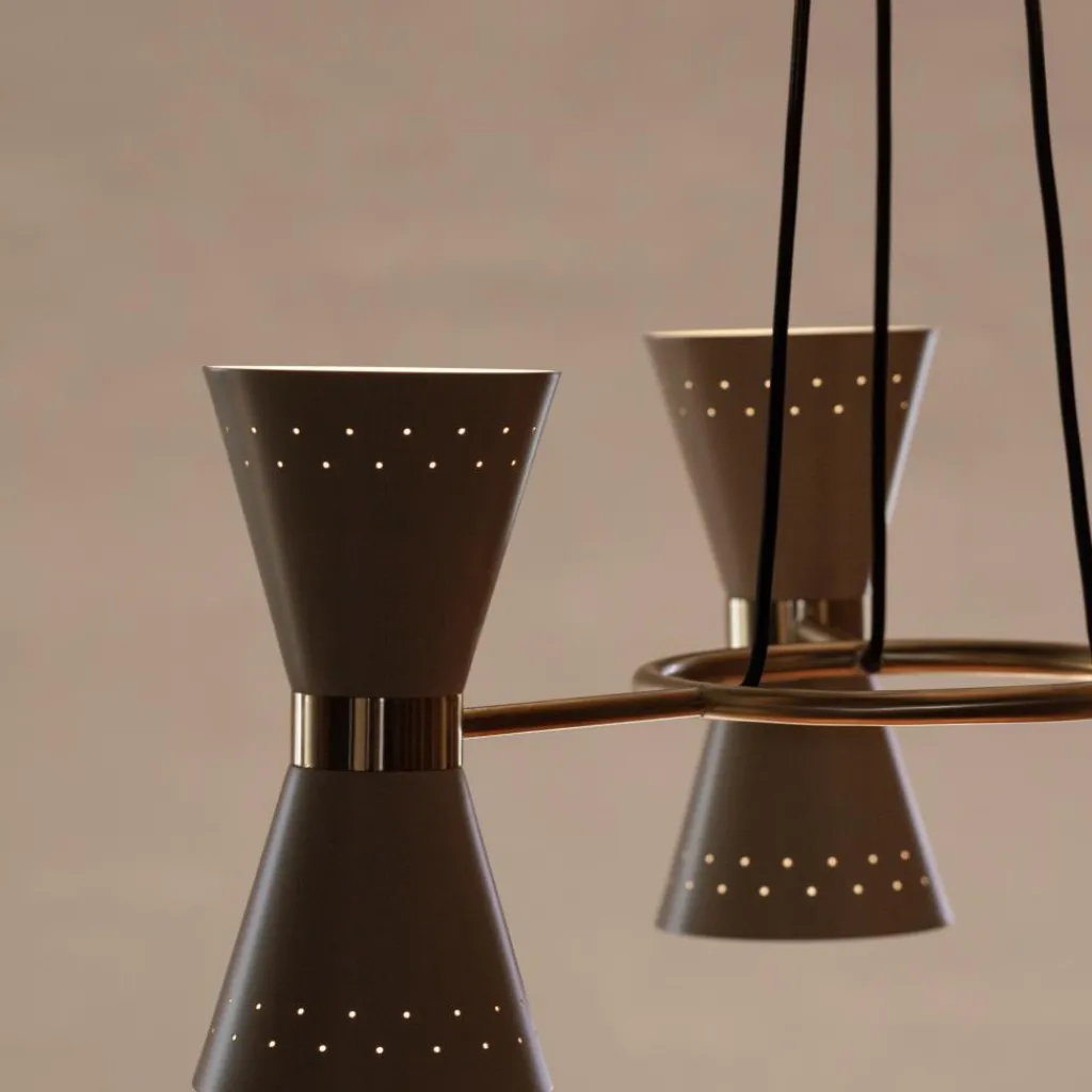 Der Collector 3 Kronleuchter wird über dem Esstisch im Wohn- oder Esszimmer aufgehängt zum Blickfang. Er macht auch im Restaurant oder in stilvollen Büros eine gute Figur. Zum Hingucker werden die drei Leuchtenschirme: Sie bestehen aus konischen Elementen, die in der Mitte von einem schmucken Ring aus Messing zusammengehalten werden. Die Lichtstrahlen treten unten und oben aus den Leuchtschirmen aus. Darüber hinaus sind die beiden Elemente an ihrer breiteren Seite durchlöchert. So zaubern die darin befestigten Leuchtmittel schöne Muster in den Raum. Die Collector 3 Kronleuchter braucht sechs Leuchtmittel mit GU10-Fassung. Die Leuchtkörper sind auf einem edlen Messinggestell montiert. Die Mitte bildet ein Ring, von dem drei Stäbe zu den Schirmen führen. Die Schirme sind aus Aluminium gefertigt.