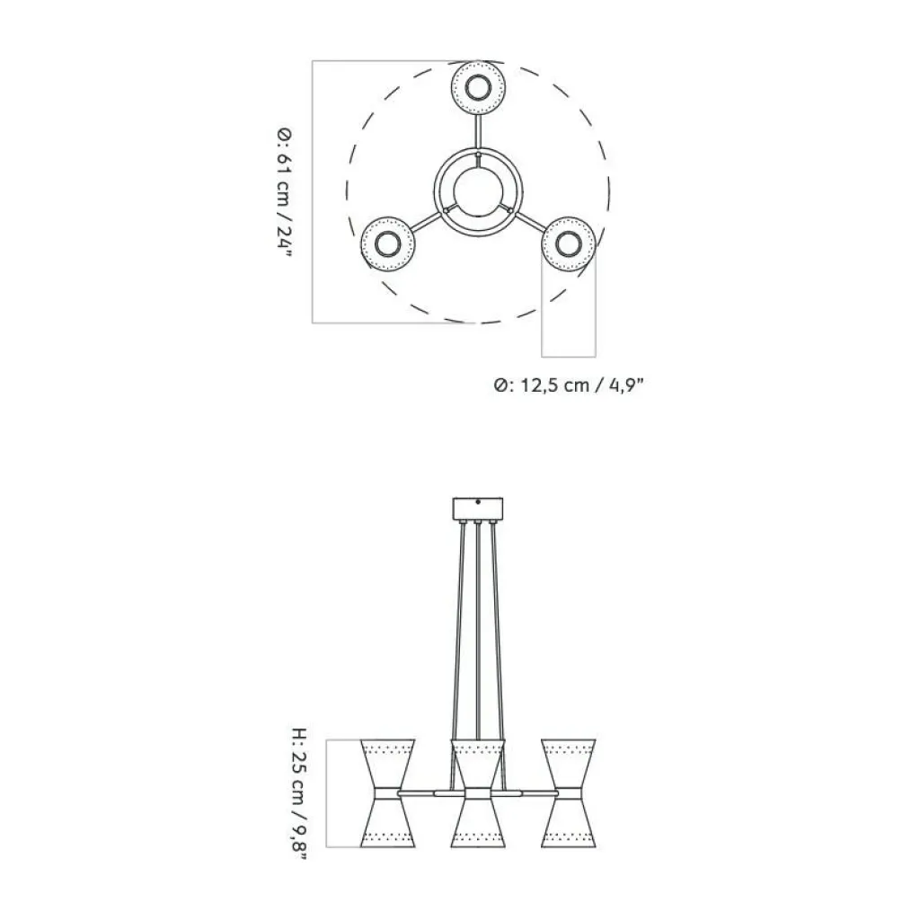 Zur Deckenbefestigung dient eine Rosette aus Stahl und Messing. Sie hat einen Durchmesser von 11,5 cm. Das PVC-Kabel ist 400 cm lang. Die Collector 3 Kronleuchter hat ein Gewicht von 2,2 kg. Die Leuchtenschirme sind jeweils 25 cm hoch. Der Gesamtdurchmesser der Leuchte beträgt 61 cm.