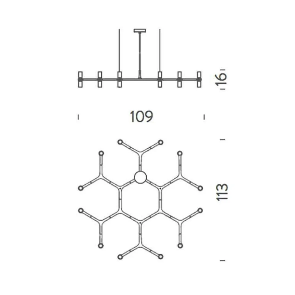 Selbst wenn er gerade nicht eingeschaltet ist, wird der Crown Plana Minor Kronleuchter zum Blickfang in jedem Raum. Im privaten Bereich sorgt er im Wohn- oder Esszimmer für elegantes Flair, auch in Hotellobbys und Restaurants ist er zu sehen. Der Name, der übersetzt ‚kleine, flache Krone‘ bedeutet, charakterisiert das Design perfekt. Das Gestell mit wabenförmiger Struktur besteht aus Stahl. Es setzt sich zu 4 Hexagonen zusammen, aus denen jeweils 2 Äste entspringen. Bestückt ist das Gestell mit 12 Leuchtmitteln mit G9-Fassungen. Sie können unter Zubehör mitbestellt werden. Eingesetzt werden die Leuchtmittel in röhrenförmigen Leuchtenschirmen aus Glas. Genau wie bei einem traditionellen Kronleuchter stehen die Zylinder frei. Somit dringt das Licht von allen Seiten in den Raum.