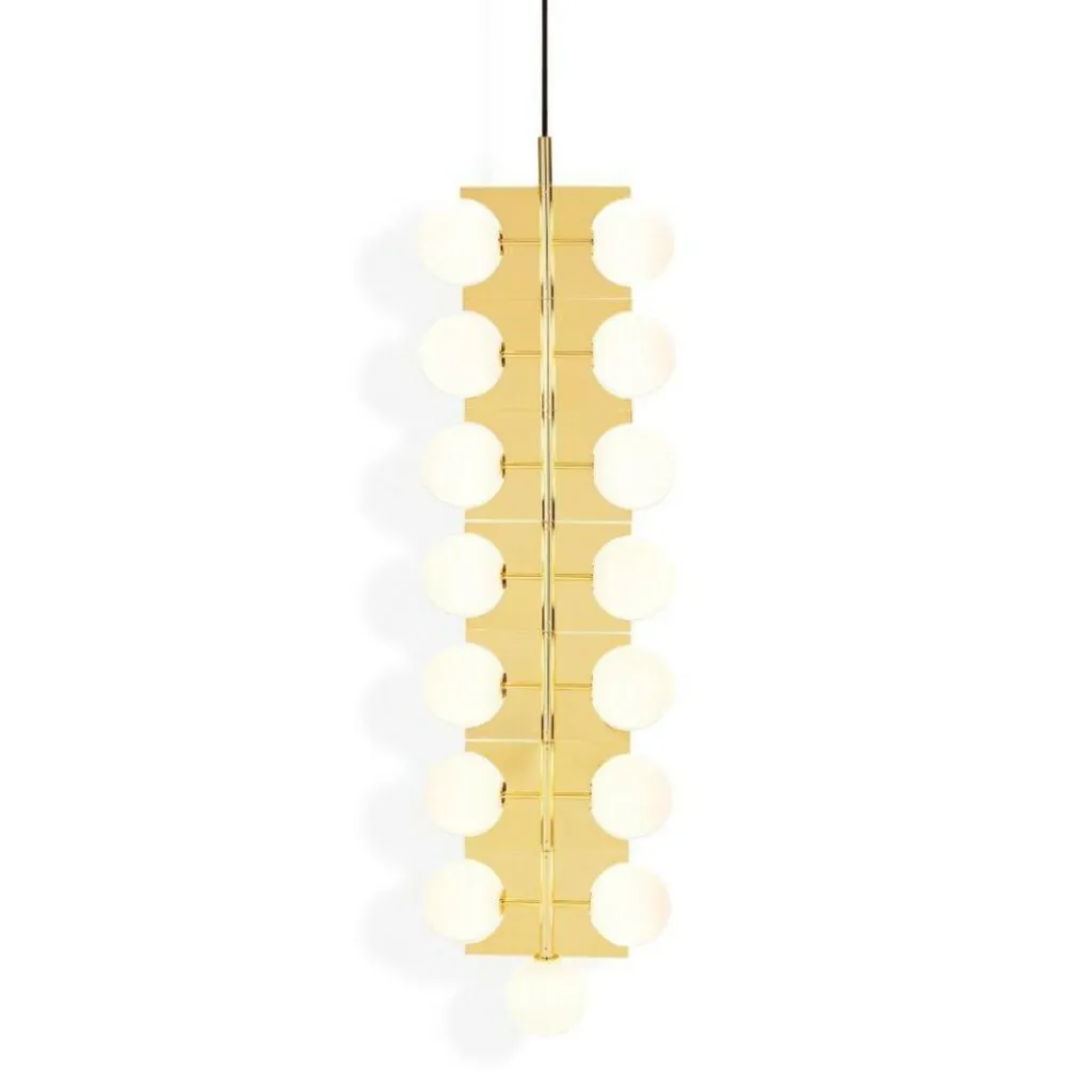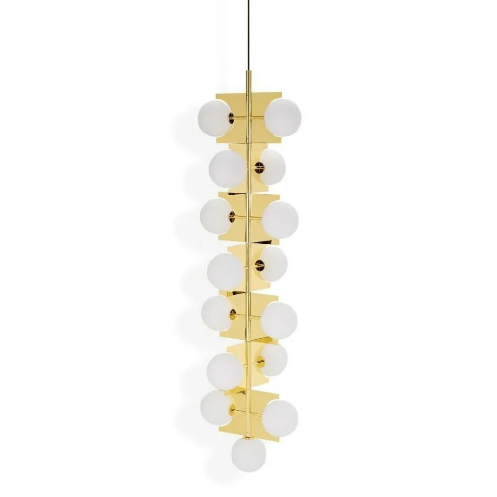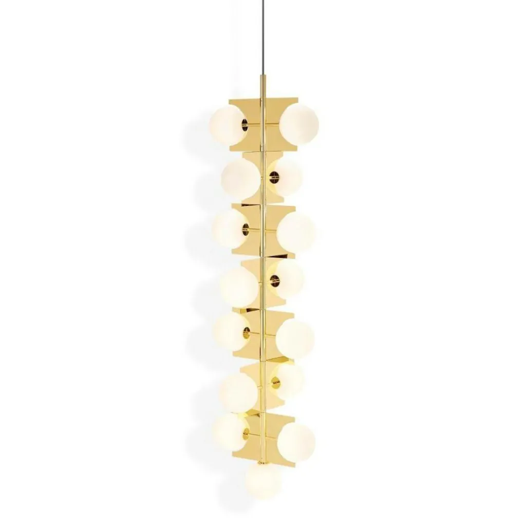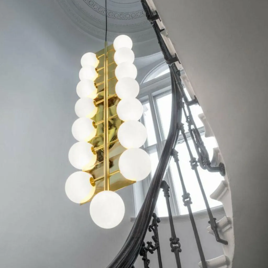 Ideal geeignet ist der aus 15 doppelschichtigen Glaskugeln bestehende Plane Drop Kronleuchter für den Einsatz in Räumen mit hohen Decken, insbesondere in Treppenhäusern, Atrien und Foyers. Die weißen Glaskugeln des extravagant gestalteten Leuchters verteilen sich über sieben rotierende Ebenen. Sie strahlen das Licht in alle Richtungen ab. Gemeinsam mit dem messingbeschichteten Rahmen aus Stahl sind die Kugeln perfekt dazu geeignet, mysteriöse optische Täuschungen zu erzeugen.
