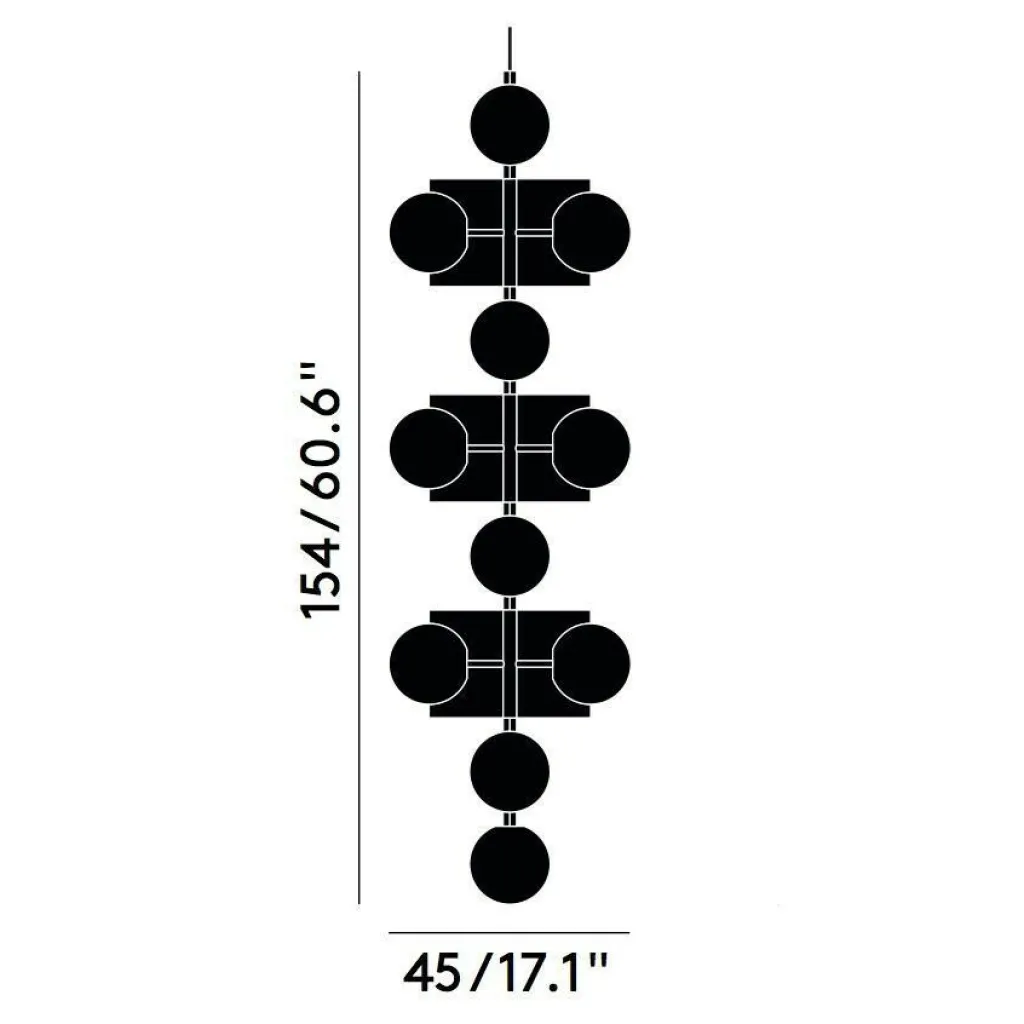 Durch die Abhängungslänge von 250 cm lässt sich der Leuchter mit seinen Abmessungen von 45 x 45 x 160 cm in hohen Räumen weit von der Decke entfernt aufhängen. Als Lichtquellen dienen 15 Halogen-Pins G9 mit einer Gesamtleistung von 25 Watt, die nicht im Lieferumfang enthalten sind.