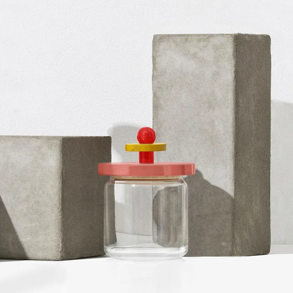 Das Alessi100 ES16 Vorratsglas 75cl wurde von Ettore Sottsass entworfen. 1989 kreiert blieb der Entwurf seither unveröffentlicht. Anlässlich des 100-jährigen Jubiläums der Marke Alessi wird das dekorative Designstück als Teil einer Jubiläumskollektion aufgelegt. Deren Bezeichnung Twergi bedeutet übersetzt Kobold und nimmt auf das gewitzte Design sowie die kräftigen Farben Bezug.