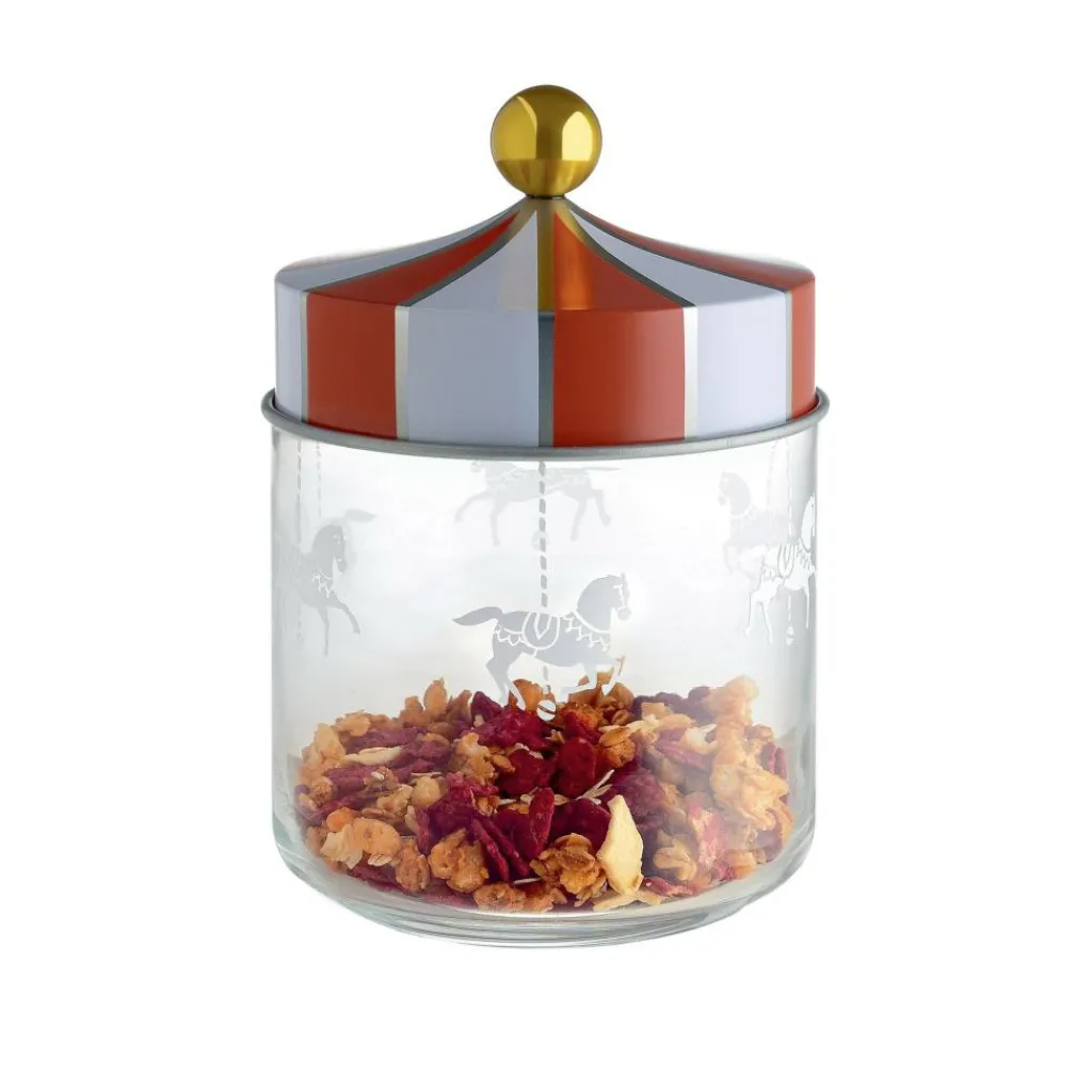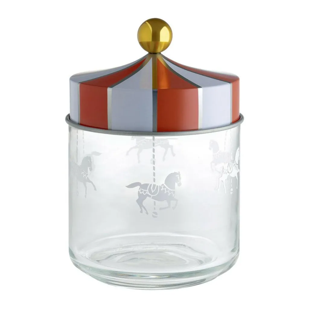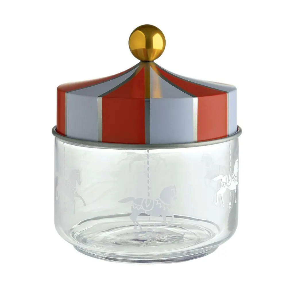 Die Circus Küchendose wurde von Marcel Wanders für den Hersteller Alessi entworfen. Die durchsichtigen Dosen aus Glas mit dem bunt gestreiften und spitz zulaufenden Deckel aus Weißblech sind Teil der Circus Kollektion, die exklusiv für und in enger Zusammenarbeit von Marcel Wanders mit dem italienischen Design-Label Alessi entstanden ist. Marcel Wanders thematisiert in der Kollektion seine Faszination für den farbenfrohen Zirkus und seine quirligen Akteure im Design dieser fröhlichen Küchenaccessoires.