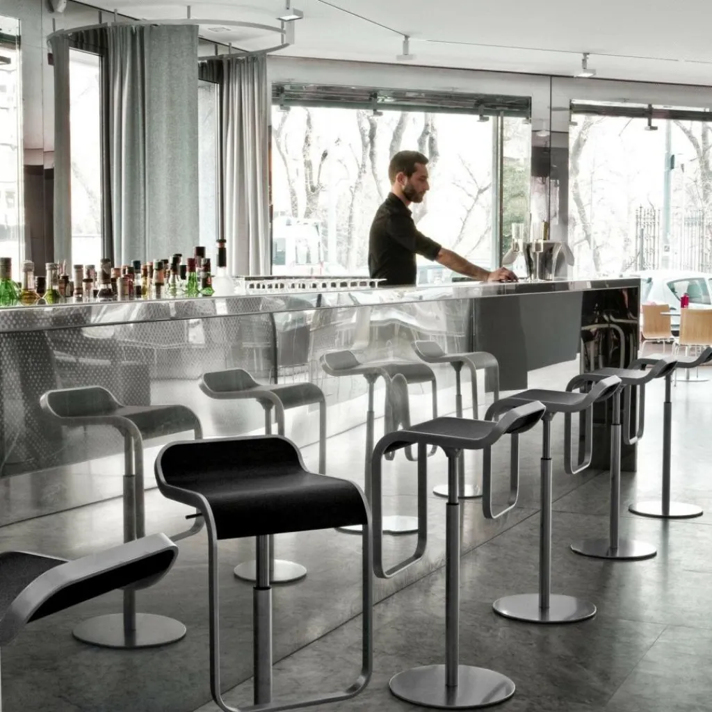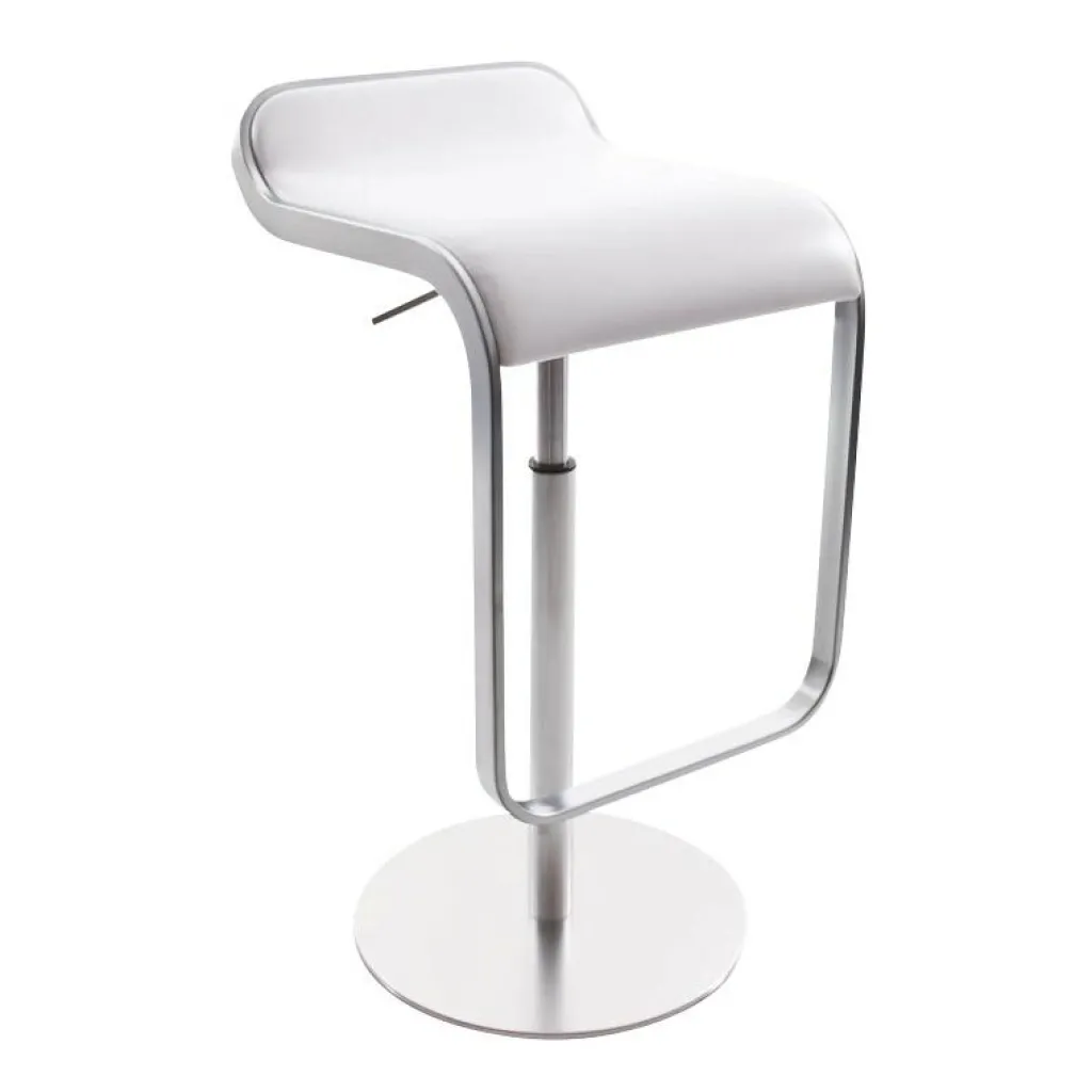 Der LEM S79 Barhocker Sitzfläche Leder 63-75cm beweist Flexibilität: Er kann sowohl gedreht als auch in der Höhe zwischen 63 und 75 cm verstellt werden. Ein Rahmen, der die Sitzfläche umspannt und vorne eine Fußstütze bildet, wird zum Blickfang. Das Gestell des Barhockers besteht aus Metall und ist mit Chrom und Nickel veredelt. Die runde Bodenplatte ist mit Edelstahl überzogen und hat einen Durchmesser von 37 cm. Die Sitzfläche besteht aus formgepresstem Multiplex. Darüber ist edles Leder gespannt, das aus Kuhhaut gefertigt ist und 2,4 bis 2,5 mm dick ist.