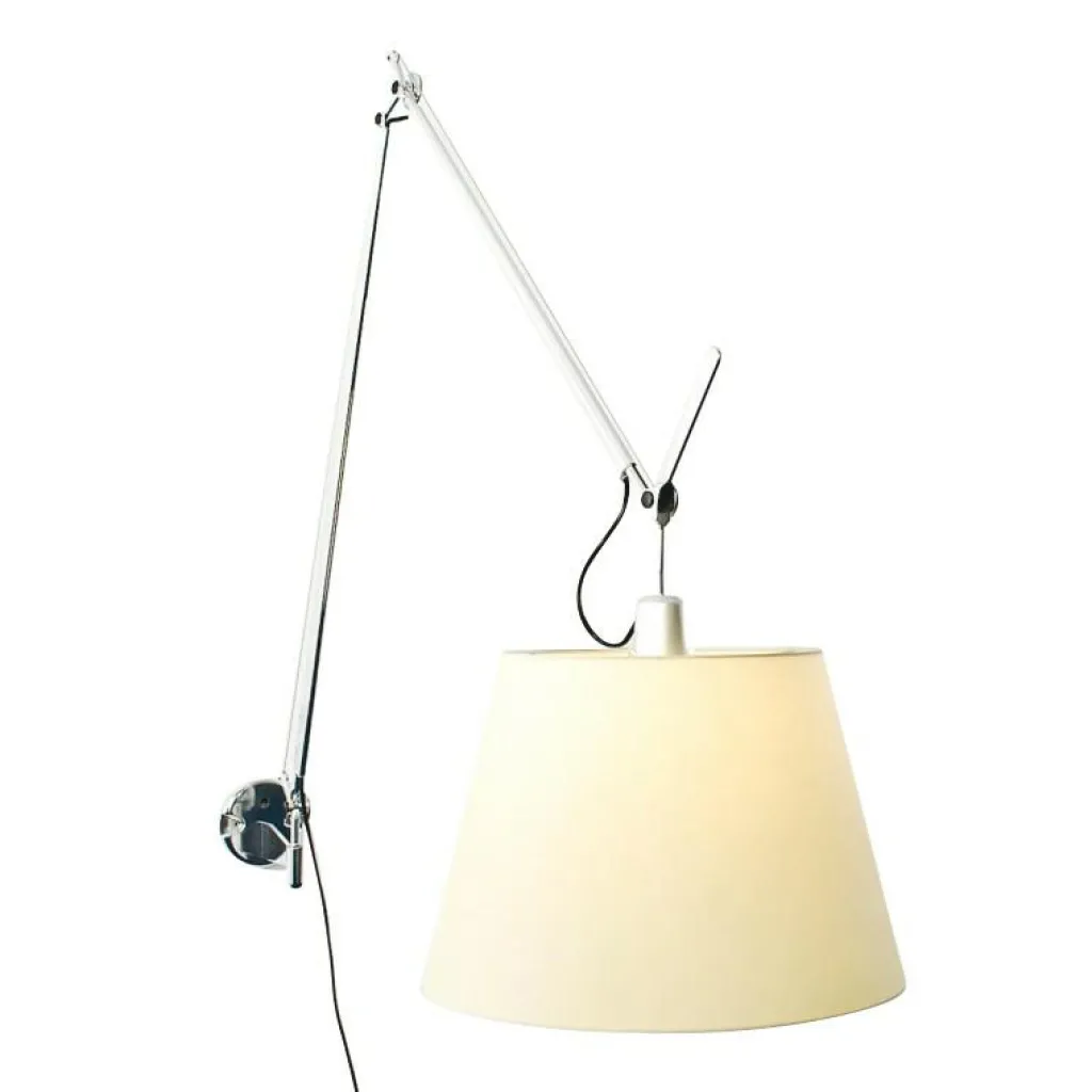Die Tolomeo Mega Parete Pergamentschirm wurde von Michele De Lucchi und Giancarlo Fassina für die Marke Artemide entworfen. Sie reiht sich in eine umfangreiche Kollektion ein, die ihren Namen vom berühmten griechischen Mathematiker Ptolemäus hat.