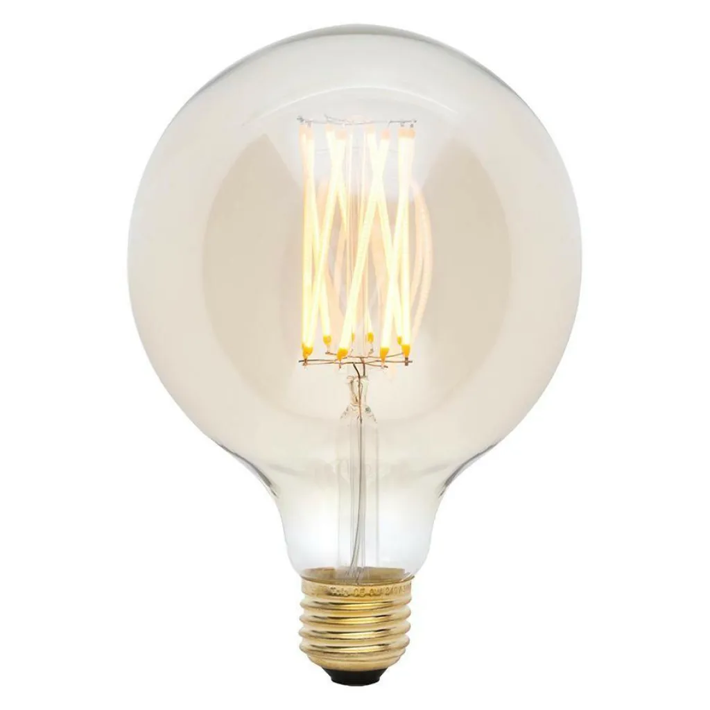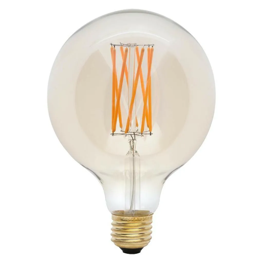 Einzigartig ist der Glühfaden im Inneren, der aus Saphir gefertigt ist. Er wird aus acht hauchzarten Fasern gebildet, die nach allen Seiten Licht ausstrahlen. Daher stammt auch der Beiname 360 Grad. Einen interessanten Kontrast zu den zu einer auffallenden Struktur gedrehten Glühfäden bildet das mundgeblasene Glas. Es wurde in einem Spezialverfahren eingefärbt, was für stimmungsvolles Licht sorgt. DieGaia LED E27 GLOBE FILAMENT 360° 6W => 41W verbindet ehrwürdiges Handwerk mit modernster Technik: Die LED ist mit einer Brenndauer von bis zu 30.000 Stunden äußerst langlebig. Da sie warmes Licht mit einer Lichttemperatur von 2.200 K ausstrahlt, ist sie perfekt für Wohnräume geeignet. Das Leuchtmittel ist 17,5 cm hoch und hat einen Durchmesser von 12,5 cm. Wer das Modell kauft, leistet ganz nebenbei einen wertvollen Beitrag zum Klimaschutz. Denn der Hersteller, der für nachhaltige Produktion bekannt ist, sponsort nämlich für jeweils 200 verkaufte Artikel 10 Bäume.