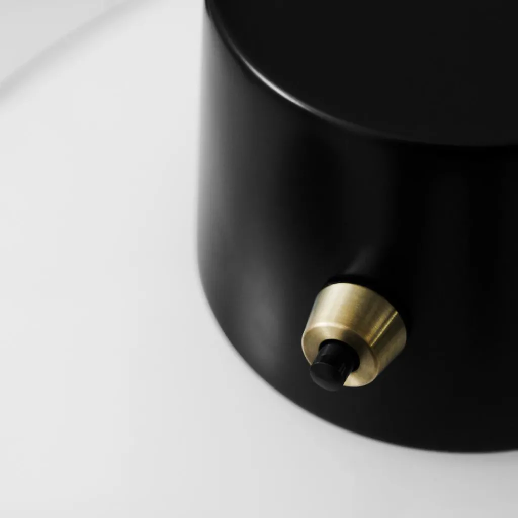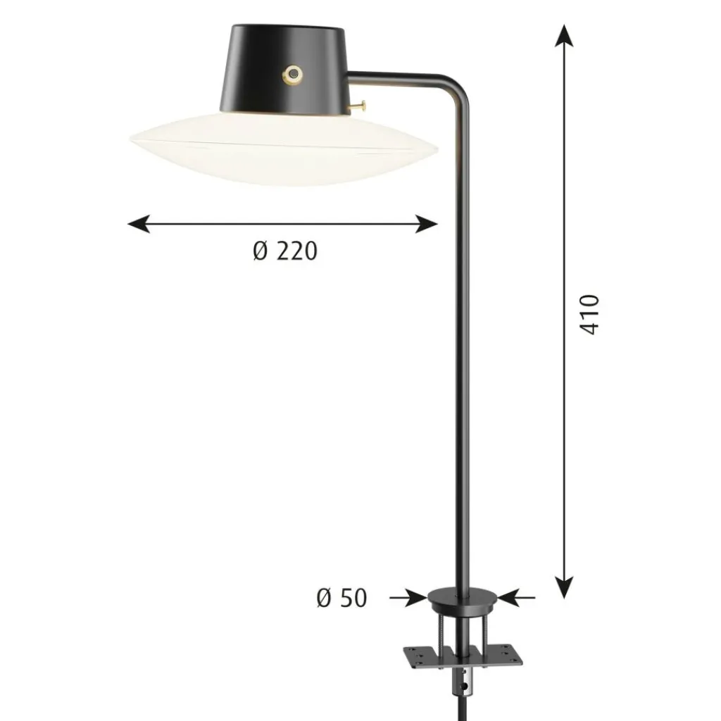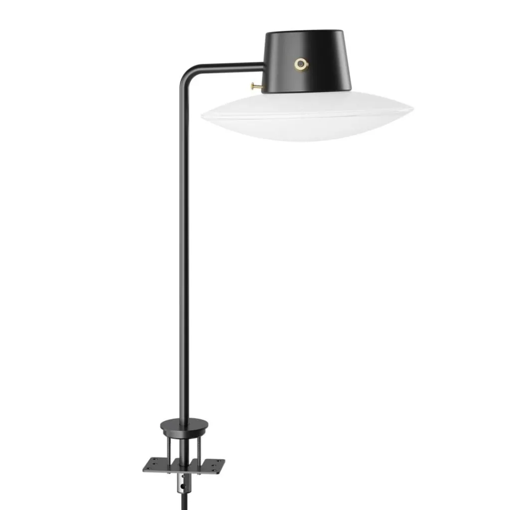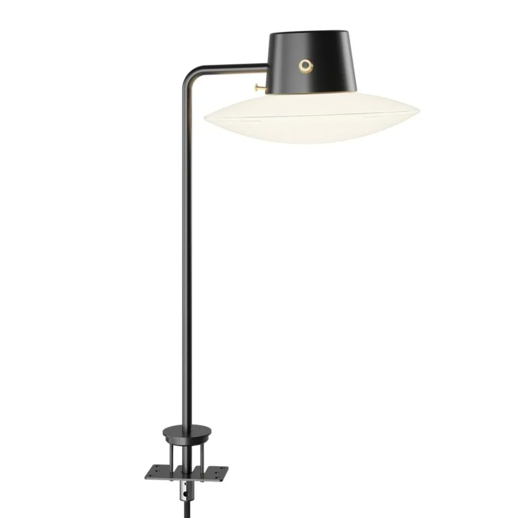 Die AJ Oxford Tischleuchte mit Pin ist für die direkte Montage auf einem Tisch gemacht. Sie wird mit einem Pin befestigt. Daraus führt ein Rohr aus Aluminium senkrecht in die Höhe. Der Leuchtenschirm ist an einer zylinderförmigen Halterung aus Aluminium befestigt. Die Befestigung des Leuchtenschirms mit dem Gestell besteht aus einer attraktiven Messingapplikation. Auch der Schalter aus Messing ist im Kopf integriert. Der runde Leuchtenschirm wird aus mundgeblasenem, opalem Glas gemacht. Er strahlt Licht nach unten, oben und zur Seite ab.