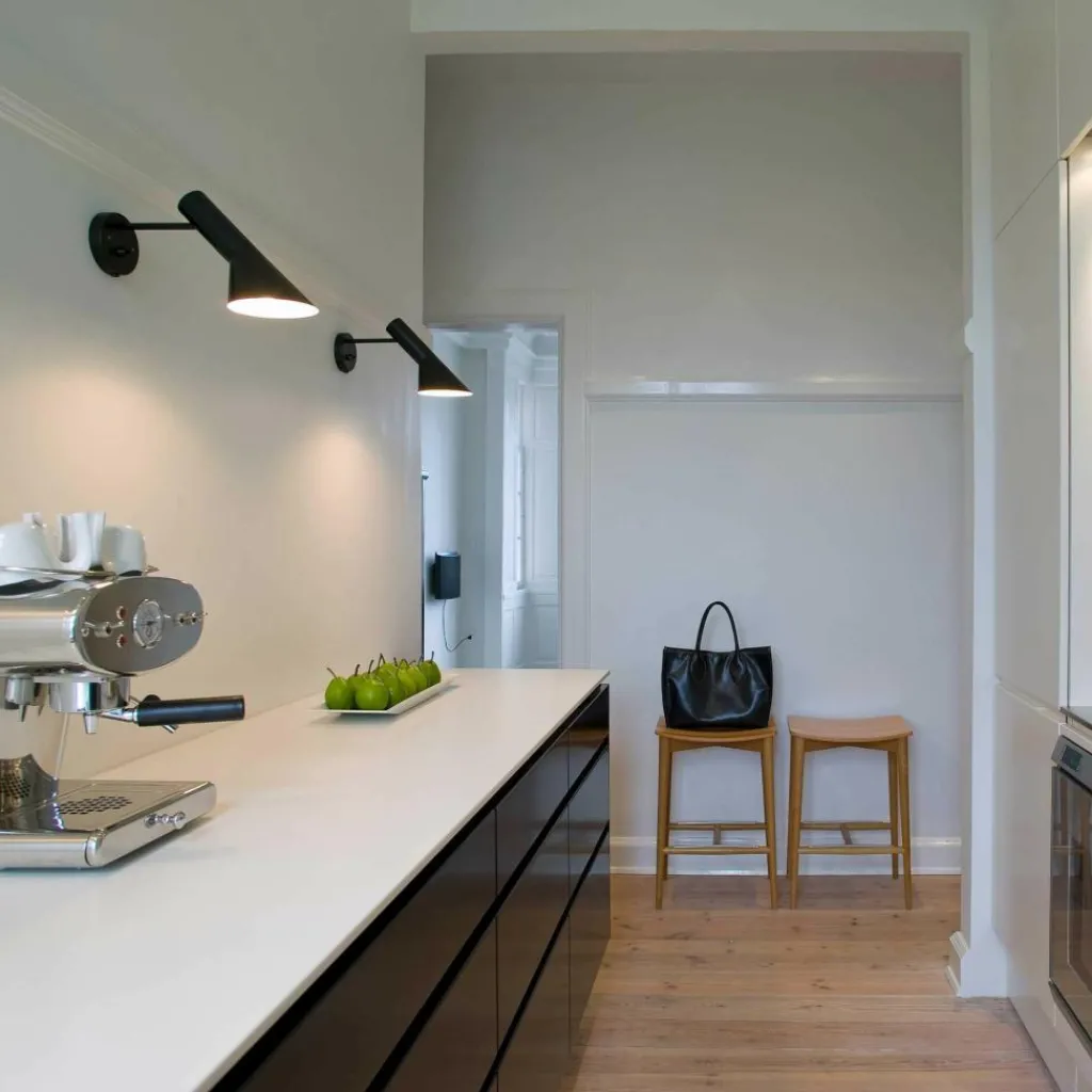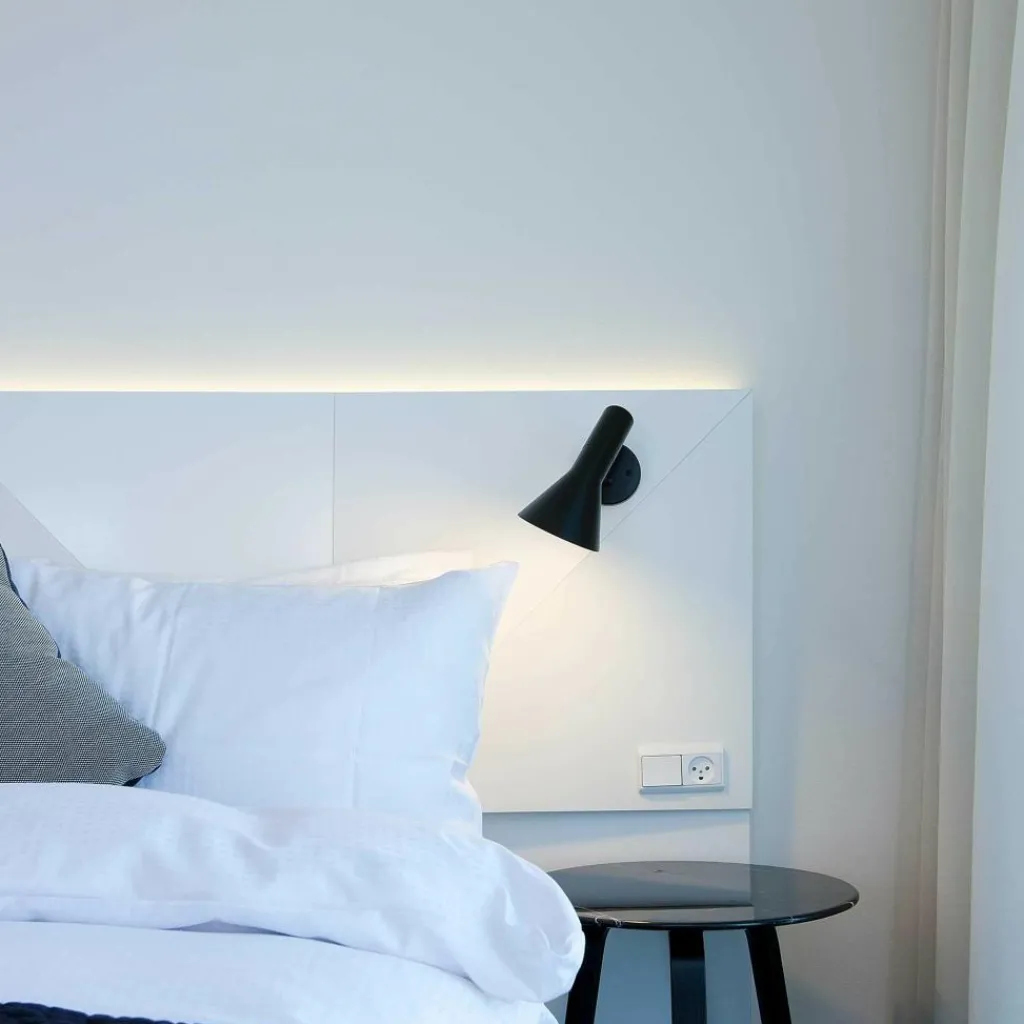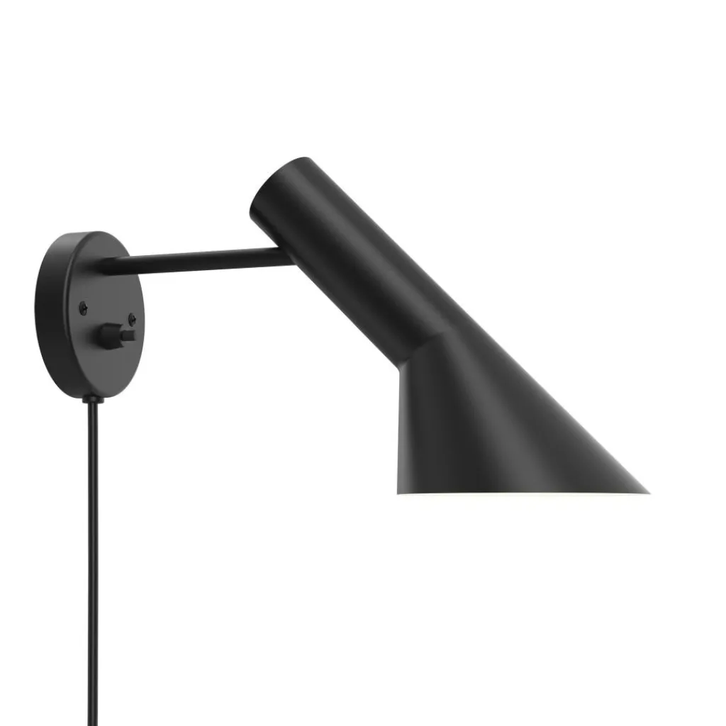 Die AJ Wandleuchte wurde von Arne Jacobsen für die Marke Louis Poulsen entworfen. Die schlichte Leuchte trägt die Initialen des Designers. Die Leuchtenserie wurde im Jahr 1957 für das SAS Royal Hotel in Kopenhagen entworfen. Zusammen mit der Pendelleuchte aus derselben Kollektion zählte sie zur Grundausstattung des Luxushotels. Mit der gekonnten Kombination aus schrägen und geraden Linien weist das Modell Ähnlichkeiten mit der Architektur des Hauses auf.