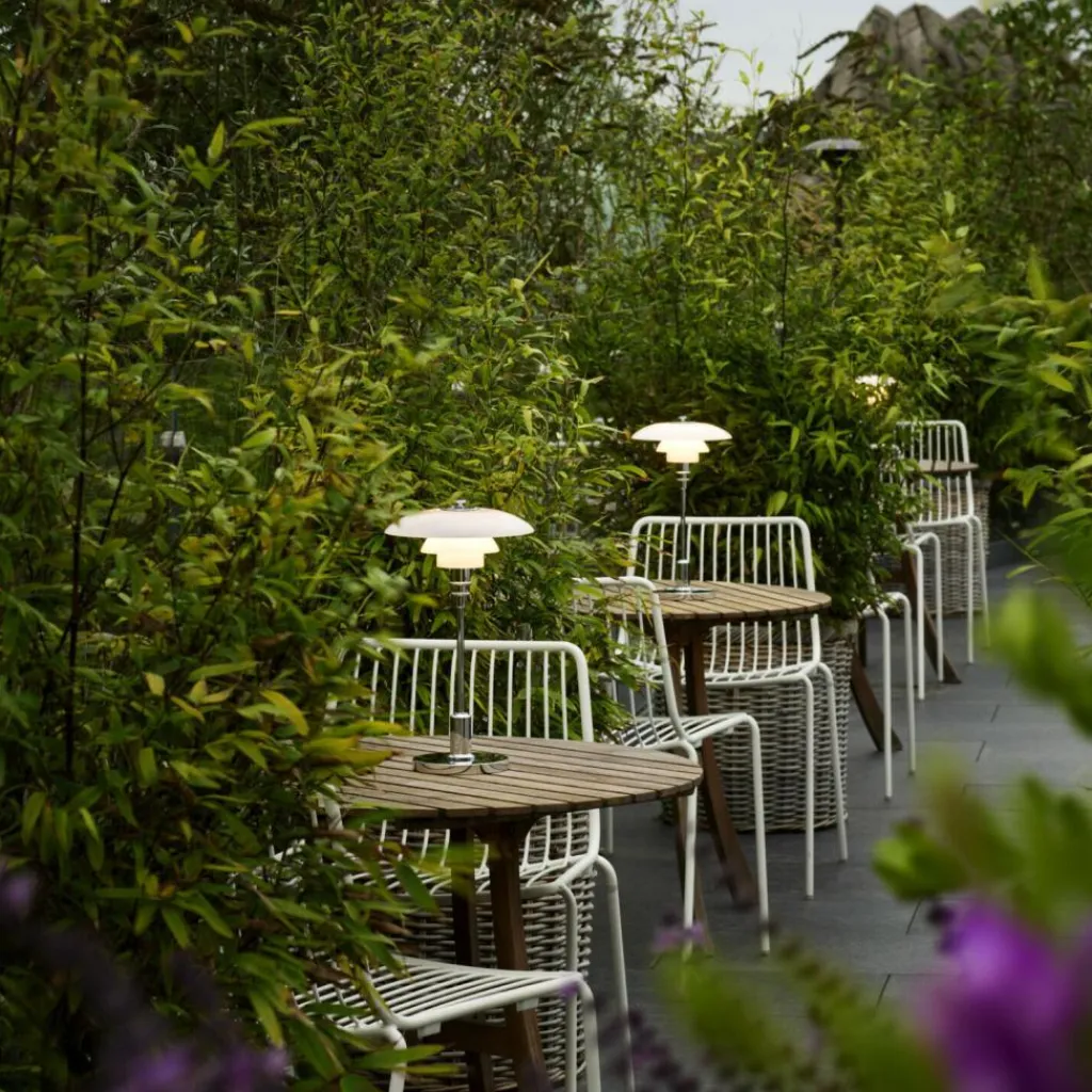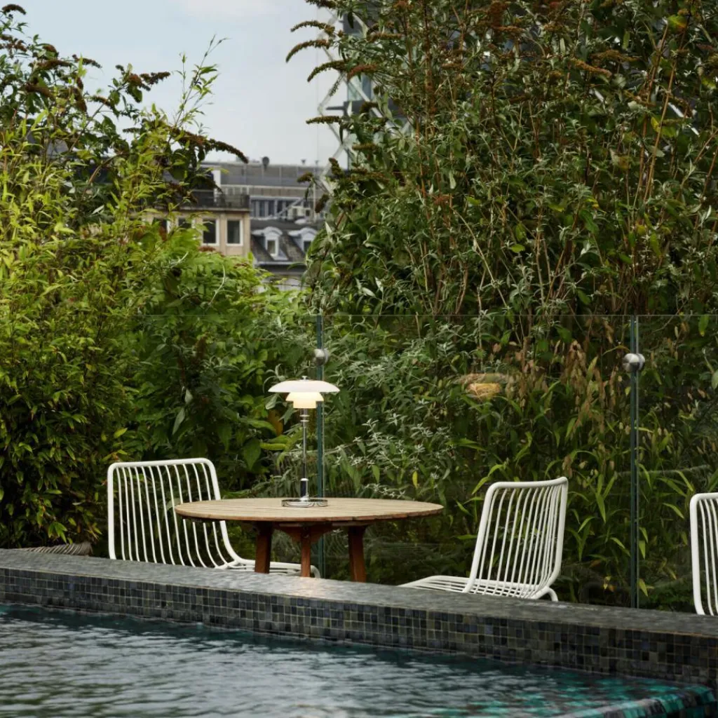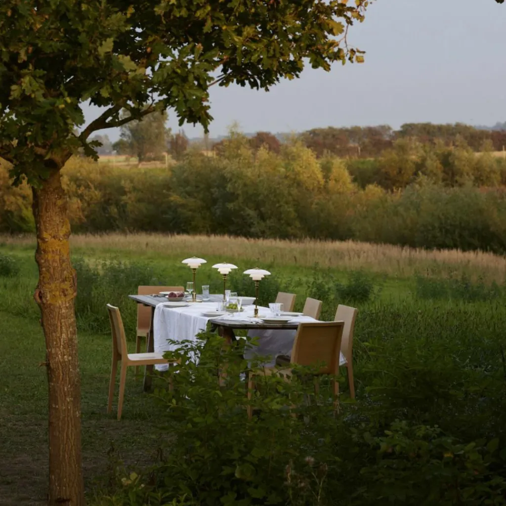 Der Entwurf seiner typischen Leuchten mit drei reflektierenden Schirmen, die für ein blendfreies Licht in gestaffelten Größen aufeinander aufbauen, geht auf die 1920er-Jahre zurück. Diese tragbare Variante des Designklassikers eignet sich gut für alle Ecken in der Wohnung ohne nahe gelegene Steckdose. Auch für sommerliche Abende auf dem Balkon ist sie nutzbar. Das blendfreie Licht lässt sich per Dim-to-warm-Funktion stufenlos zwischen ultrawarmweißen 1.800K und warmweißen 2.700K einstellen. Zudem kann die Helligkeit auf 5%, 20%, 45% oder 100% angepasst werden. Der austauschbare Akku wird per 150cm langem USB-C-Kabel oder mit einem Qi-Ladegerät aufgeladen und bringt bei 100% Helligkeit eine Betriebsdauer von fünf Stunden mit. Die integrierte LED-Leuchte ist austauschbar.