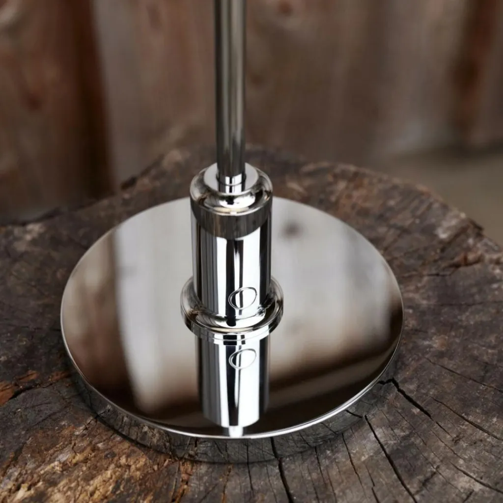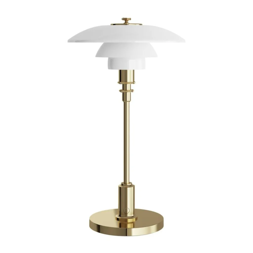 Der runde Leuchtenfuß mit einem Durchmesser von 13cm und der Leuchtenstab mit Schalter sind aus verchromtem, glänzendem Messing gearbeitet. Der Leuchtenschirm besteht aus mundgeblasenem Opalglas. Die PH 2/1 Portable LED Akkuleuchte misst 36cm Höhe, 20cm Durchmesser und wiegt 0,8kg. Im gleichen Design gibt es Pendelleuchten, Stehleuchten und Tischleuchten mit Kabel.