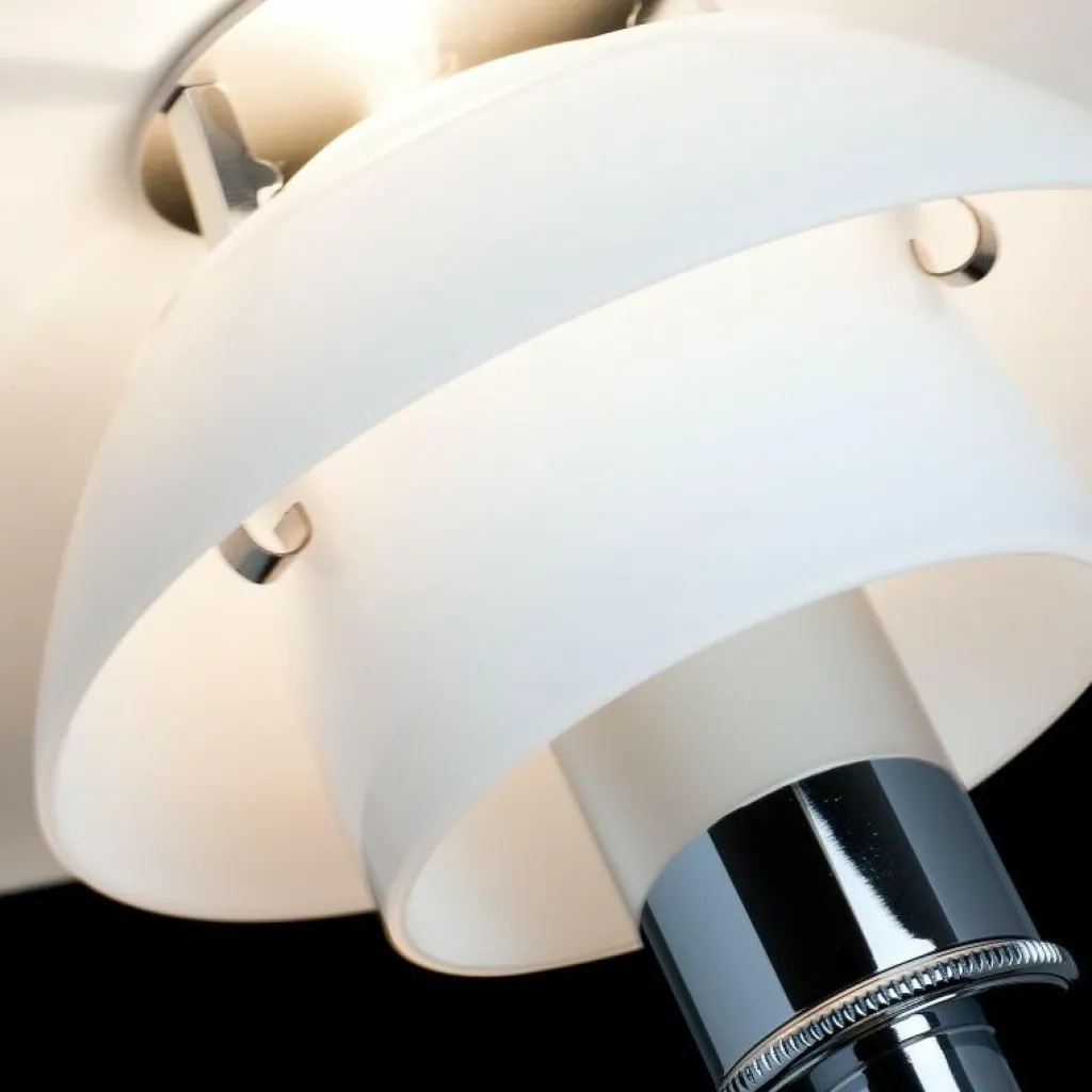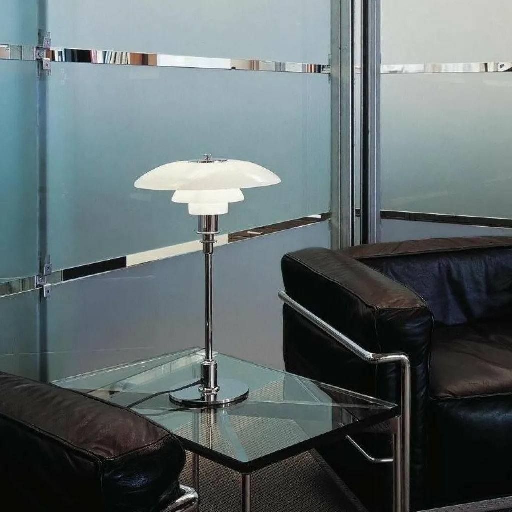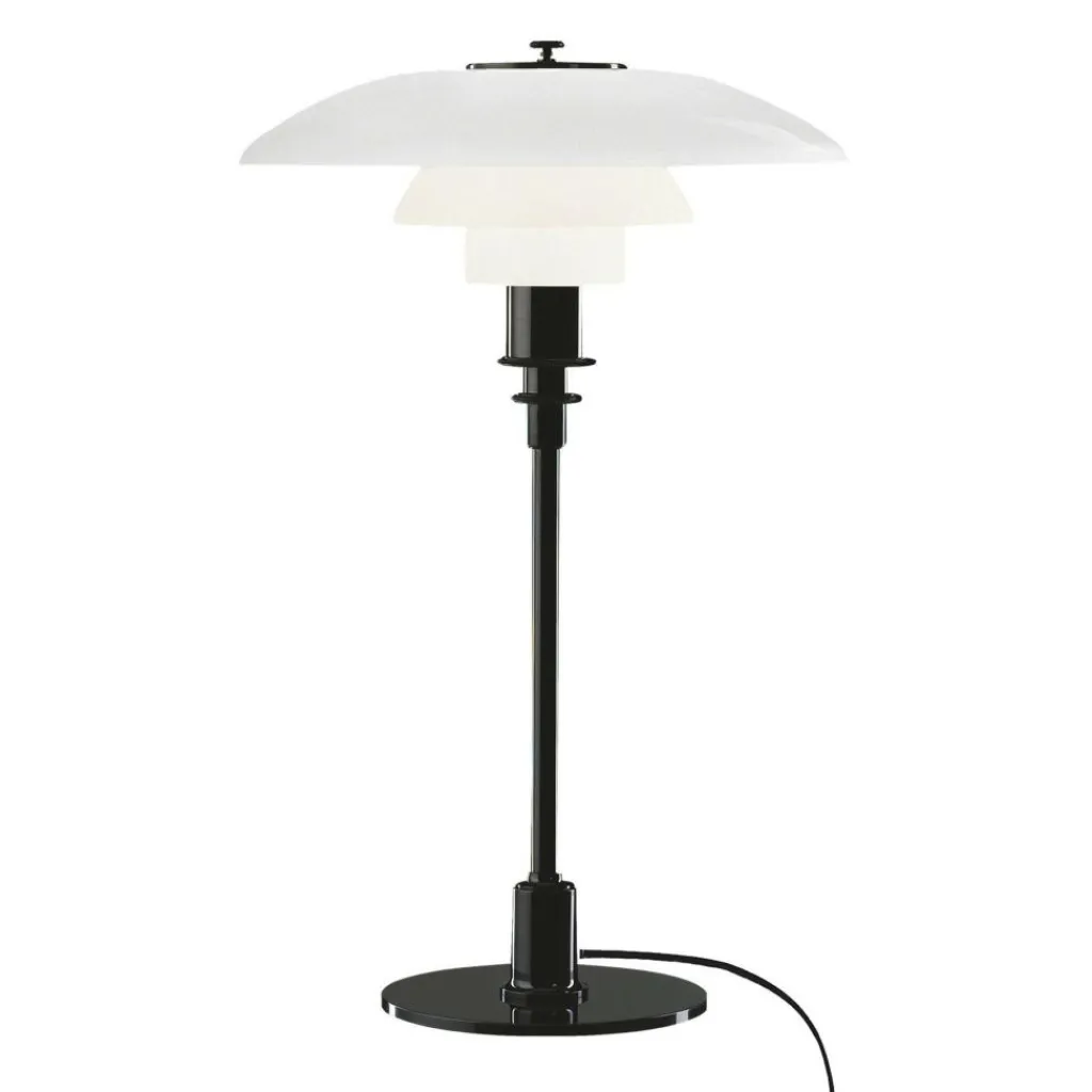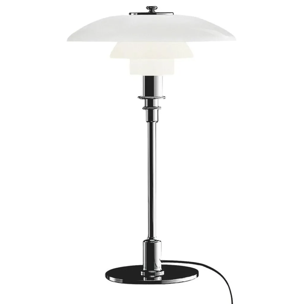 Die PH 3/2 Tischleuchte strahlt angenehmes Licht in alle Richtungen aus. Dafür sorgt die spezielle Zusammensetzung der Leuchte aus drei Leuchtschirmen. Der unterste ist mit einem Diffusor ausgestattet. Alle Schirme sind aus mundgeblasenem Opalglas gemacht und in der Innenseite sandgestrahlt. Dadurch wird das Licht blendfrei abgegeben. Der runde Fuß und das Standrohr bestehen aus Messing. Es ist wahlweise hochglanzverchromt, metallisiert oder schwarz metallisiert. Auch die Befestigung des Leuchtenschirms an der Oberseite besteht aus demselben Material. Der Schalter aus Phenolharz ist im Kabel integriert.