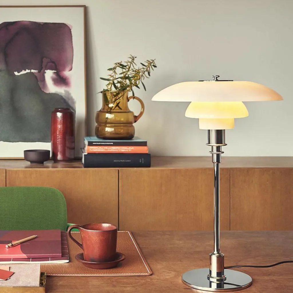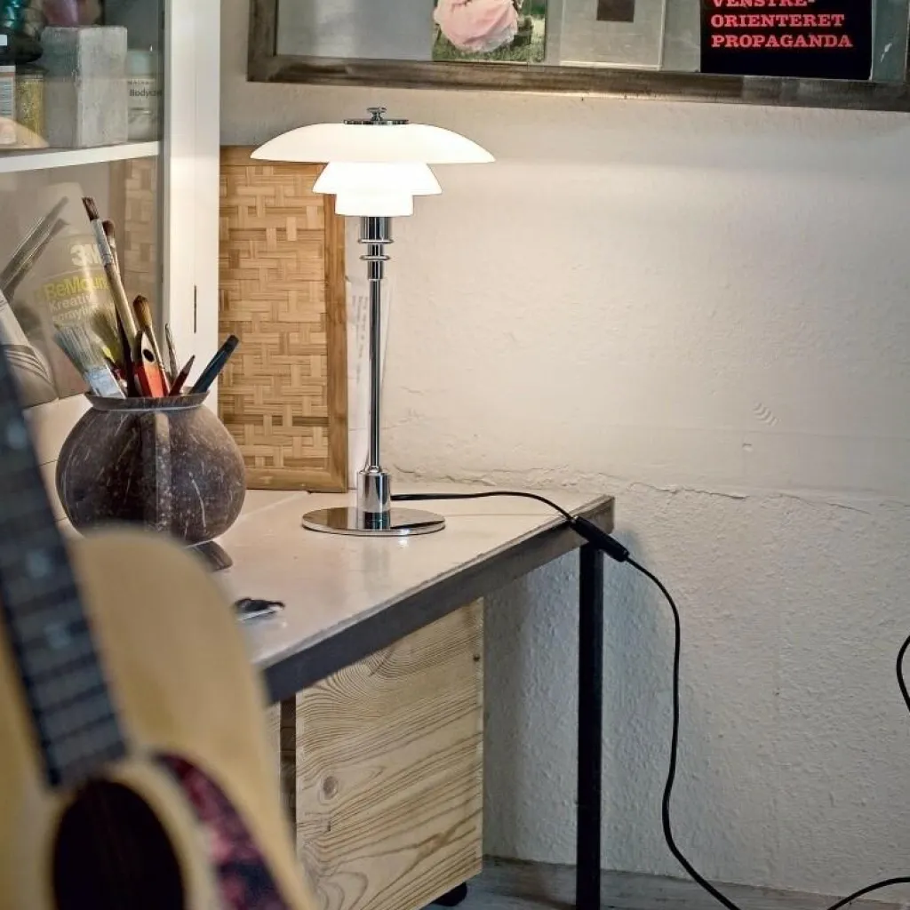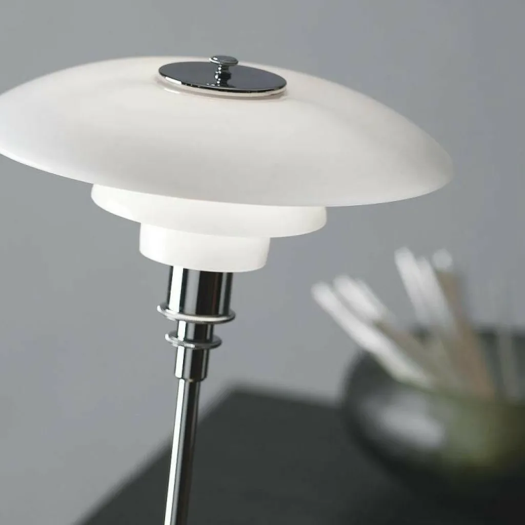 Die PH 3/2 Tischleuchte wurde von Poul Henningsen für die Marke Louis Poulsen entworfen. Sie gehört zu einer umfangreichen Kollektion, die auch Pendelleuchten umfasst. Mit der PH 3/2 Tischleuchte reagierte der dänische Designer auf die Innovationen der 1950er-Jahre. Damals veränderten sich die Leuchtmittel stark und man brauchte stilvolle Leuchten in allen Dimensionen.
