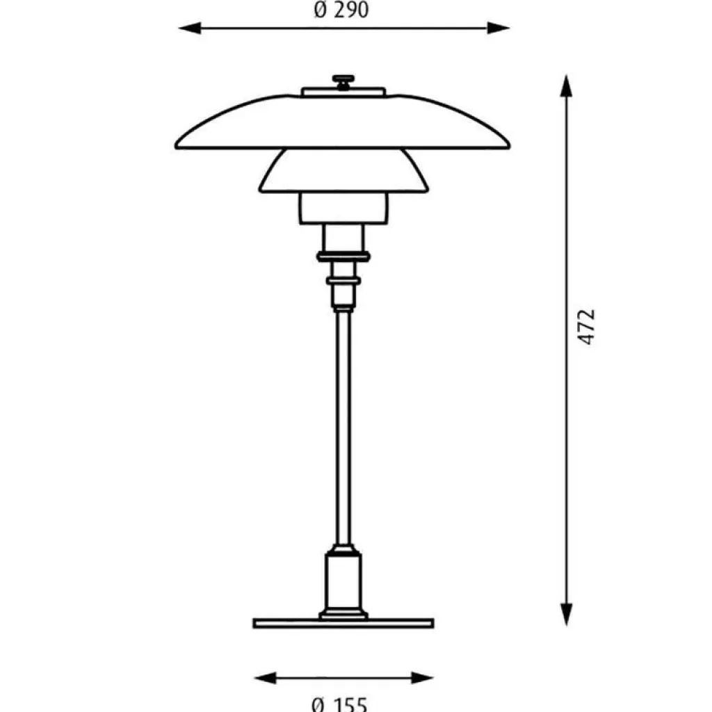 Die tragbare PH 3/2 Tischleuchte braucht ein Leuchtmittel mit einer E14-Fassung. Es wird in eine Fassung aus Phenolharz eingeschraubt. Die Leuchte ist 47,2 cm hoch. Der größte Schirm hat einen Durchmesser von 29 cm. Der runde Sockel hat einen Durchmesser von 15,5 cm. Die Kabellänge des 2,5 kg schweren Modells beträgt 210 cm.