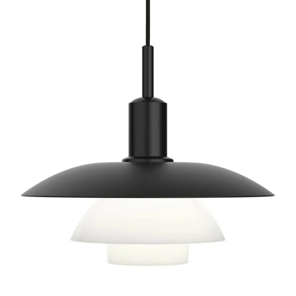 Dank ihrer drei Schirme zeichnet sich die PH 5/5 LED Pendelleuchte Opalglas und Metall durch ein angenehmes, blendfreies Licht aus. Die Nummer 5/5 verweist auf eine Schirmgröße mit kompakter Form. Dabei hat der obere Leuchtenschirm aus lackiertem Aluminium mit Softtouch und weißer Innenseite einen Durchmesser von 50cm. Darauf folgen im Verhältnis 3:2:1 der mittlere und untere Schirm aus weißem, dreischichtigem und mundgeblasenem Opalglas. In Verbindung sorgen die drei unterschiedlich geformten Schirme für einen warmen Lichtschein. Ein leicht einsetzbarer Diffusor aus mattiertem Glas garantiert eine noch sanftere Lichtabstrahlung. Zur Montage an der Decke sind ein matter Baldachin aus Aluminium und ein 400cm langes Textilkabel vorhanden.
