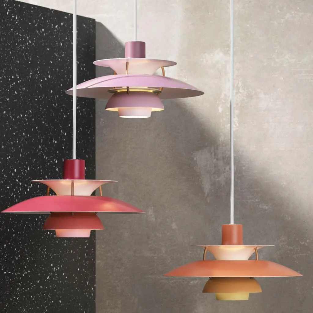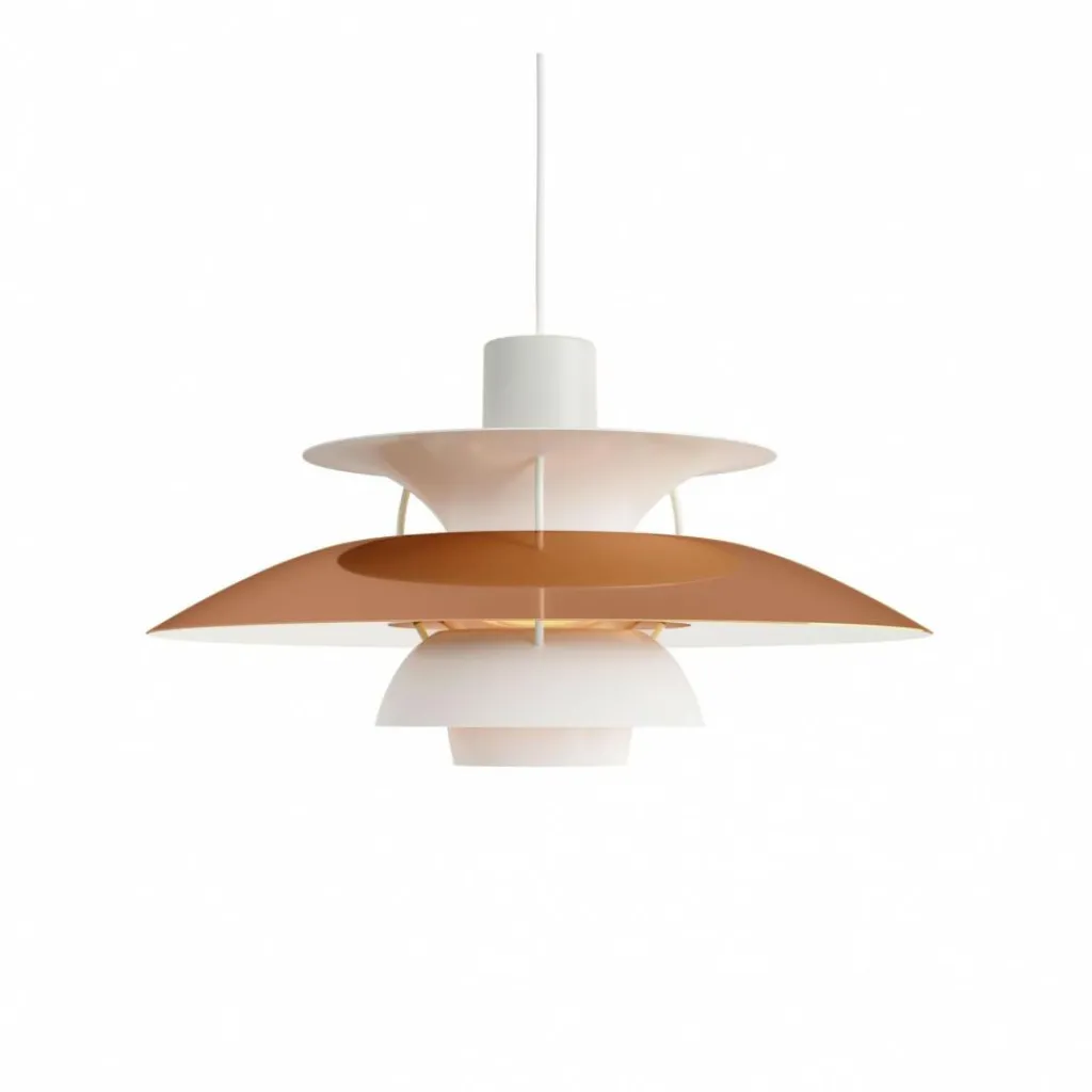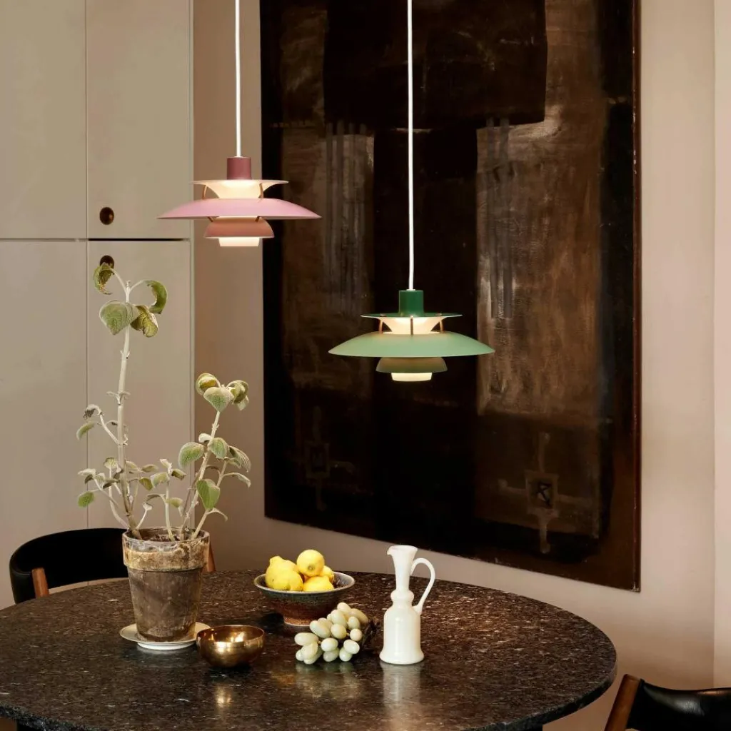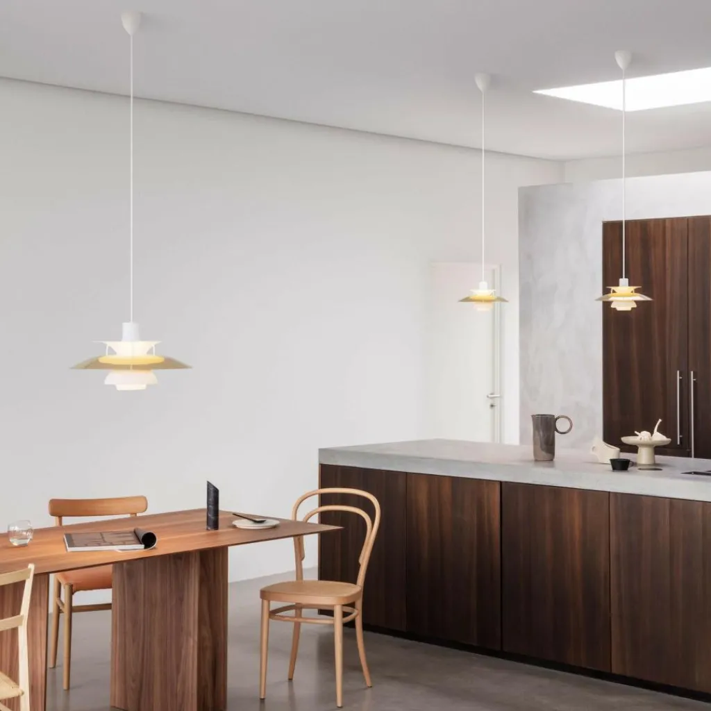 Die bis ins letzte Detail durchdachte Bauart der PH 5 Mini Pendelleuchte erhellt Ihren Raum mit einem vollkommen blendfreien Licht. Der Aufbau richtet sich nach dem in den 1920er-Jahren konstruierten Drei-Schirm-System, das durch die konzentrische Anordnung der drei ineinandergreifenden Schirme einen großen Teil des abgegebenen Lichtes nach unten fallen lässt. Ein gewisser Anteil des Lichtes strahlt auch zur Seite aus, wo es von den Schirmen wiederum reflektiert wird und dadurch die Leuchte selbst erhellt.