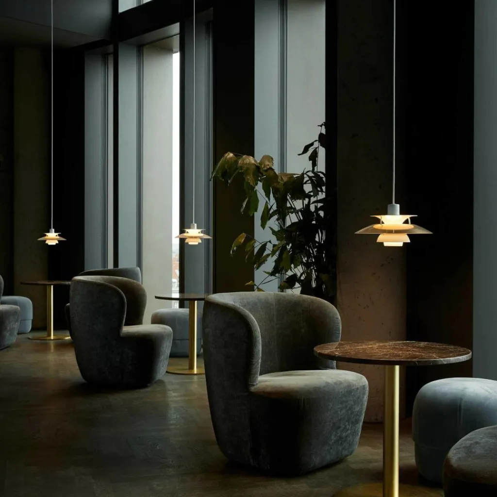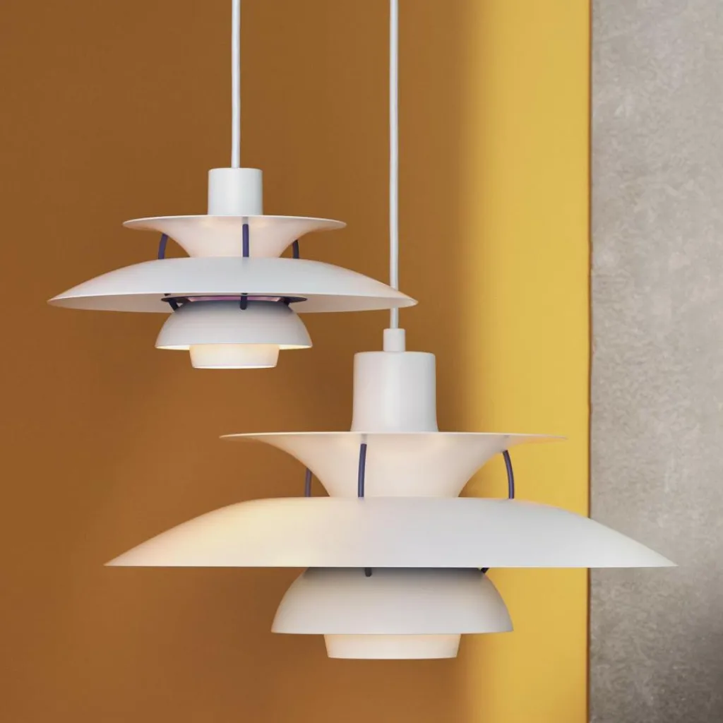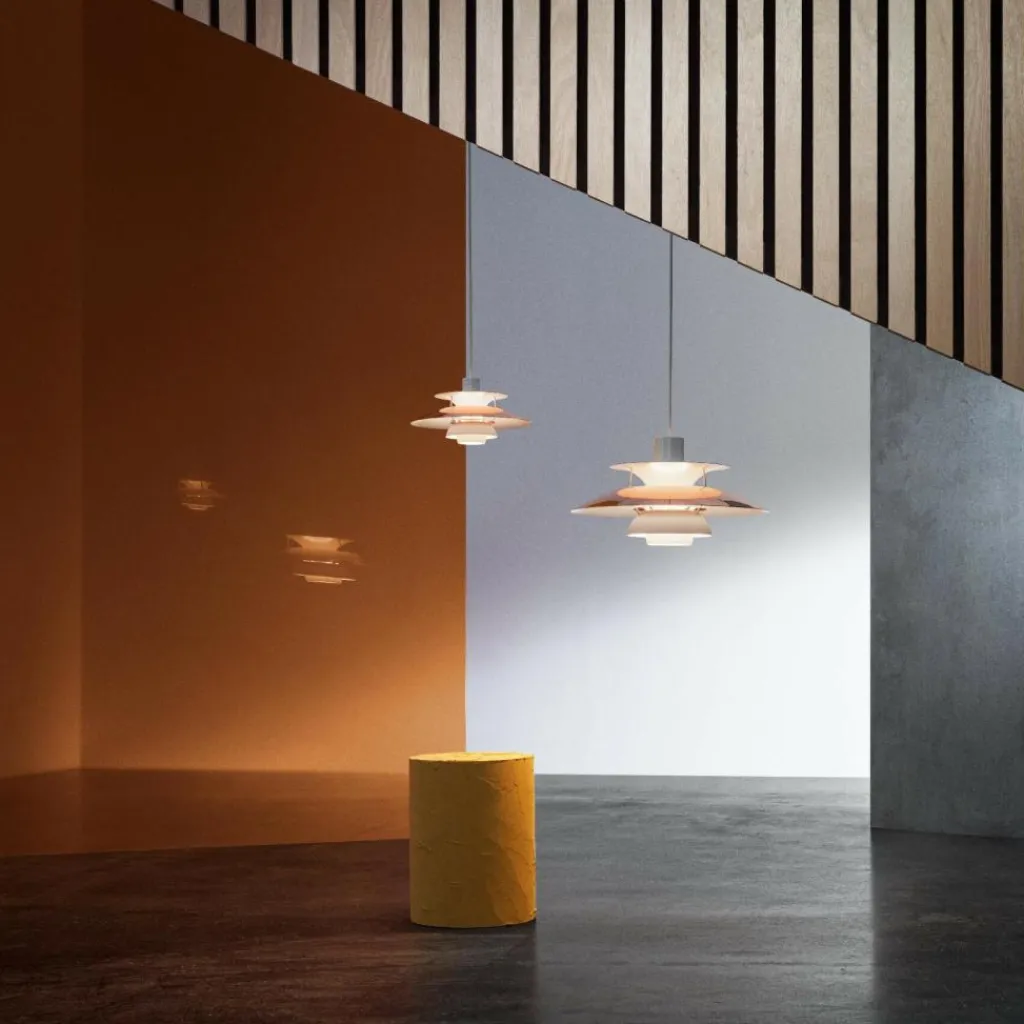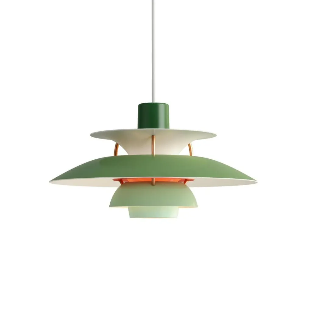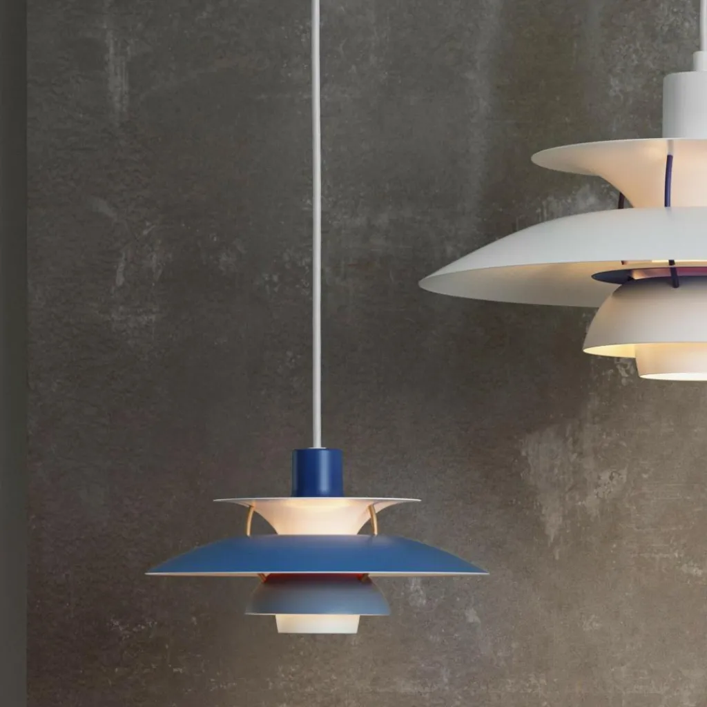 Die bis ins letzte Detail durchdachte Bauart der PH 5 Mini Pendelleuchte erhellt Ihren Raum mit einem vollkommen blendfreien Licht. Der Aufbau richtet sich nach dem in den 1920er-Jahren konstruierten Drei-Schirm-System, das durch die konzentrische Anordnung der drei ineinandergreifenden Schirme einen großen Teil des abgegebenen Lichtes nach unten fallen lässt. Ein gewisser Anteil des Lichtes strahlt auch zur Seite aus, wo es von den Schirmen wiederum reflektiert wird und dadurch die Leuchte selbst erhellt.