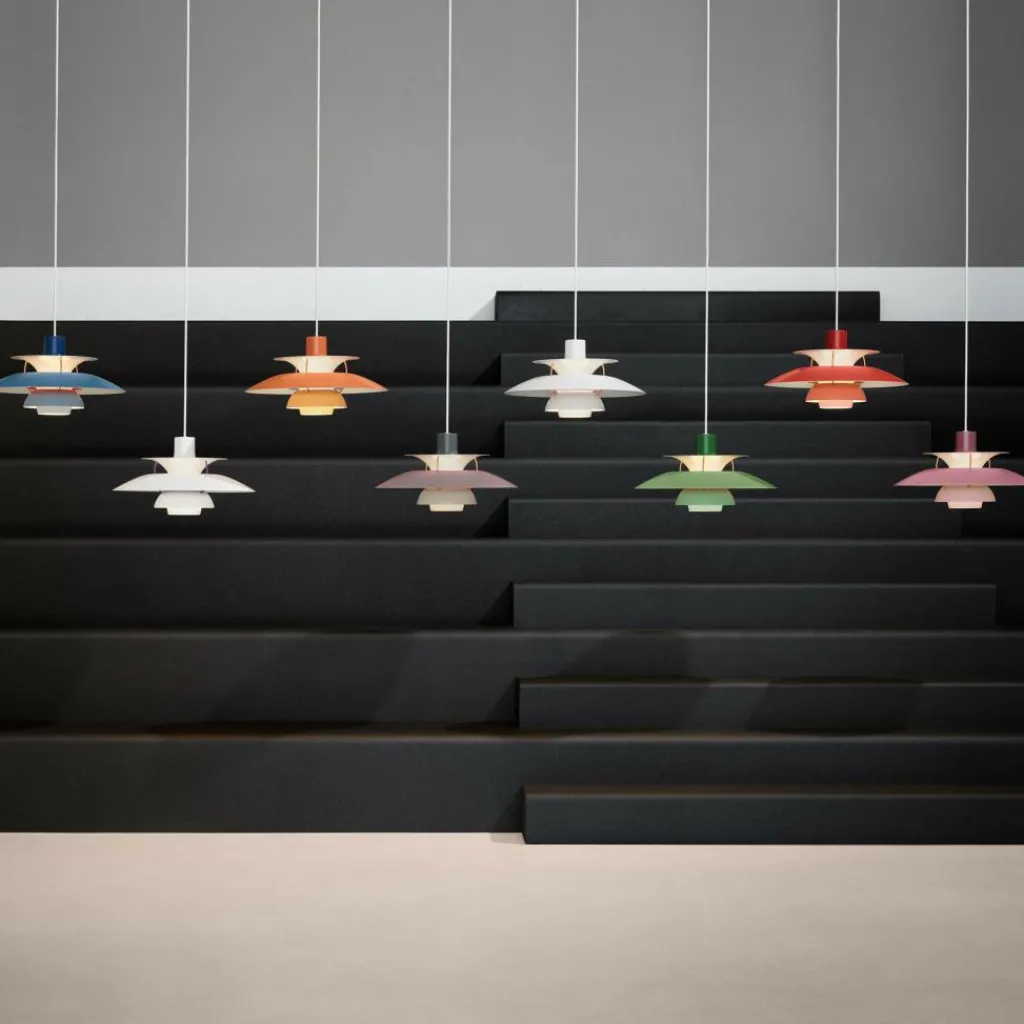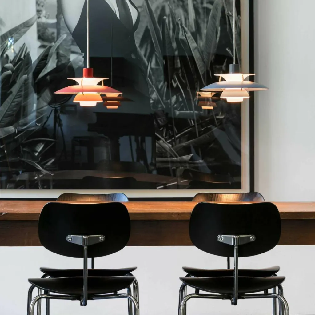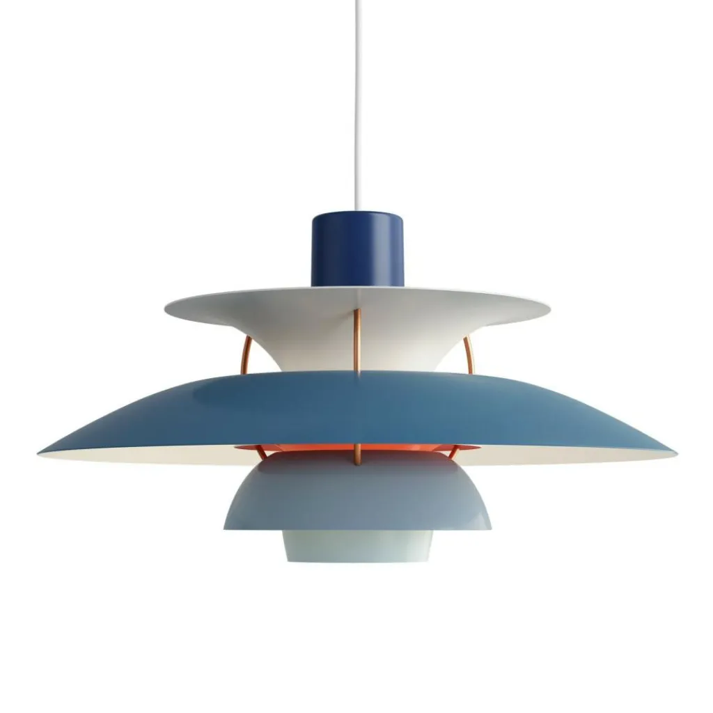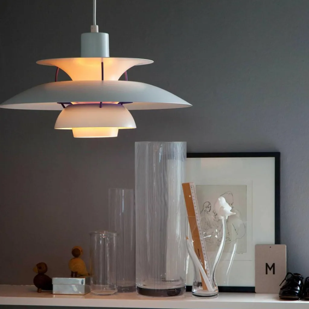 Seitdem die PH 5 Pendelleuchte im Jahr 1958 erfunden wurde, hat sie nichts an Attraktivität eingebüßt. Wie eine futuristische Skulptur schwebt das moderne Modell im Raum. Der Schirm ist vierteilig gestaltet, wobei der erste nach oben und die drei unteren nach unten geöffnet sind. Durch den unteren als Diffusor dringt blendfreies Licht in den Raum. Es wird von den drei unteren Schirmen nach unten geleitet. Der obere Schirm sorgt für eine vertikale Beleuchtung und verdeckt die Halterung. Die Schirme werden aus gezogenem Aluminium gemacht, das 0,8cm dick ist. Sie sind mit Stäben aus lackiertem, gewalztem Aluminium verbunden. Man kann die PH 5 Pendelleuchte in verschiedenen Farben bestellen. Die Fassung für das Leuchtmittel mit E27-Fassung wird aus Porzellan gemacht. Man kann ihre Position verstellen, sodass der Lichtstrahl genau ausgerichtet ist.