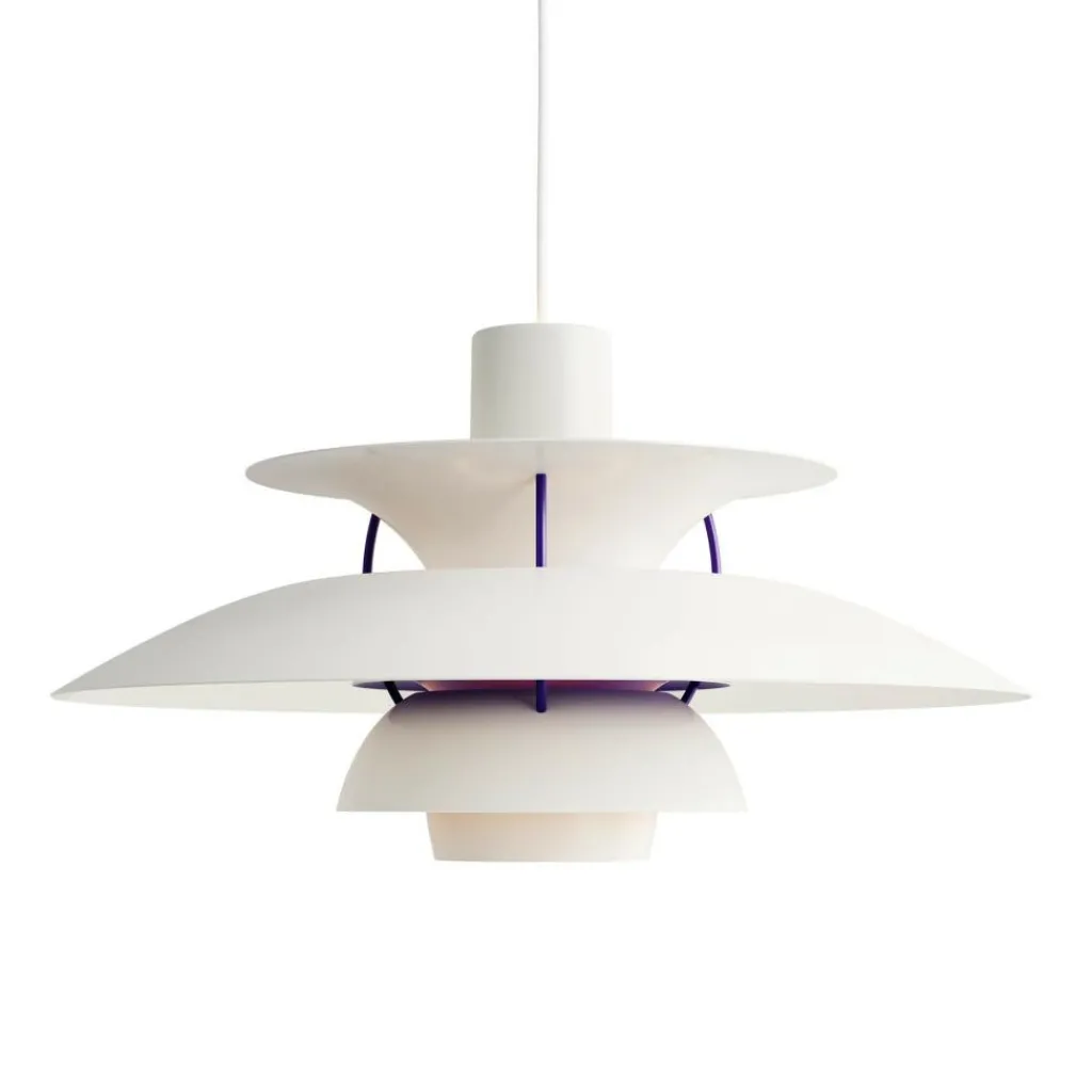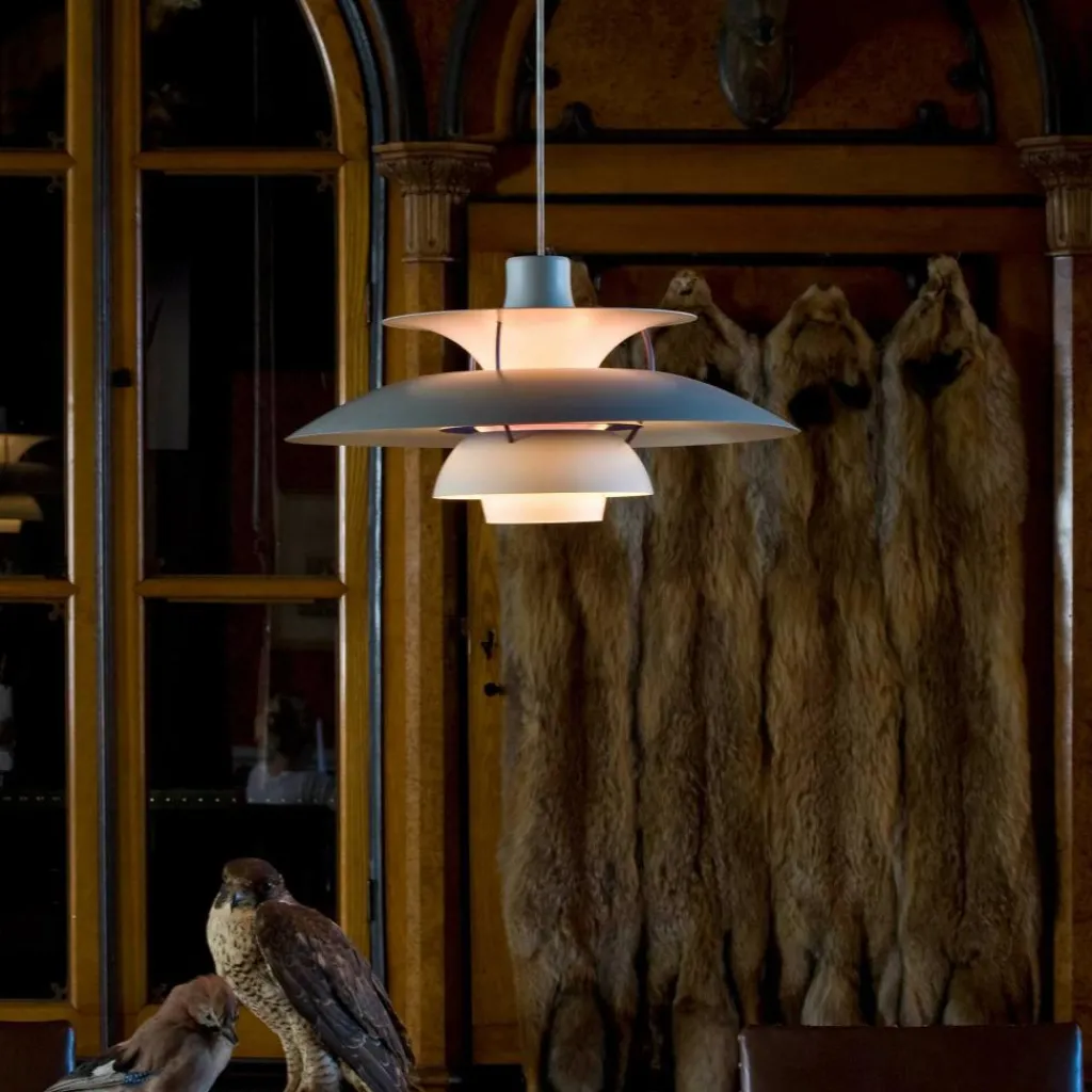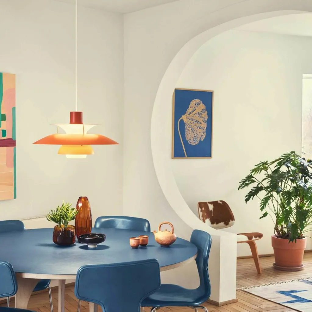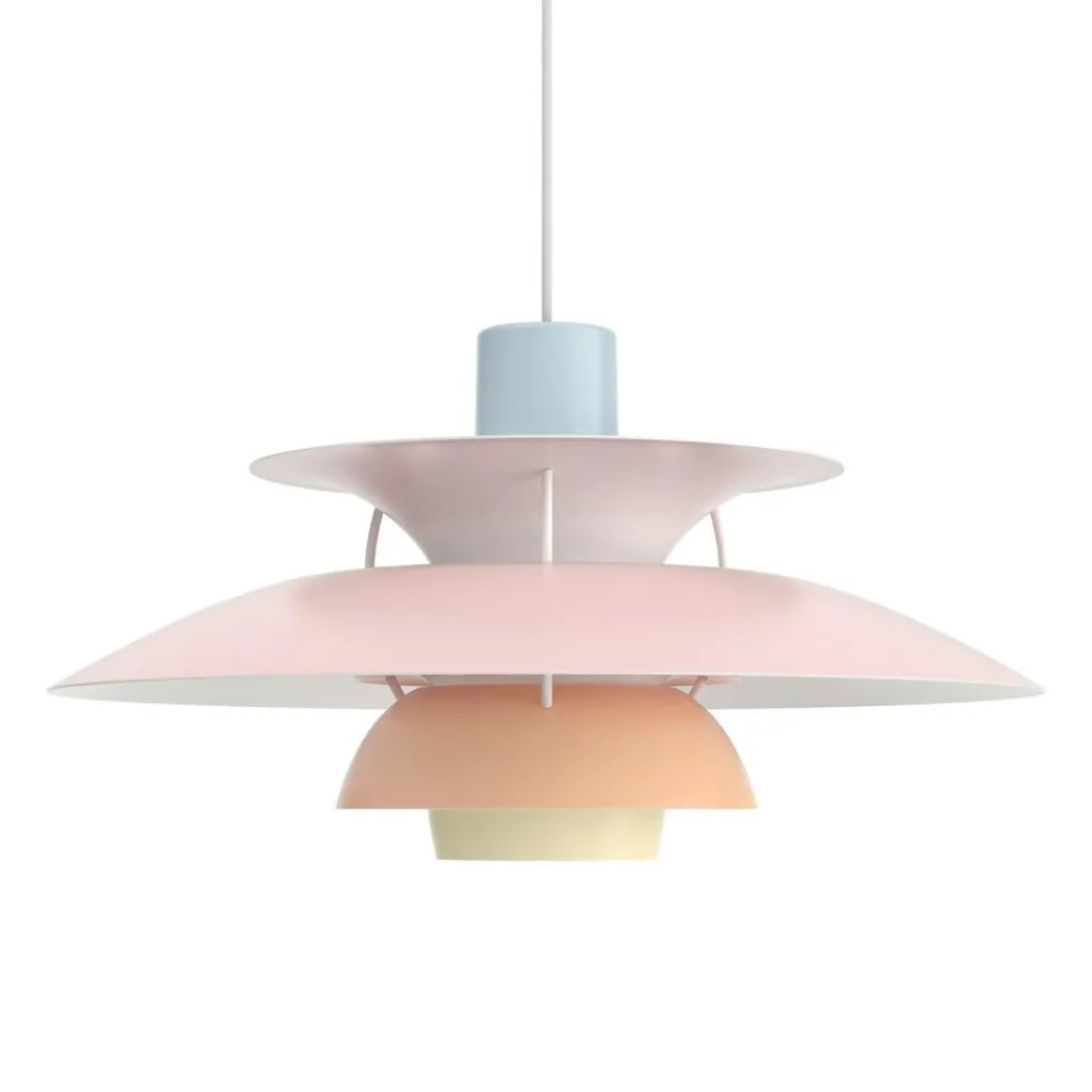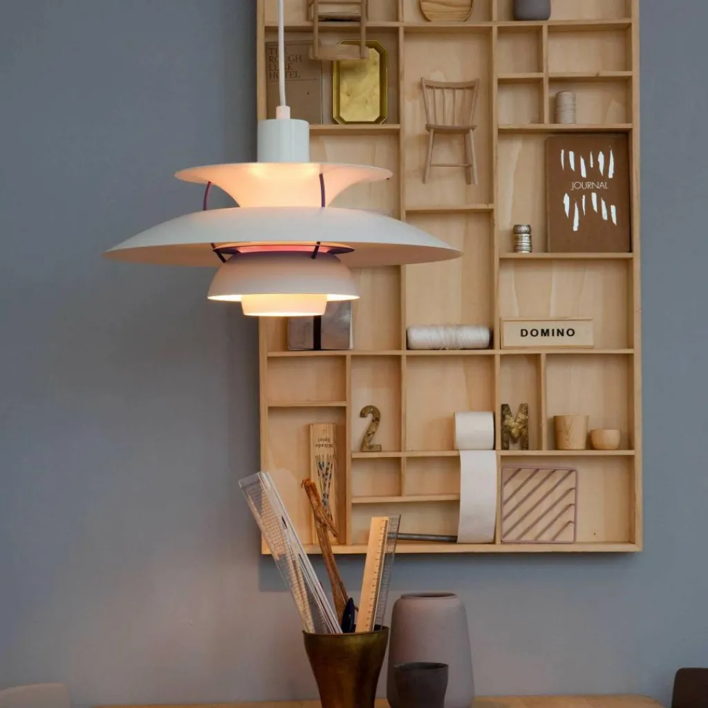 Seitdem die PH 5 Pendelleuchte im Jahr 1958 erfunden wurde, hat sie nichts an Attraktivität eingebüßt. Wie eine futuristische Skulptur schwebt das moderne Modell im Raum. Der Schirm ist vierteilig gestaltet, wobei der erste nach oben und die drei unteren nach unten geöffnet sind. Durch den unteren als Diffusor dringt blendfreies Licht in den Raum. Es wird von den drei unteren Schirmen nach unten geleitet. Der obere Schirm sorgt für eine vertikale Beleuchtung und verdeckt die Halterung. Die Schirme werden aus gezogenem Aluminium gemacht, das 0,8cm dick ist. Sie sind mit Stäben aus lackiertem, gewalztem Aluminium verbunden. Man kann die PH 5 Pendelleuchte in verschiedenen Farben bestellen. Die Fassung für das Leuchtmittel mit E27-Fassung wird aus Porzellan gemacht. Man kann ihre Position verstellen, sodass der Lichtstrahl genau ausgerichtet ist.