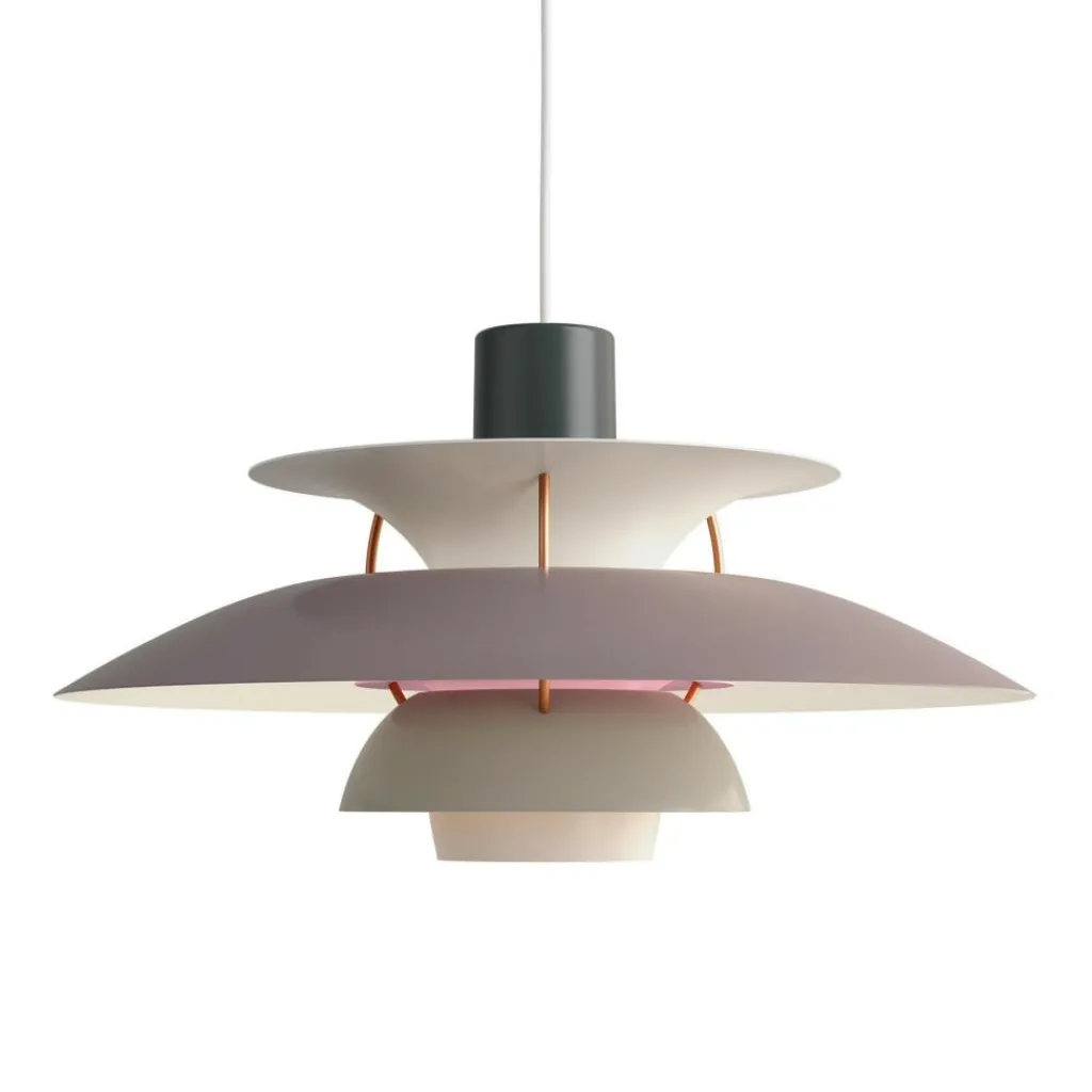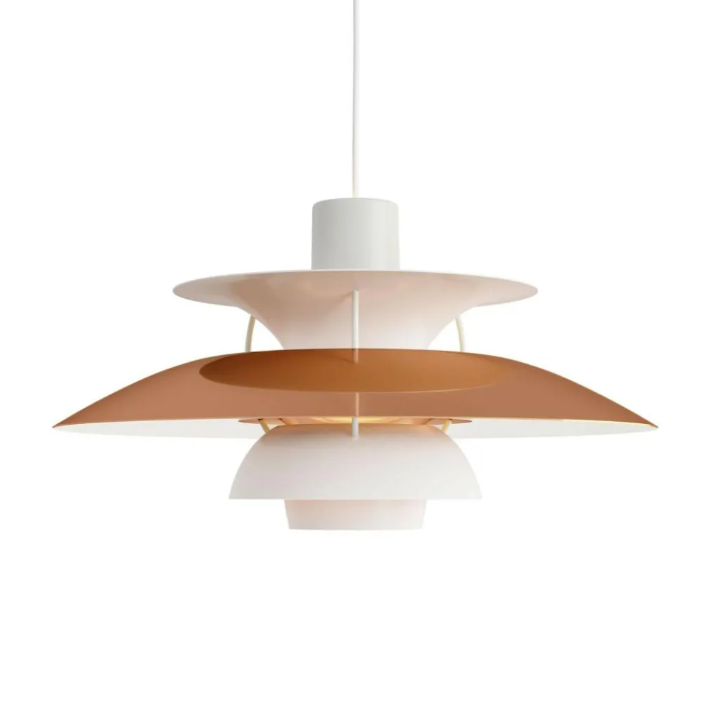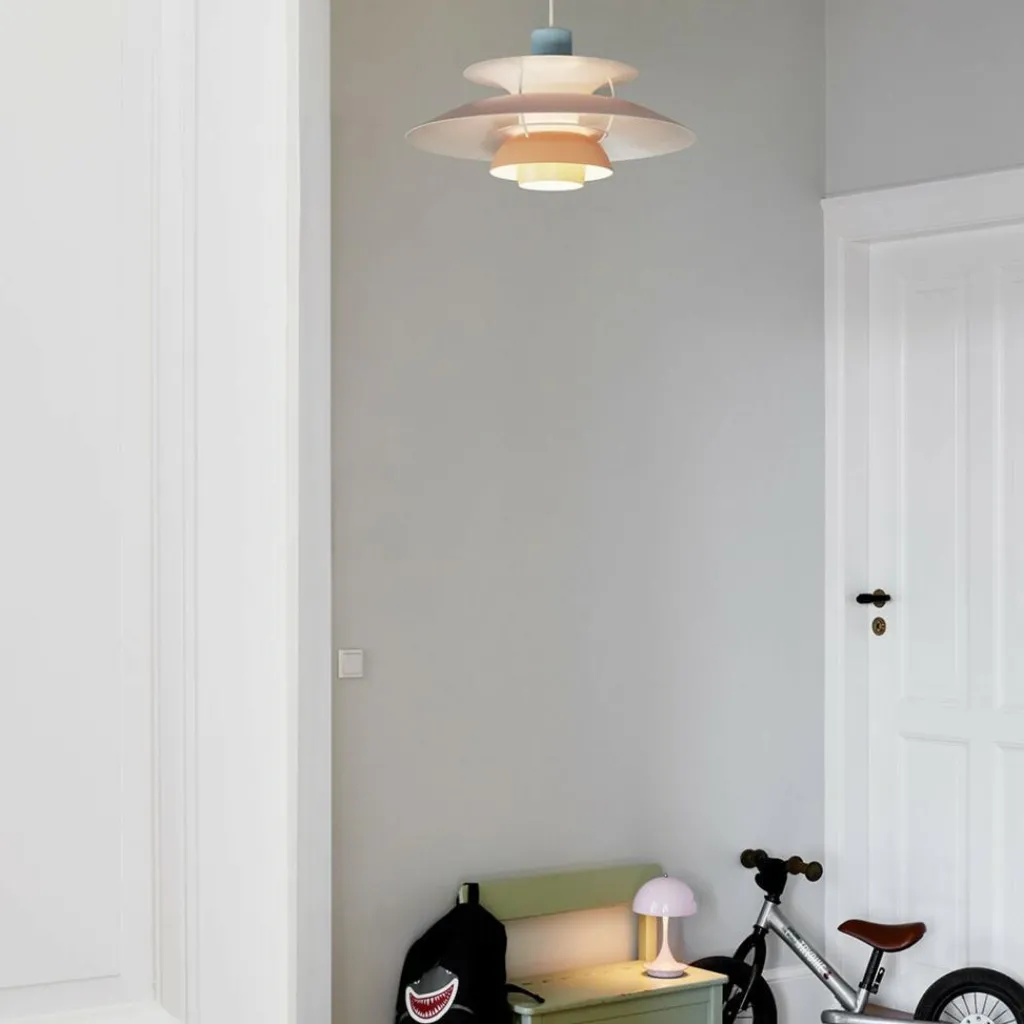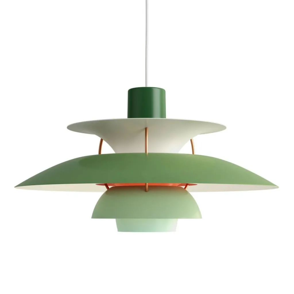 Seitdem die PH 5 Pendelleuchte im Jahr 1958 erfunden wurde, hat sie nichts an Attraktivität eingebüßt. Wie eine futuristische Skulptur schwebt das moderne Modell im Raum. Der Schirm ist vierteilig gestaltet, wobei der erste nach oben und die drei unteren nach unten geöffnet sind. Durch den unteren als Diffusor dringt blendfreies Licht in den Raum. Es wird von den drei unteren Schirmen nach unten geleitet. Der obere Schirm sorgt für eine vertikale Beleuchtung und verdeckt die Halterung. Die Schirme werden aus gezogenem Aluminium gemacht, das 0,8cm dick ist. Sie sind mit Stäben aus lackiertem, gewalztem Aluminium verbunden. Man kann die PH 5 Pendelleuchte in verschiedenen Farben bestellen. Die Fassung für das Leuchtmittel mit E27-Fassung wird aus Porzellan gemacht. Man kann ihre Position verstellen, sodass der Lichtstrahl genau ausgerichtet ist.