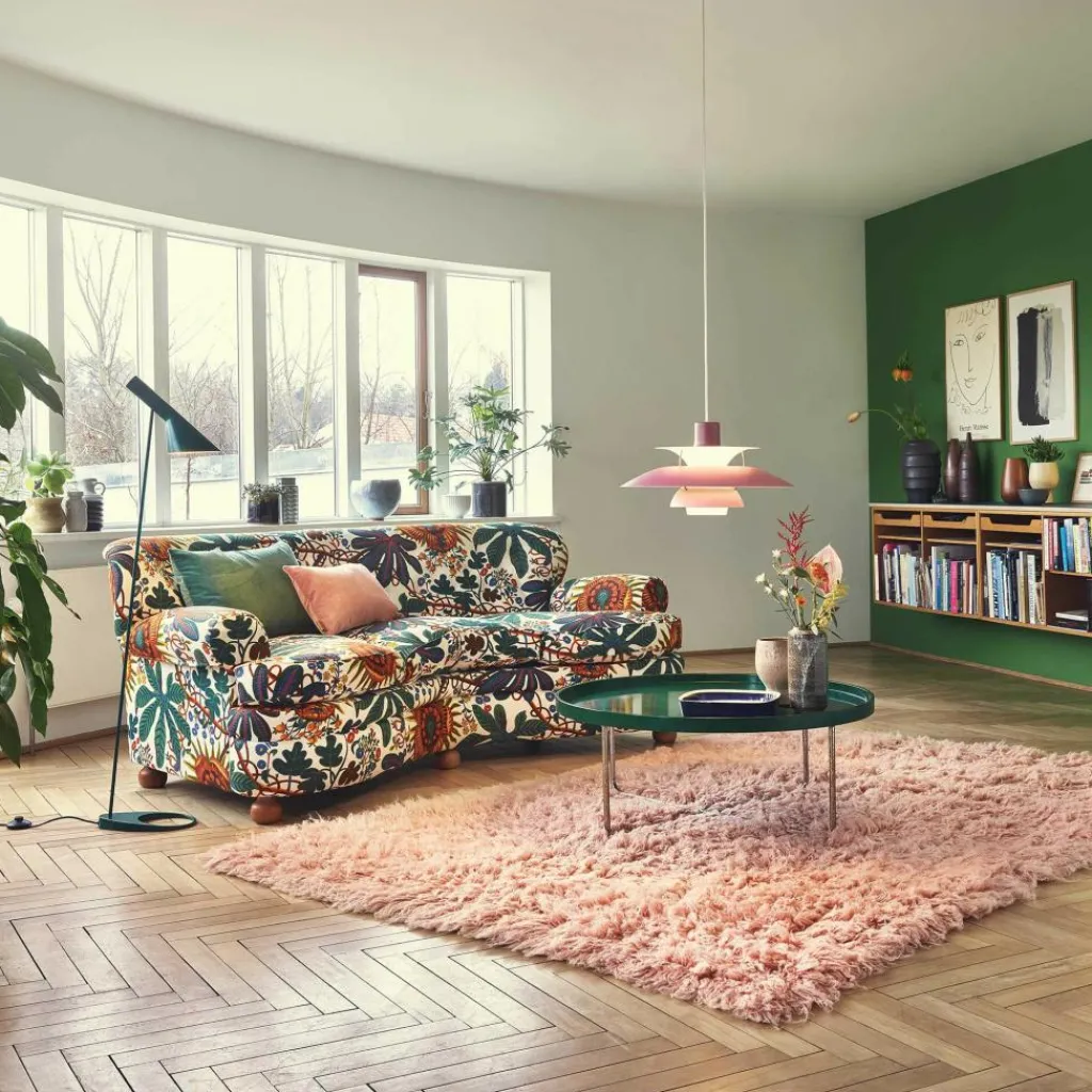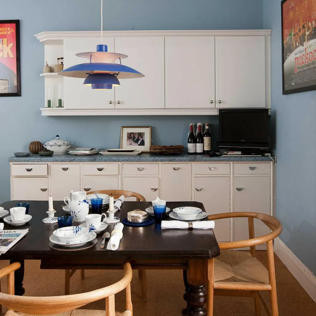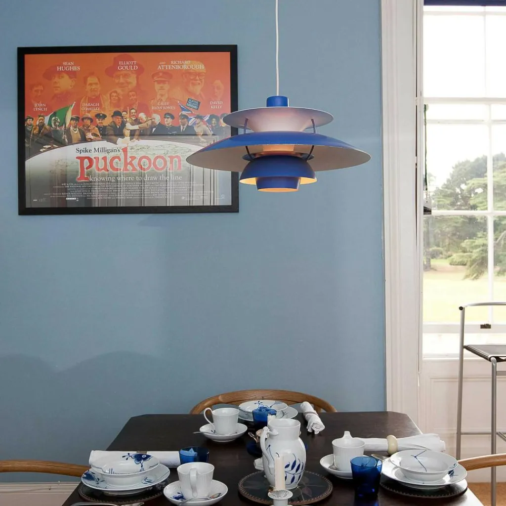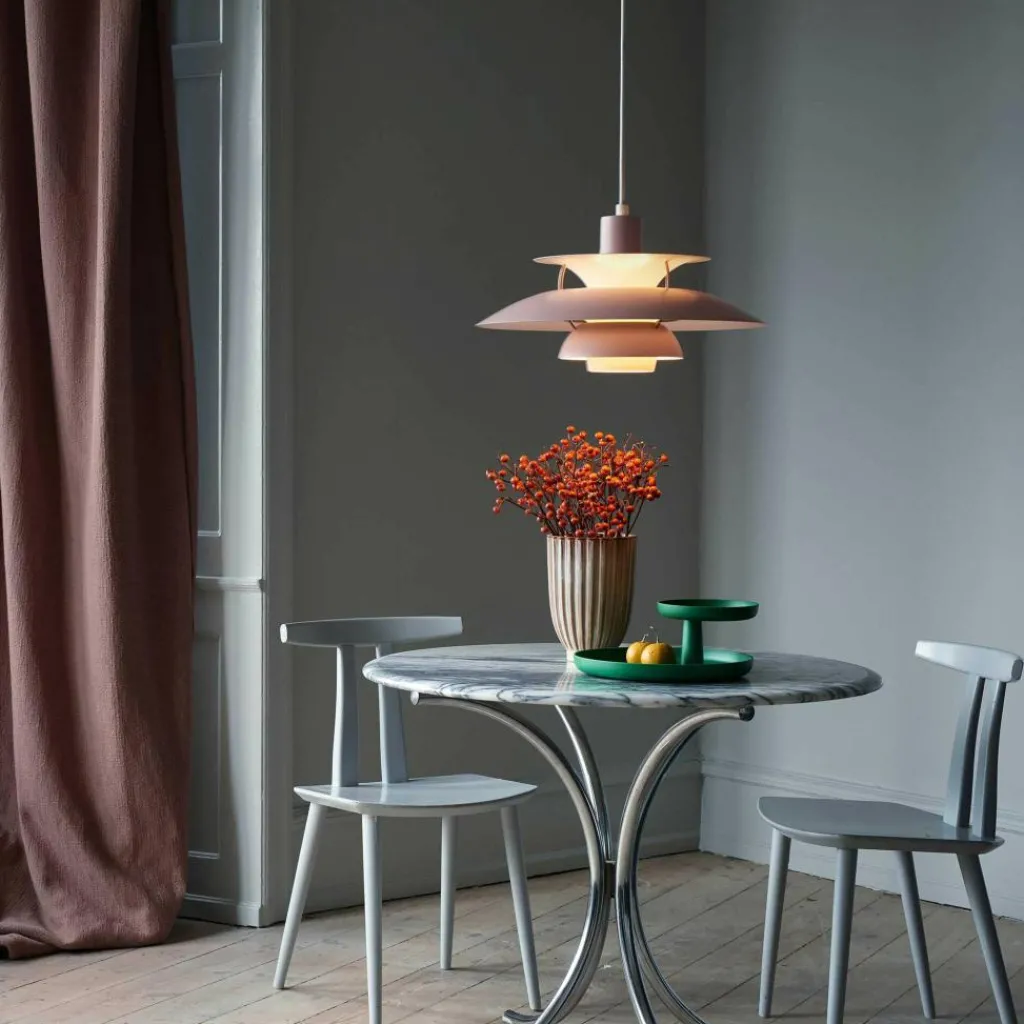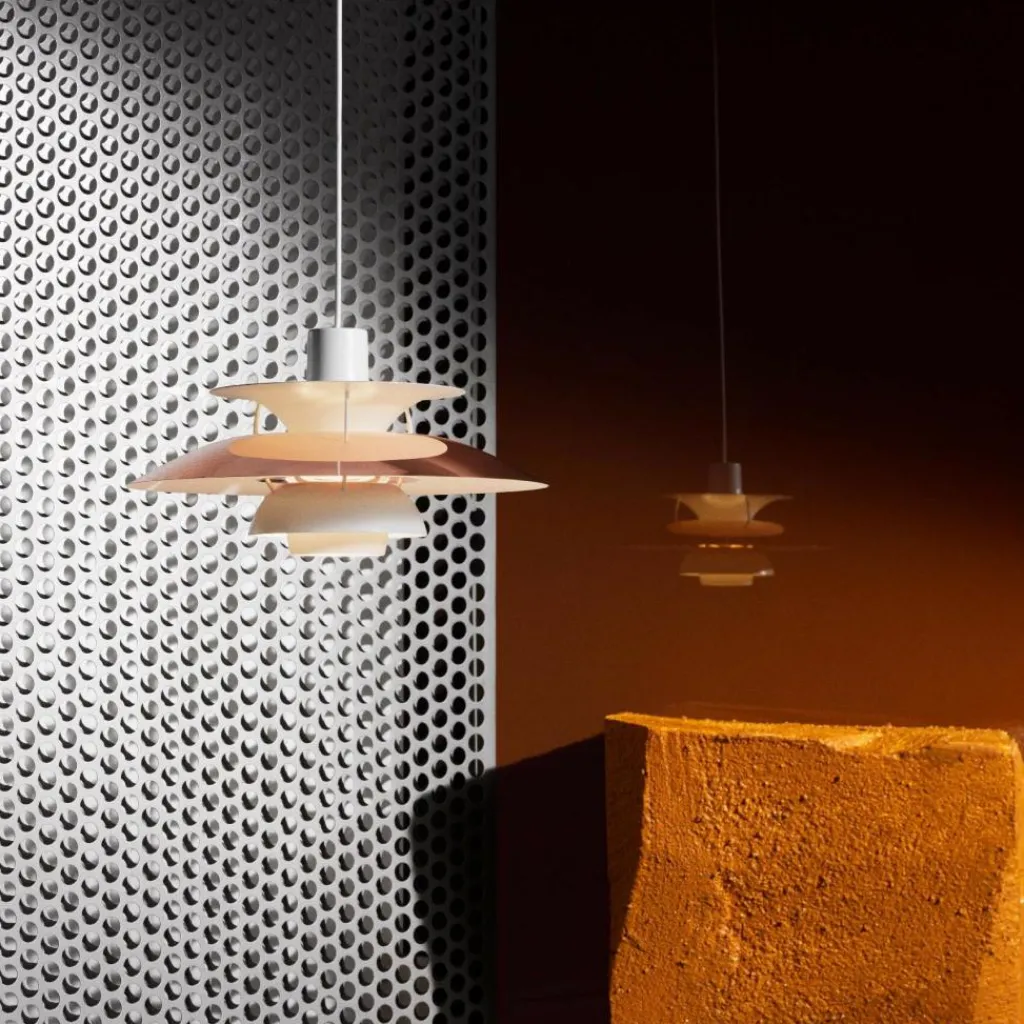 Seitdem die PH 5 Pendelleuchte im Jahr 1958 erfunden wurde, hat sie nichts an Attraktivität eingebüßt. Wie eine futuristische Skulptur schwebt das moderne Modell im Raum. Der Schirm ist vierteilig gestaltet, wobei der erste nach oben und die drei unteren nach unten geöffnet sind. Durch den unteren als Diffusor dringt blendfreies Licht in den Raum. Es wird von den drei unteren Schirmen nach unten geleitet. Der obere Schirm sorgt für eine vertikale Beleuchtung und verdeckt die Halterung. Die Schirme werden aus gezogenem Aluminium gemacht, das 0,8cm dick ist. Sie sind mit Stäben aus lackiertem, gewalztem Aluminium verbunden. Man kann die PH 5 Pendelleuchte in verschiedenen Farben bestellen. Die Fassung für das Leuchtmittel mit E27-Fassung wird aus Porzellan gemacht. Man kann ihre Position verstellen, sodass der Lichtstrahl genau ausgerichtet ist.