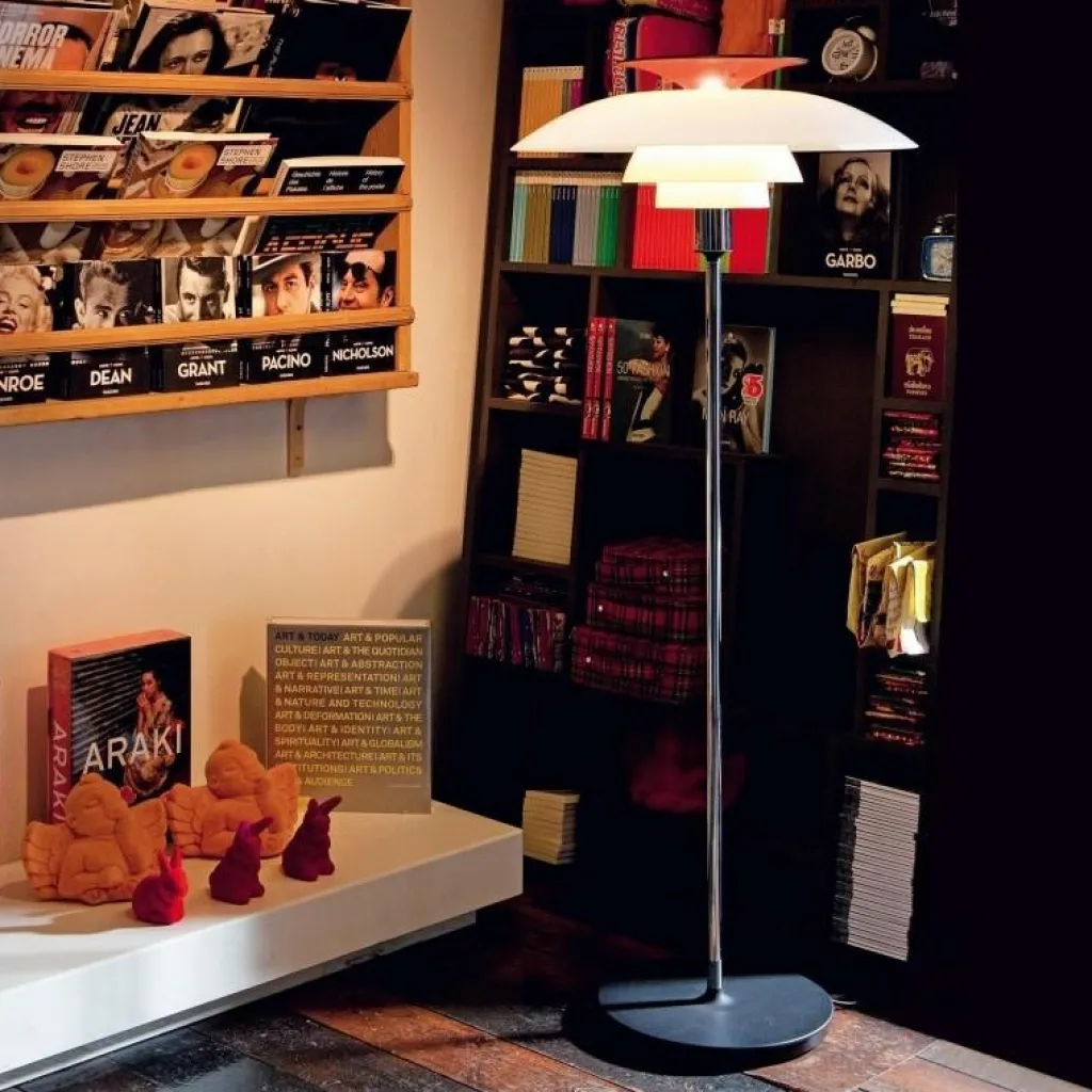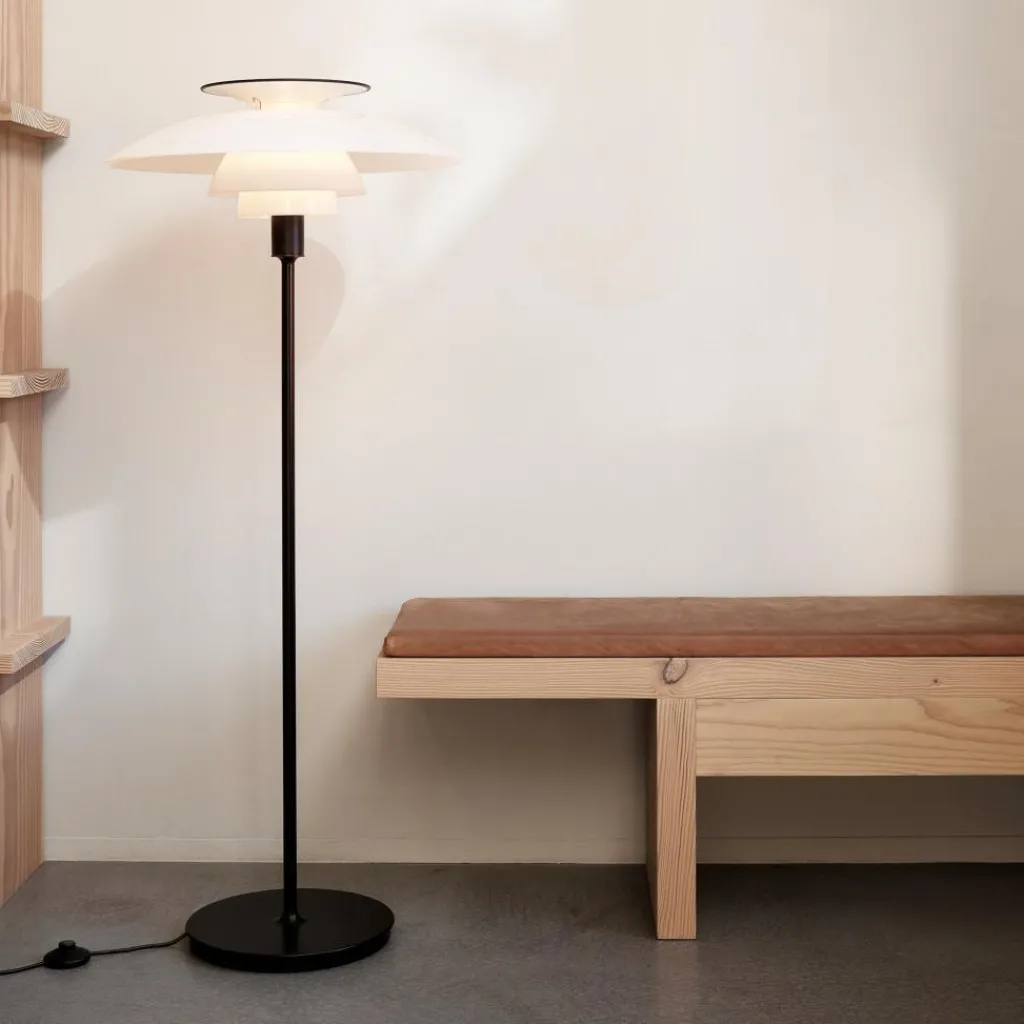 Mit ihrem schuppigen Leuchtenkopf, dem schlanken Metallstiel und der runden Basis aus pulverbeschichtetem Stahl ist die PH 80 Stehleuchte auch unbeleuchtet ein auffälliger Hingucker. Eingeschaltet ist das elegante Designstück Beleuchtungskörper und Lichtskulptur zugleich. Dank ihrer verschiedenen gebogenen Acrly-Schirme strahlt die PH 80 Stehleuchte ein angenehm diffuses und blendfreies Licht ab, das weiche Schatten wirft. Die Lichtstimmung variiert abhängig von der gewählten Ausführung. Der oberste Reflektor färbt den Lichtschein je nach Modellvariante atmosphärisch warm bis klarweiß. Der metallene Leuchtenständer steht in einem attraktiven Kontrast zu den Schirmen oder passt sich diesen harmonisch an.