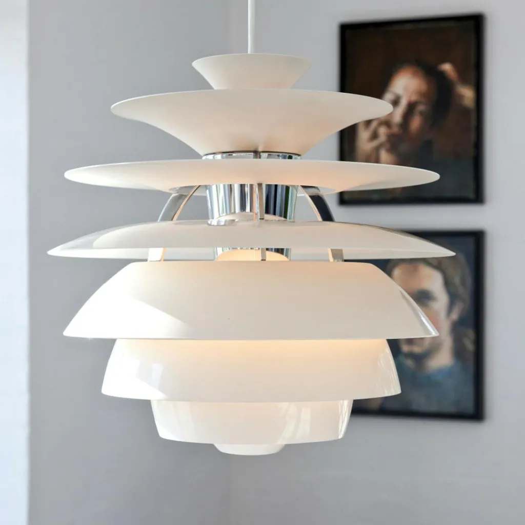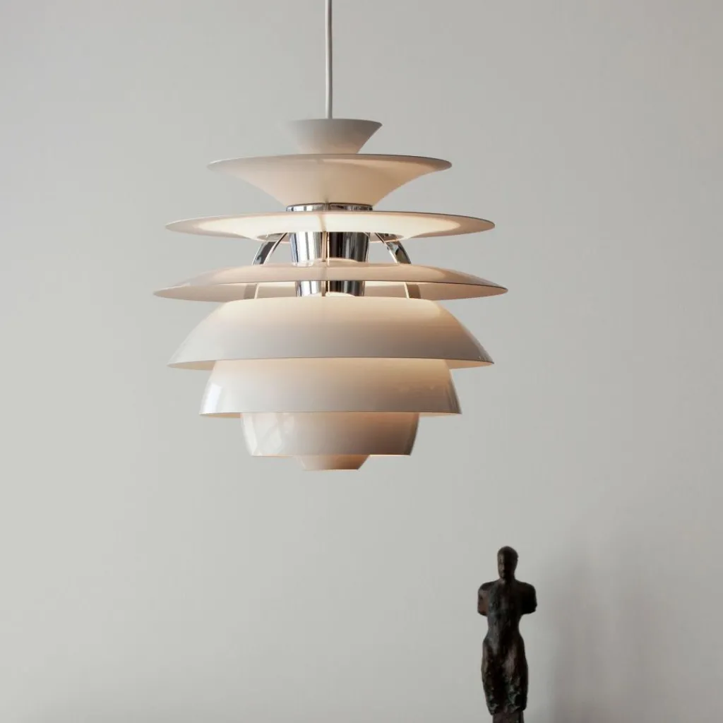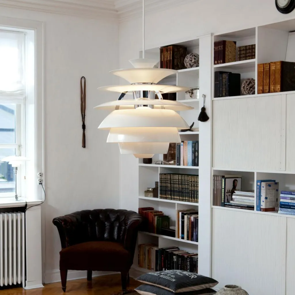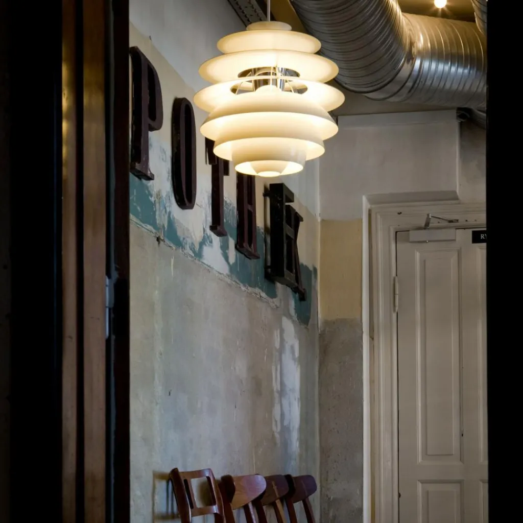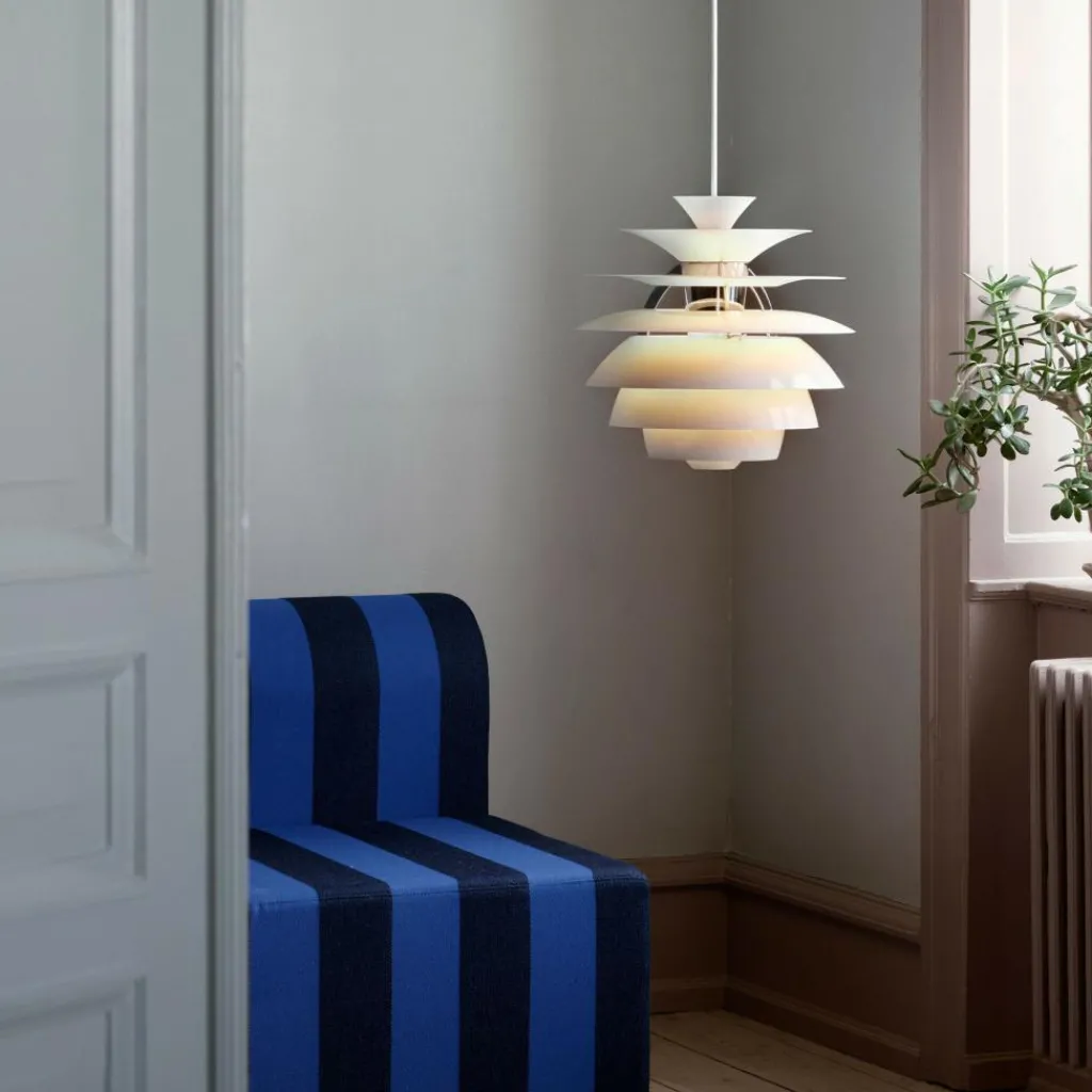 Ziel des Dreischirmsystems ist es, den größten Teil des Lichts nach unten zu leiten. Dort wird es reflektiert, wodurch auch die Leuchte selbst erstrahlt. Auch die PH Snowball Pendelleuchte nützt mehrere Schirme für die Erzeugung eines angenehm diffusen Lichtkegels und weicher Schatten. Mit ihrer kompakten Form ermöglicht die Designikone eine sphärische Lichtabstrahlung. Acht Aluminiumschirme lenken das Licht der PH Snowball Pendelleuchte. Sie sind lackiert und an der Unterseite mattiert. Dank ihrer lamellenartigen Anordnung verdecken sie die Sicht auf das Leuchtmittel vollständig. Während die unteren Lamellen einen sanften Lichtkegel nach unten werfen, ermöglichen die oberen Schirme eine vertikale Raumbeleuchtung. Damit eignet sich die PH Snowball Pendelleuchte für die Beleuchtung großer Räume. Sie passt in ein Restaurant, die Hotellobby, aber auch ins Wohnzimmer daheim.