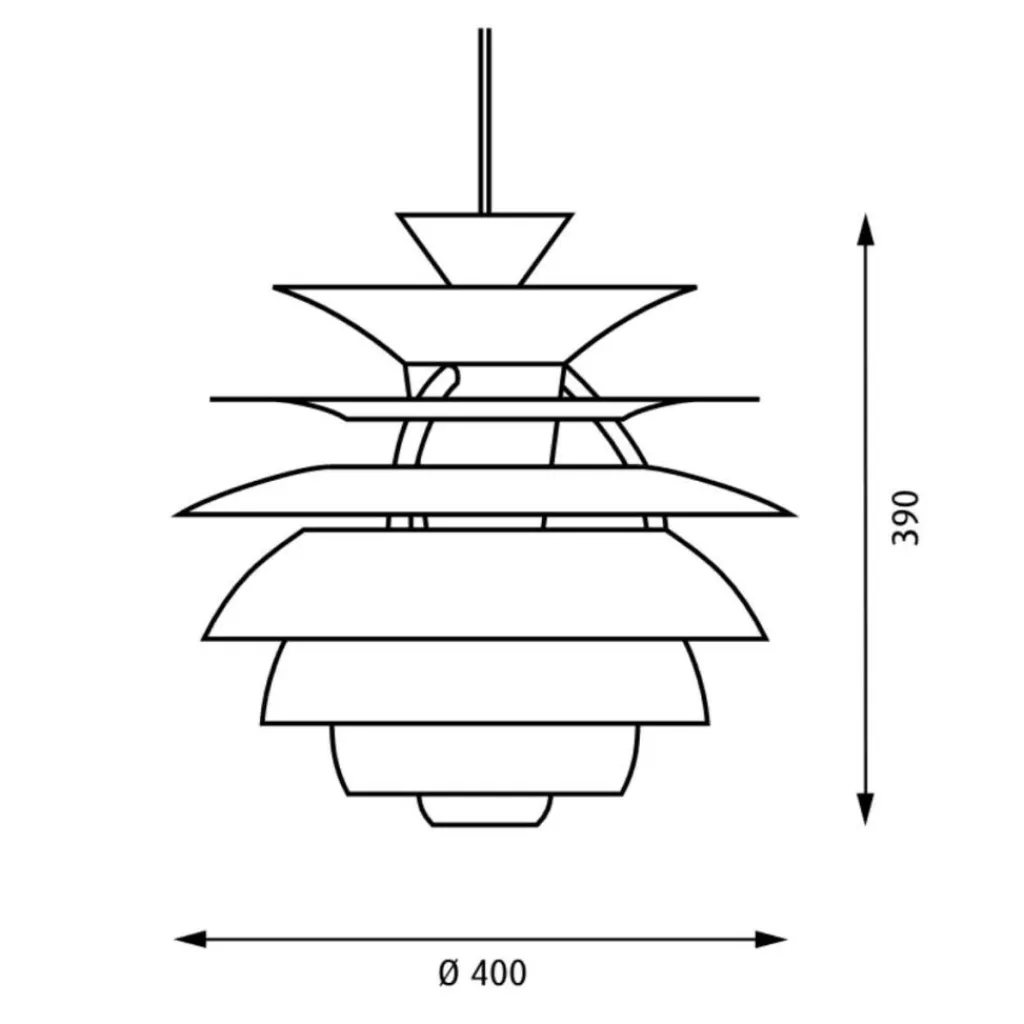 Die PH Snowball Pendelleuchte hat einen Schirmdurchmesser von 40 cm und eine Höhe von 39 cm. Ihr Kabel ist 300 cm lang. Die Designleuchte wiegt 3 kg. Sie benötigt ein Leuchtmittel mit E27-Fassung.