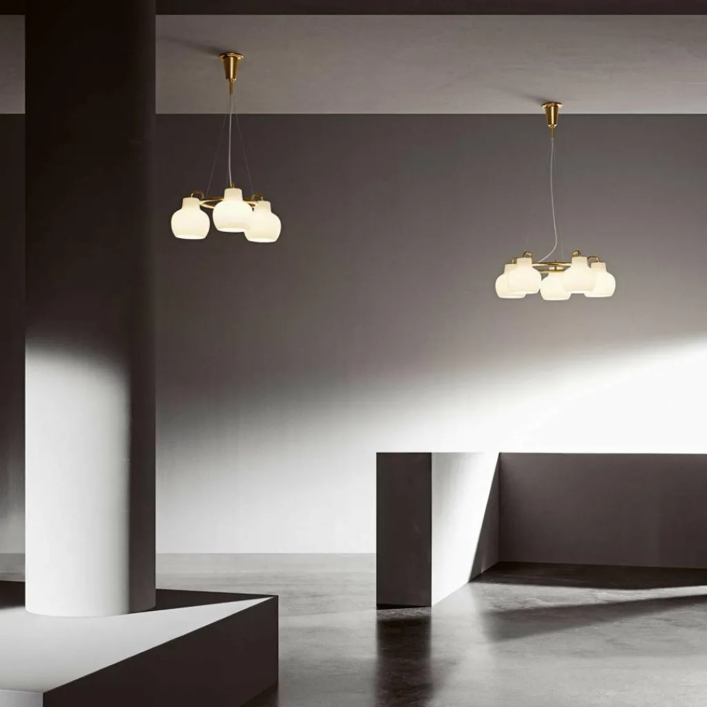 Sowohl in klassischen Interieurs als auch als Bestandteil eines eklektischen Konzeptes schafft es die aus Messing und mundgeblasenem Opalglas gefertigte Pendelleuchte, die Blicke auf sich zu ziehen und ein deutliches Statement für zeitloses und unvergängliches Design zu setzen. Mit einem Durchmesser von 69 cm und einer Höhe von 23,3 cm macht sich diese Leuchte optimal unter hohen Decken.