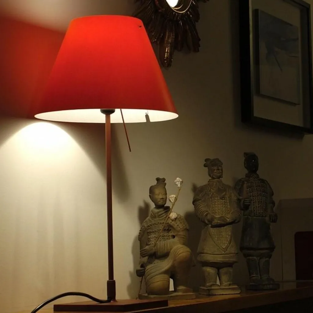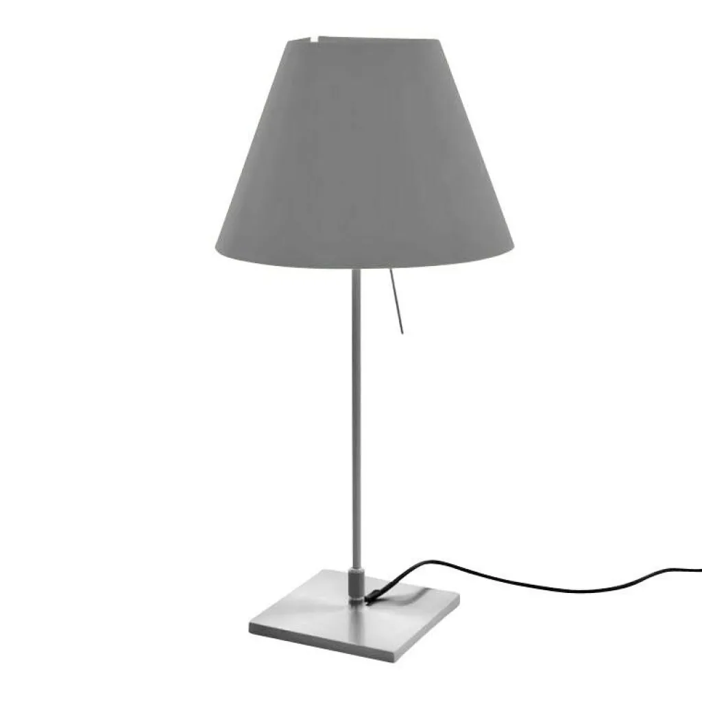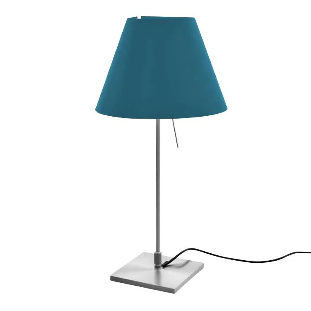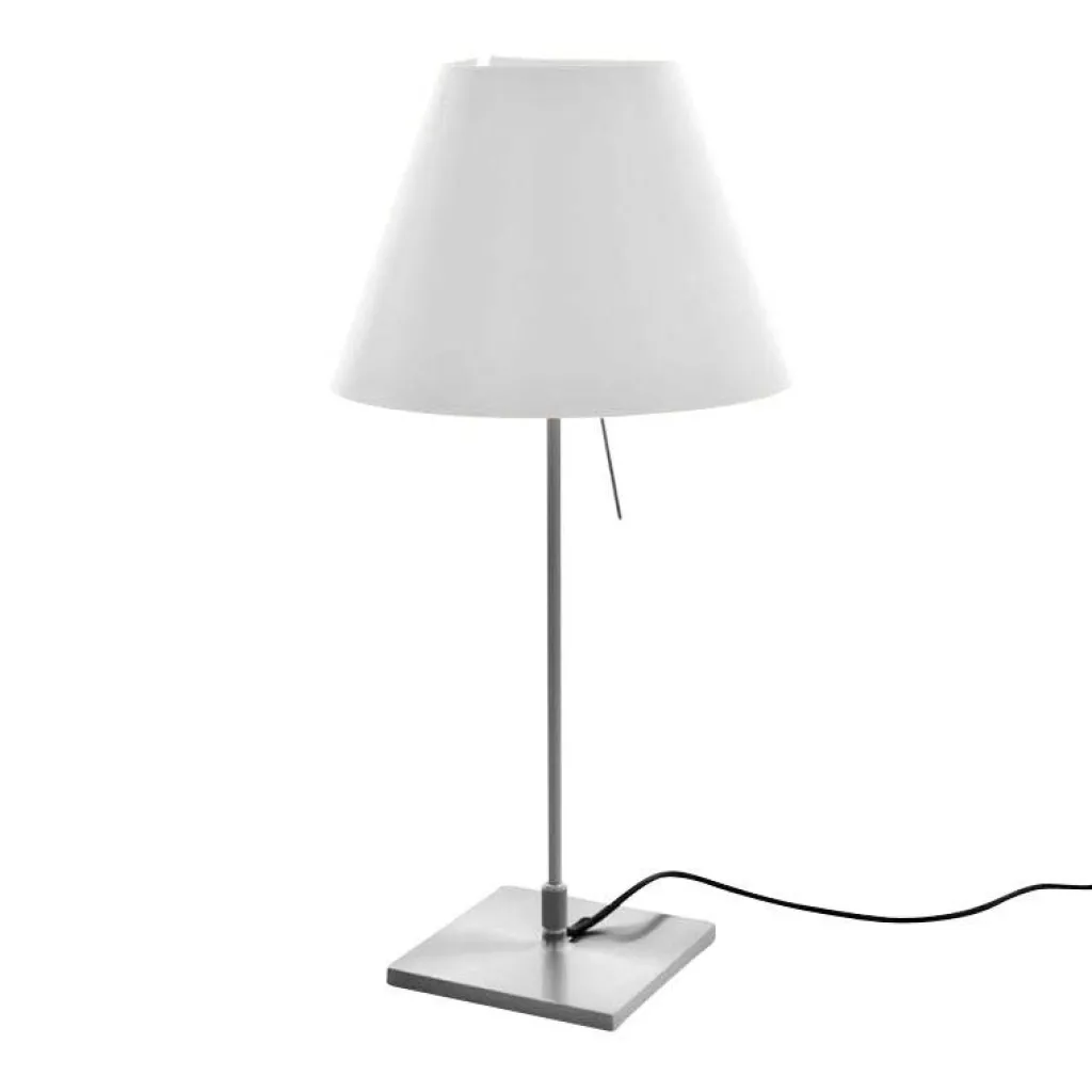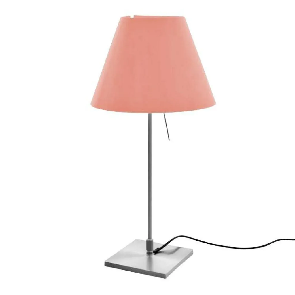 Die Costanzina Tavolo Tischleuchte mit Fuß bedient sich einer ausgeklügelten Konstruktion. Der austauschbare Leuchtenschirm ist nur an zwei Punkten mit dem Gestell verbunden. Stößt man daran, fängt er an zu pendeln und bringt sich selbst wieder ins Lot. Für den Leuchtenschirm verwendet der Designer leichtes Polycarbonat. Das Gestell wird aus Aluminium gemacht. Es besteht aus einem quadratischen Sockel und einem dünnen Stab. Der Schalter befindet sich am konischen Leuchtenschirm. Wird er betätigt, dringt sanftes Licht durch den Schirm. Unten tritt es direkt aus. Man kann die Costanzina Tavolo Tischleuchte mit Fuß in einer beachtlichen Farbenvielfalt bestellen.