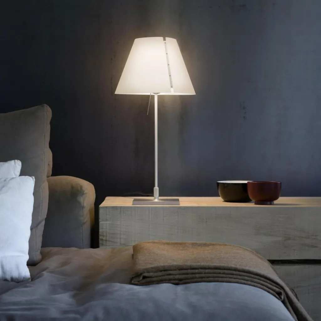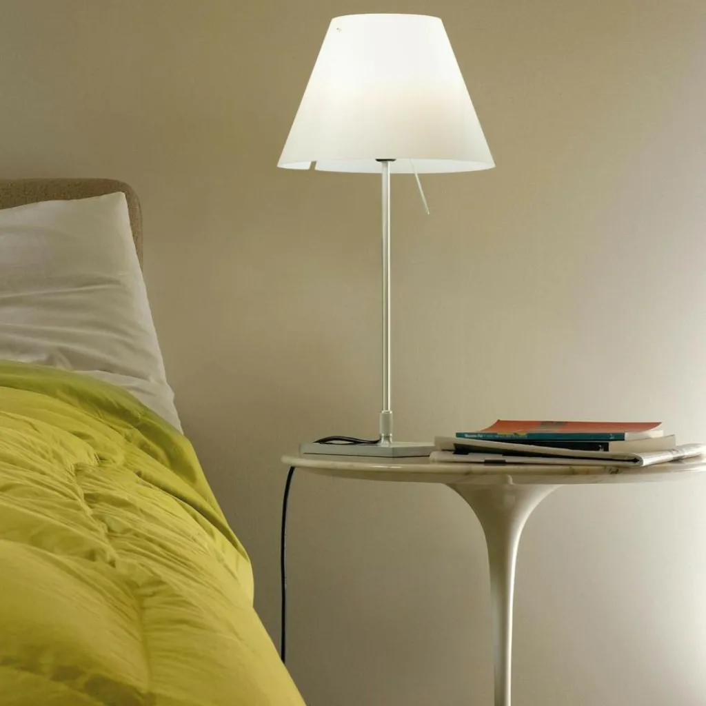 Die Costanzina Tavolo Tischleuchte mit Fuß wurde von Paolo Rizzatto für die Marke Luceplan entworfen. Das im Jahr 1992 vorgestellte Modell sorgt für ideale Lichtverhältnisse auf jedem Arbeitsplatz im Büro oder zu Hause. Auch Regale und Nachttische im Schlafzimmer sind beliebte Einsatzorte.