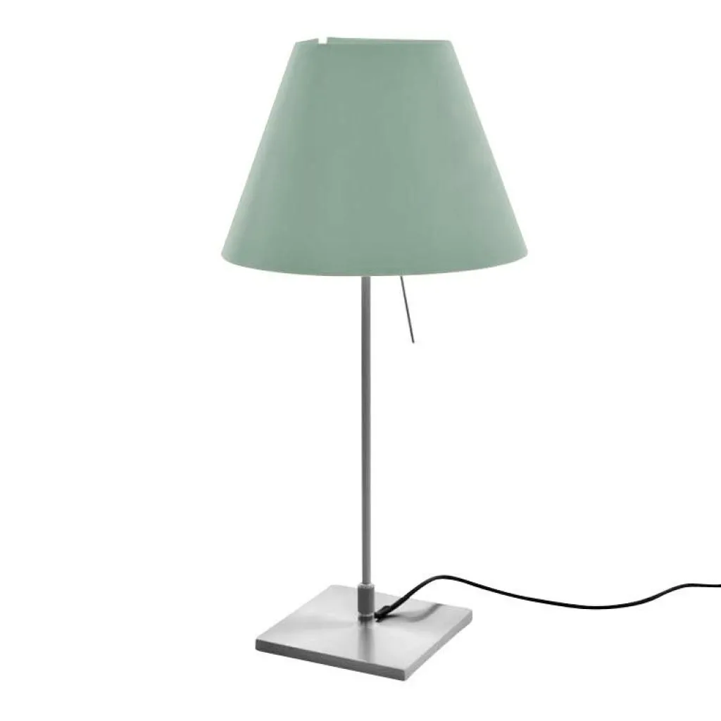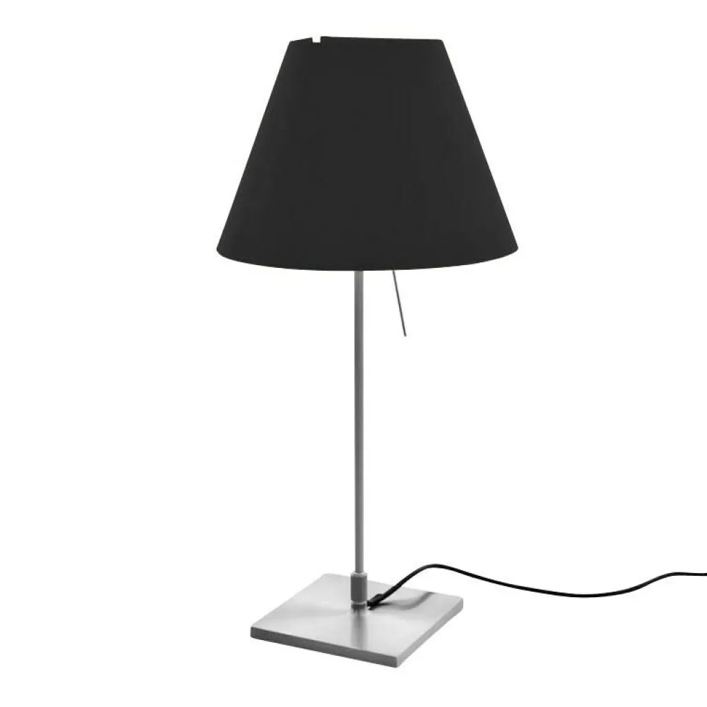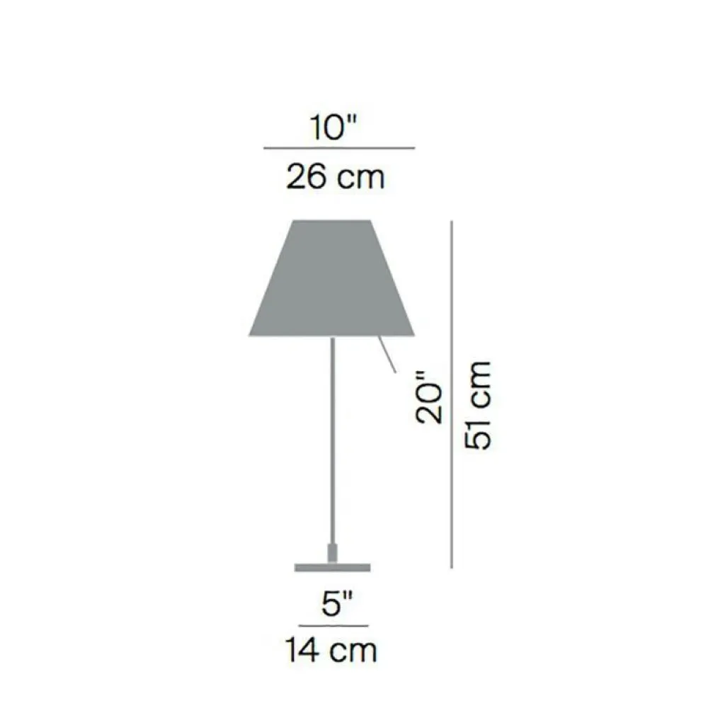 Ein 160 cm langes Kabel verbindet die Costanzina Tavolo Tischleuchte mit Fuß mit dem Stromkreis. Das Modell hat eine Höhe von 51 cm. Der Schirm hat einen Durchmesser von 26 cm. Die Leuchte wiegt 1,4 kg. Die Seitenlänge des Sockels beträgt 14 cm. Die Costanzina Tavolo Tischleuchte mit Fuß braucht ein Leuchtmittel mit E14-Fassung.