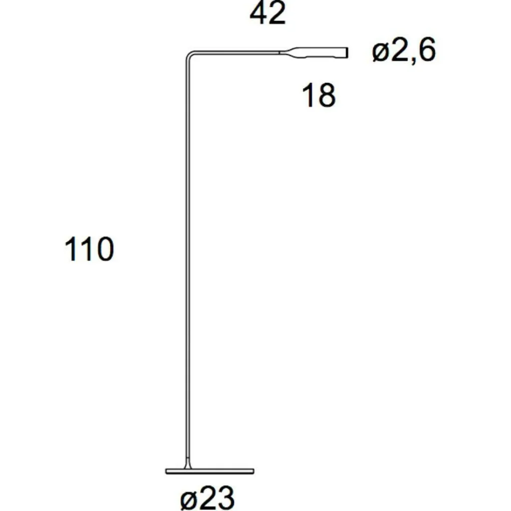 Die Flo Floor LED Stehleuchte hat eine Höhe von 110 cm. Die Breite beträgt 42 cm. Der Kopf hat einen Durchmesser von 2,6 cm. Der Durchmesser des Fußes beträgt 23 cm.