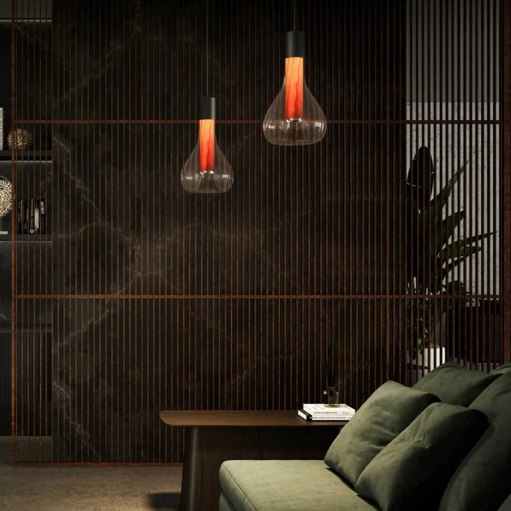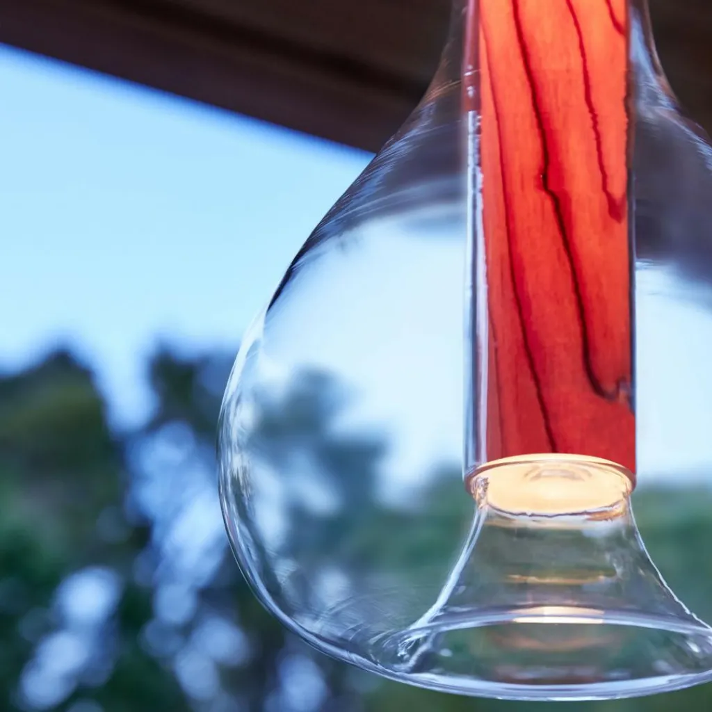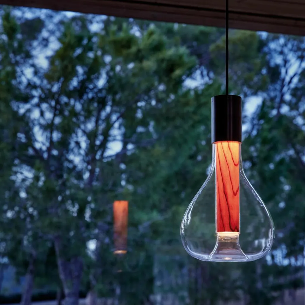Eine außergewöhnliche Kombination aus Holz, Metall und Glas macht die Eris Pendelleuchte zum Blickfang. Die Aufhängung in Form eines Zylinders geht direkt in feines Holzfurnier über. Das FSC®-Siegel attestiert dem Material, dass es aus nachhaltiger Forstwirtschaft stammt. Daran schließt ein bauchiger Schirm aus mundgeblasenem Glas an. Es wölbt sich nach unten und ist nach innen hin wie ein Zylinder geformt. So scheint es, als ob ein fließender Übergang zwischen Glas und Holz besteht. Die Eris Pendelleuchte wird durch ihr extravagantes Design zum Kultobjekt und harmoniert mit jedem Einrichtungsstil.