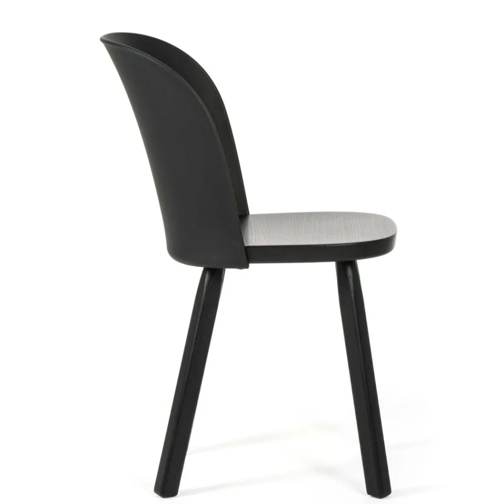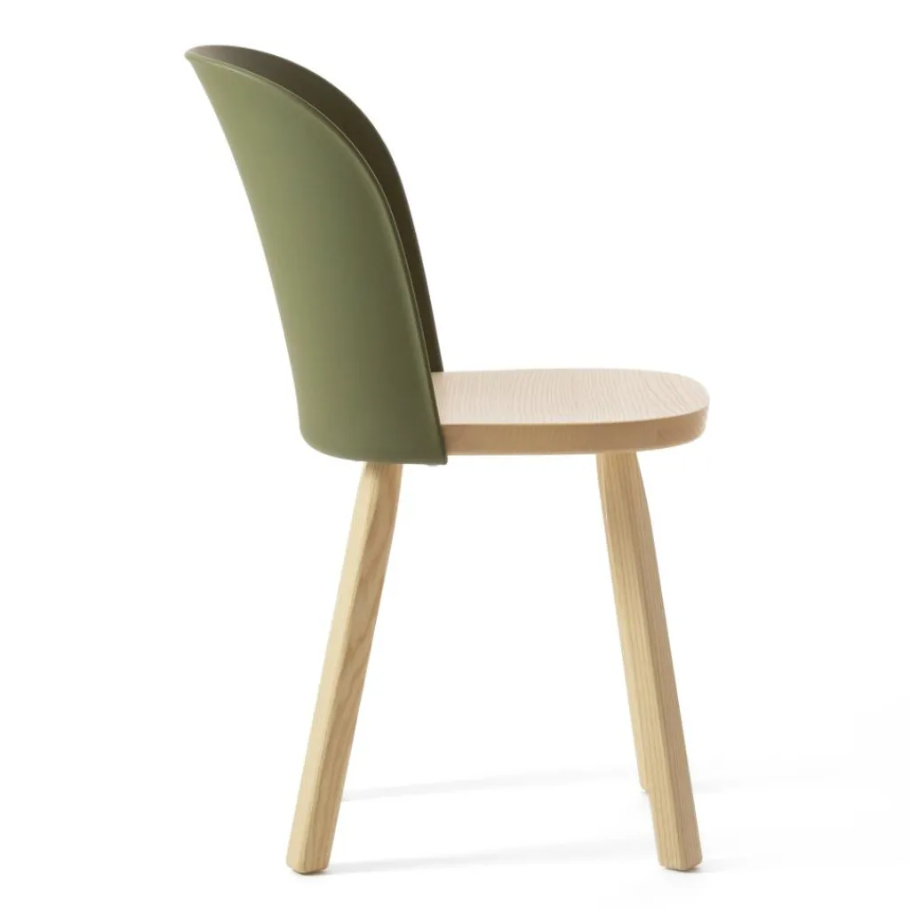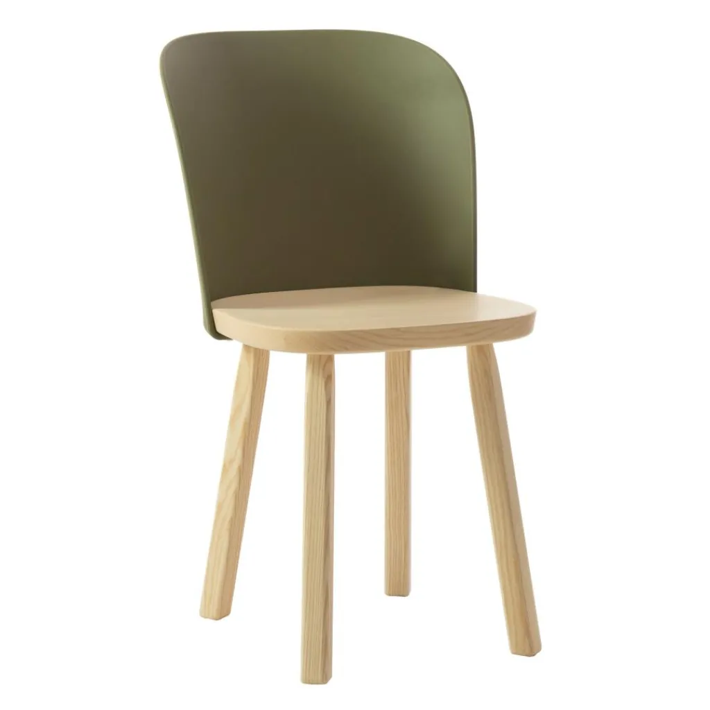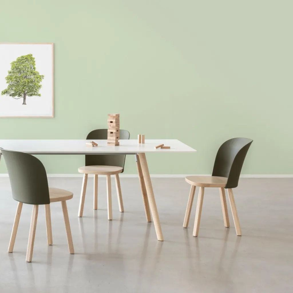 Hergestellt aus FSC®-zertifiziertem Eschenholz sowie aus einem Biokunststoff, der sich vollständig aus Altspeiseöl und organischen Abfällen zusammensetzt, ist auch der Alpina Stuhl zu 100% recycelbar. Darüber hinaus besticht das innovative Möbel durch seine langlebige Robustheit und ein formschönes Design. Die aus Bio-Polypropylen spritzgegossene Lehne ist dank ihrer ergonomischen Wölbung sanft an den Rücken angepasst. Ihre stark gebogene Kante schenkt dem Stuhl eine weiche Optik. Einen festen Sitz verspricht die dicke massive Holzfläche. Für eine hohe Standfestigkeit sorgen die ausgestellten Beine aus abgerundetem Kantholz. Je nach gewählter Ausführung zeigen die Holzteile des Alpina Stuhls eine mehr oder weniger fein gezeichnete Maserung, die dem Raum einen natürlichen Touch verleiht. Damit passt der zurückhaltende Designstuhl an den Küchentisch, rund um den Esstisch, in den Vorraum oder ins Homeoffice und eignet sich ebenso als Bestuhlung für eine Kantine.