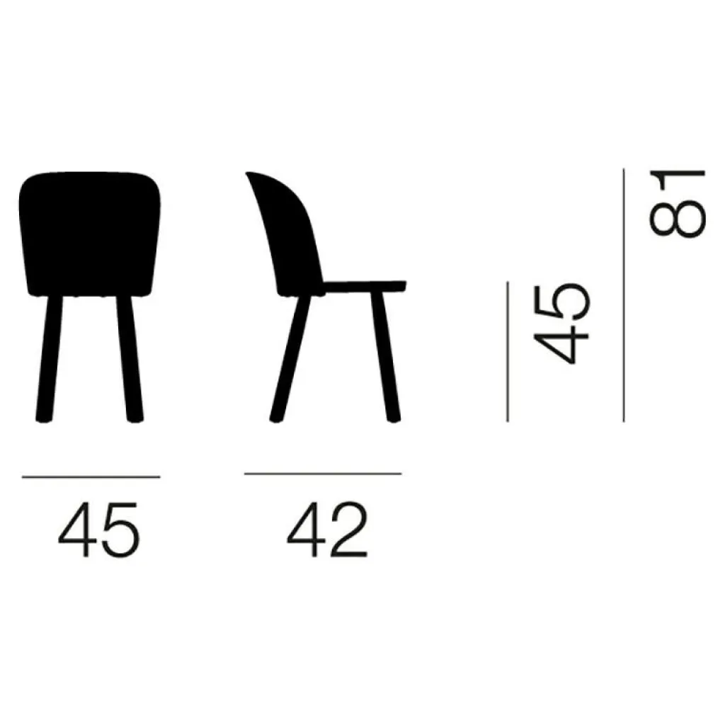 Der Alpina Stuhl ist 45cm breit und 42cm tief. Er ist 81cm hoch. Seine Sitzhöhe ist 45cm. Der Designstuhl ist in mehreren Farbkombinationen erhältlich. Passend dazu stehen verschiedene Sitzkissen aus Filz zur Auswahl.