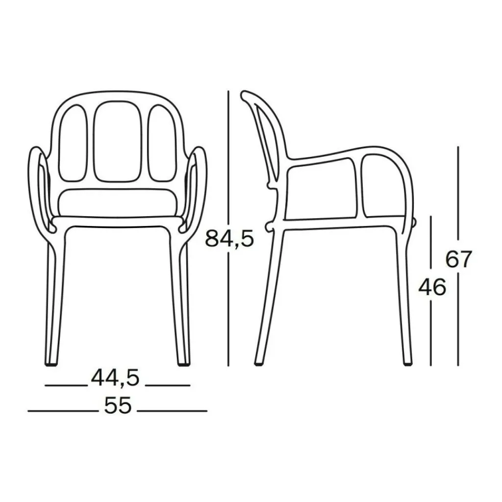 Möchten Sie Ihren nagelneu bepflanzten Garten mit einem echten Hingucker aus dem Hause Magis verschönern? Mit dem Milà Outdoor Armlehnstuhl erhalten Sie ein robustes Designerstück aus Polypropylen, das sich ideal und formvollendet in Ihren Außenbereich einfügt und Sie können mit ruhigem Gewissen Ihre willkommenen Besucher und ausgesuchten Gäste empfangen. Geschickterweise sind die langlebigen Stühle stapelbar und somit ist eine zufriedenstellende Lagerung des exquisiten Luxusproduktes jederzeit gewährleistet. Der Armlehnstuhl verfügt über eine Breite von 55 cm, eine Höhe von 84,5 cm und die Sitzhöhe beträgt 46 cm. Die Armlehne hat eine Höhe von 67 cm.