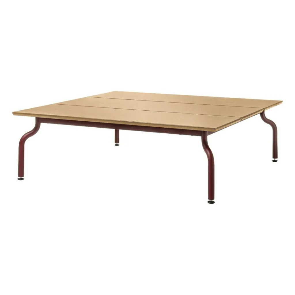 Gefertigt aus robustem Stahlrohr verfügt das Gestell dieses Gartentisches über eine hochwertige Tauchlack- sowie Pulverbeschichtung aus Polyester. Dadurch zeichnet sich der South Gartentisch niedrig 120x120cm Teak durch eine witterungsbeständige Langlebigkeit aus. Gleichzeitig garantieren die nach außen geschwungenen Beine mit den einzeln verdrehbaren Stellfüßen auch auf unebenen Böden eine gute Stabilität. Seinen edlen Touch verdankt das attraktive Outdoormöbel der Tischplatte, die aus edlem Teakholz gefertigt ist und dank der zurückspringenden Kanten besonders schlank wirkt. Eine geradlinige Dreiteilung der Holzplatte schenkt der Tischoberfläche eine regelmäßige Rhythmik. Die zarte Maserung setzt hingegen eine natürliche Note. Damit ist der South Gartentisch niedrig 120x120cm Teak ein reizvoller Hingucker, der sich gut in einer schicken Atriumbar, auf der Terrasse eines Designhotels und auch im Wintergarten daheim macht.
