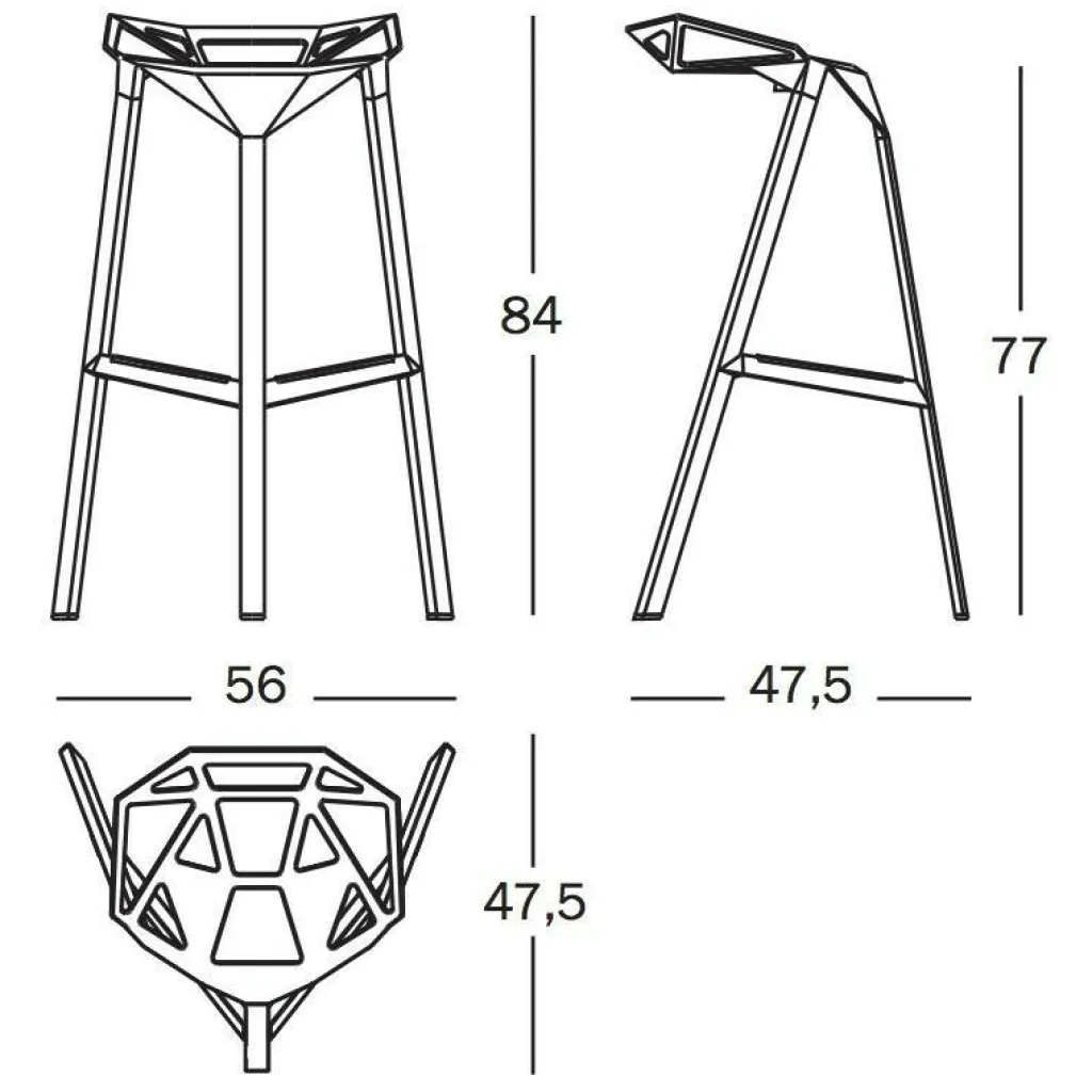 Der Stool-One-Hocker ist 53,5 cm breit und 46 cm tief. Er hat eine Gesamthöhe von 74 cm und eine Sitzhöhe von 67 cm. Der Barhocker ist stapelbar und in verschiedenfarbigen Ausführungen erhältlich.