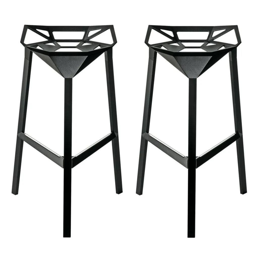 Das Entwurfskonzept des Hockers lässt die Handschrift eines Industriedesigners erkennen. Die Konstruktion besteht aus Profilaluminium und kommt mit drei weit ausgestellten Beinen aus, die gleich einem Stativ einen stabilen Stand garantieren. Auf halber Höhe verbindet je eine Strebe, die auch als Fußstütze dient, die vordere Stütze mit den beiden hinteren. Markantes Merkmal des Hockers ist aber die nach hinten auskragende Sitzschale, die aus mehreren Dreiecksrahmen besteht. Diese flächigen Formen sind dreidimensional zusammengesetzt, sodass die Schale nach vorne hin leicht abfällt und hinten eine Rückenlehne andeutet. Der stylishe Barhocker passt nicht nur in der Gruppe an den Lokaltresen, sondern ist als Bar Stool One Hocker H 74cm 2er Set auch perfekt für die private Hausbar.