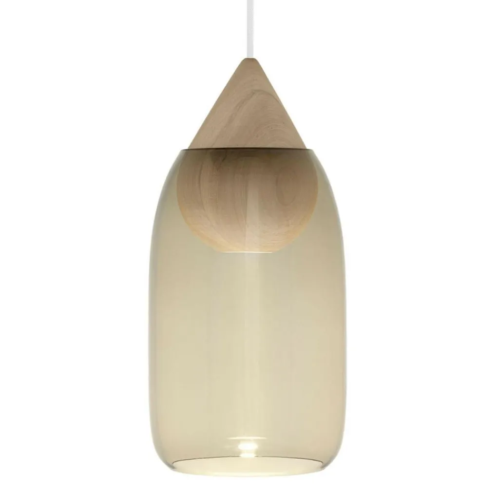 Die Liuku Drop Pendelleuchte setzt sich aus zwei Teilen zusammen. Es besteht die Möglichkeit, einen mundgeblasenen Glasschirm über den Tropfen aus Holz zu stülpen. Dadurch entsteht ein neuer Lichteffekt. Die zylinderartigen Glasschirme, die in verschiedenen Farben verfügbar sind, dämpfen das Licht und geben es gebündelt nach unten ab.