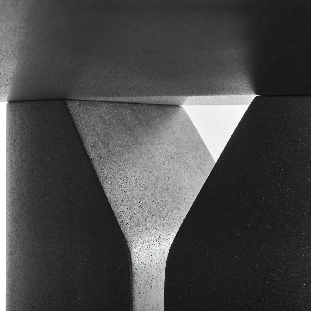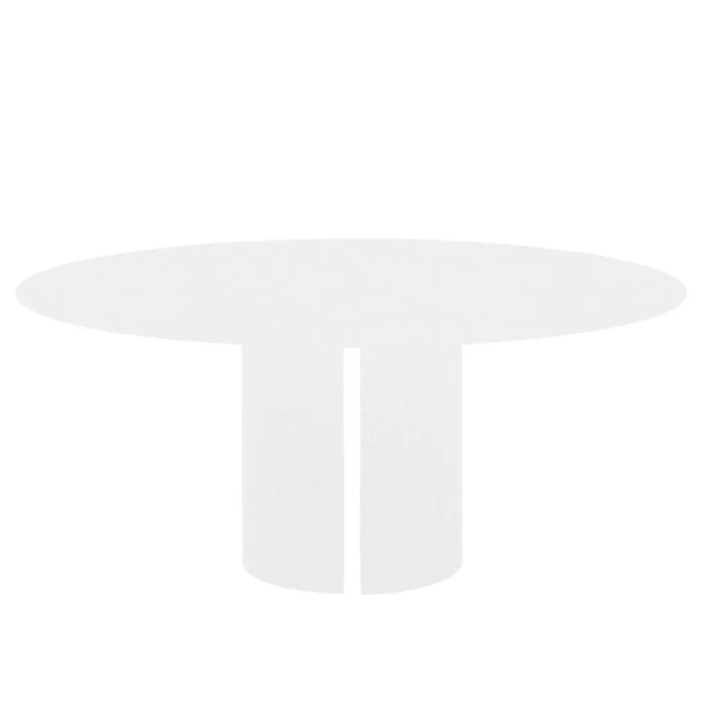 Das Faible des Franzosen für strenge geometrische Formen kommt auch beim NVL Esstisch rund Ø180cm zum Vorschein. Die beiden einander zugewandten halbrunden Füße sind mit einigen Zentimetern Abstand voneinander mit der Tischplatte verbunden. An der oberen Kante verjüngen sich die Füße, sodass ein V-förmiger Spalt entsteht. Scheinbar mühelos schwebt die Tischplatte auf dem robusten Sockel. Das Obermaterial des Tisches besteht aus robustem Hartpolyurethan. Das Innengewicht aus Gusseisen sorgt für sicheren Stand.