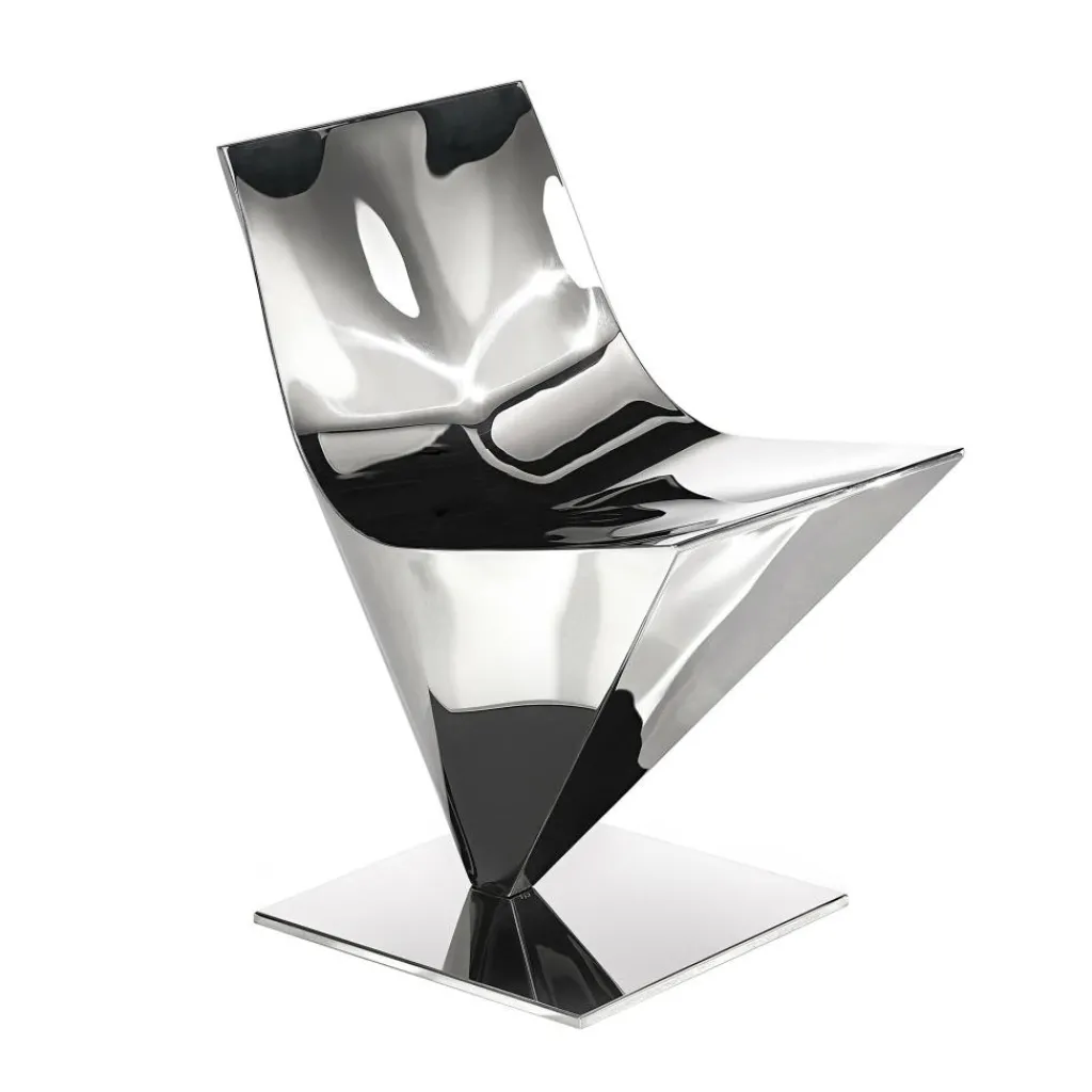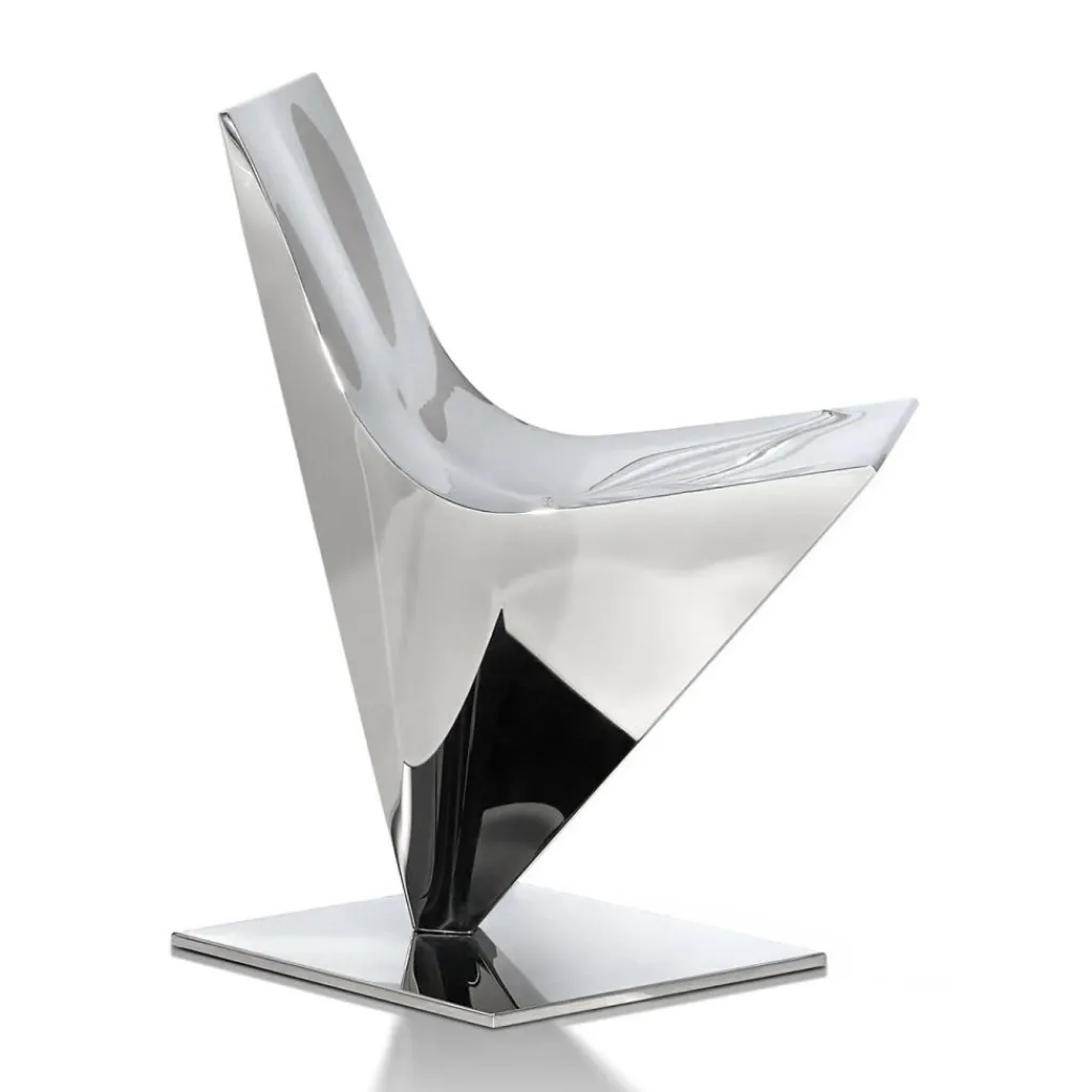 Der hochglänzende Special Edition Lofty Stuhl ist komplett aus rostfreiem und handpoliertem Edelstahl gefertigt. Er misst 51cm Breite, 56cm Tiefe und 74cm Höhe und wiegt 35kg. Zur Kollektion The Principle of Lightness gehören weitere Special Editions von Klassikern wie ein Standregal und ein Esstisch in Ausführungen aus Aluminium.
