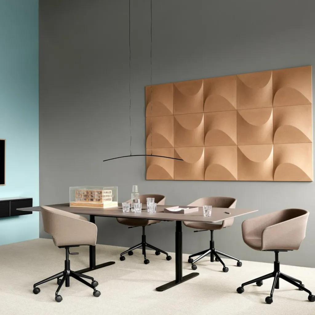 Die gewellte Struktur, die über die Armlehnen und Sitzfläche sowie die Lehne verläuft, hat nicht nur einen ästhetischen Reiz. Sie gibt der Sitzschale dieses Drehstuhls eine hohe strukturelle Festigkeit und erfüllt damit eine konstruktive Funktion. Die drehbare und formschön geschwungene Kunststoffschale mit einer großen Aussparung hinten verspricht einen komfortablen Sitz, der sich dank seines recycelten Ausgangsmaterials als nachhaltige Wahl auszeichnet. Eine fünffüßige Aluminiumkonstruktion mit Rollen sorgt für einen stabilen Unterbau. Der Marée 406 Bürodrehstuhl mit Rollen eignet sich für den Arbeitsplatz im Büro und das Homeoffice.